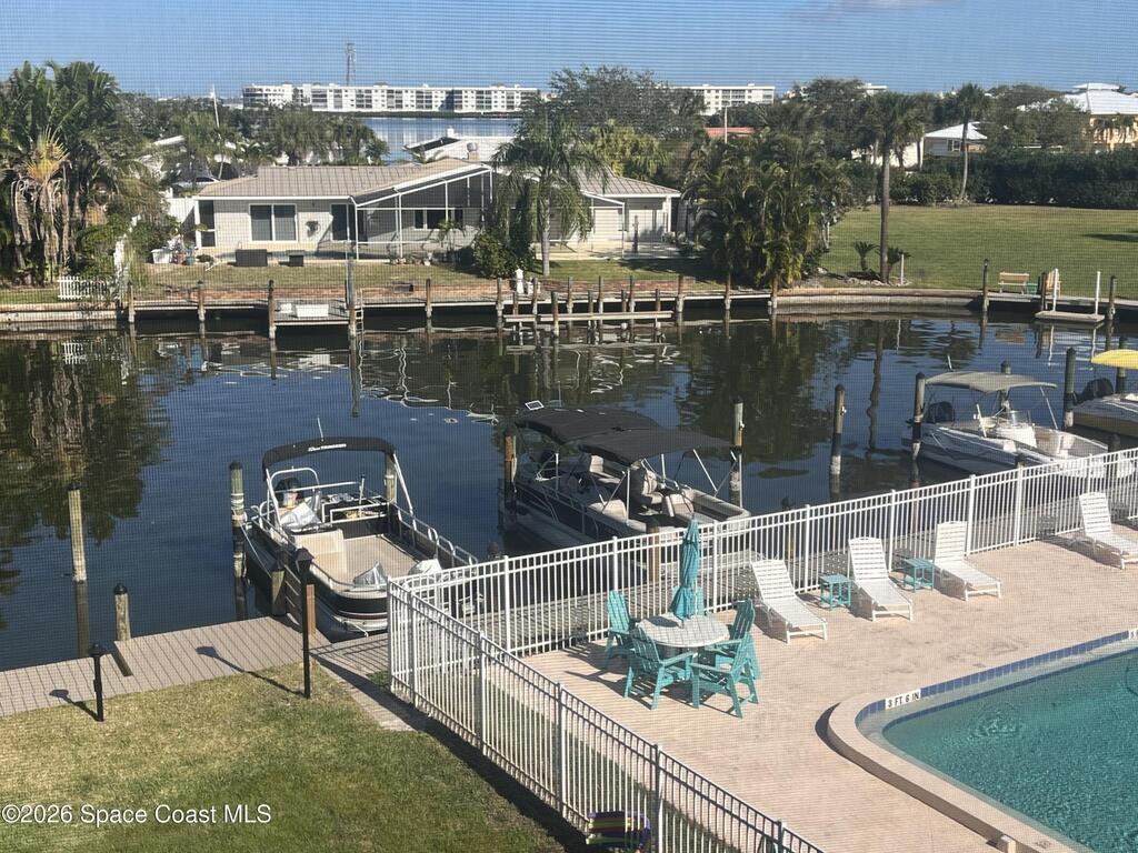 Great Central Cocoa Beach location- a block to shopping area -two blocks to the ocean- this3 bedroom top story unit overlooks the Banana River canal- with private boat slips/boat docks. - the unit includes private garage-screened large balcony - and complex includes large heated pool - club house - storage areafor kayaks -ample parking.