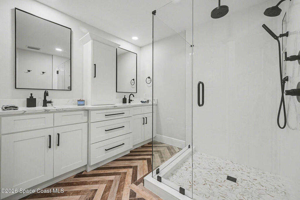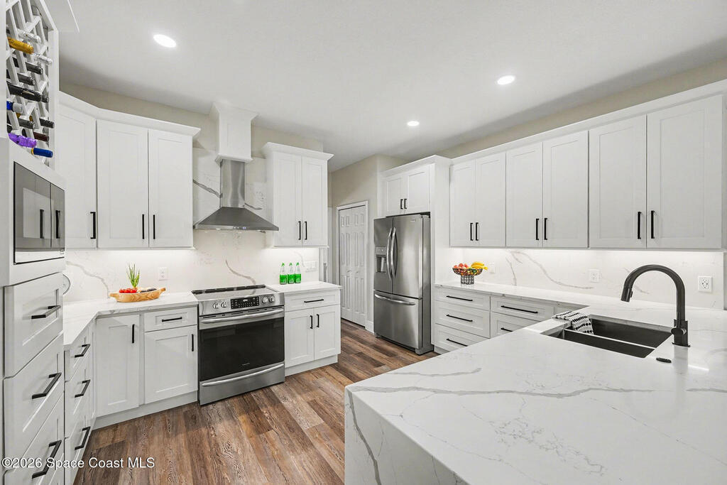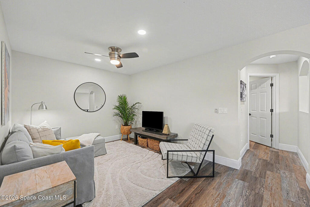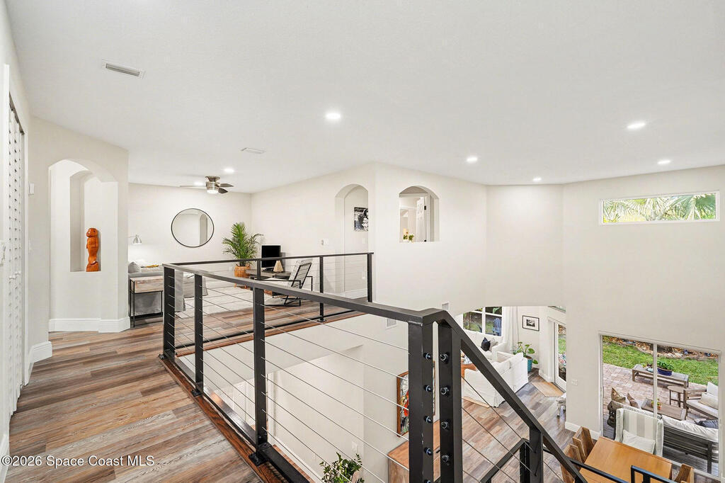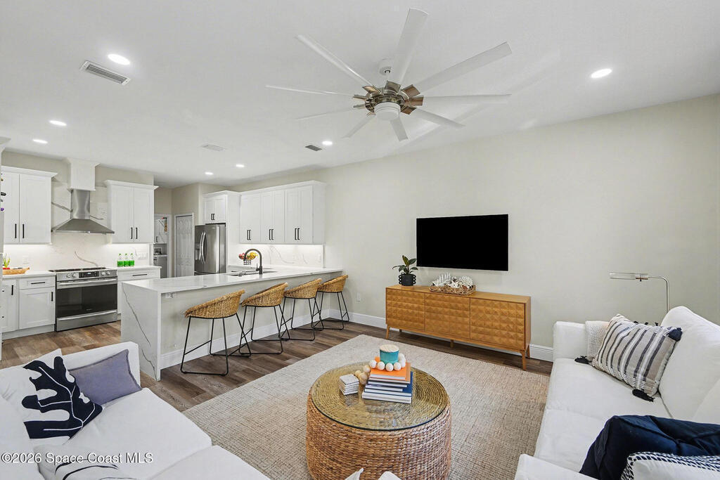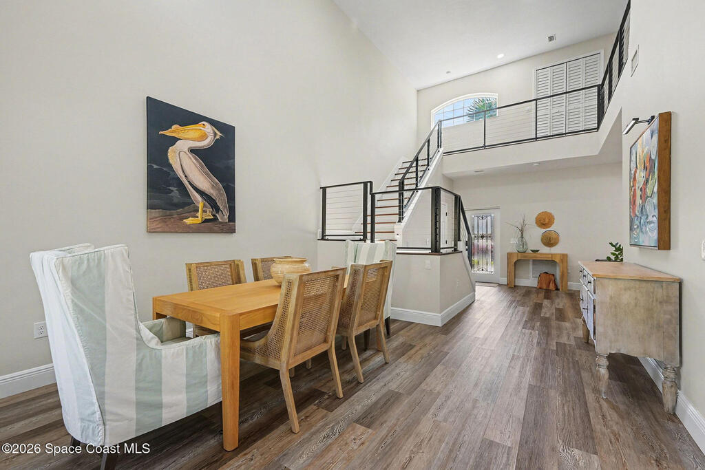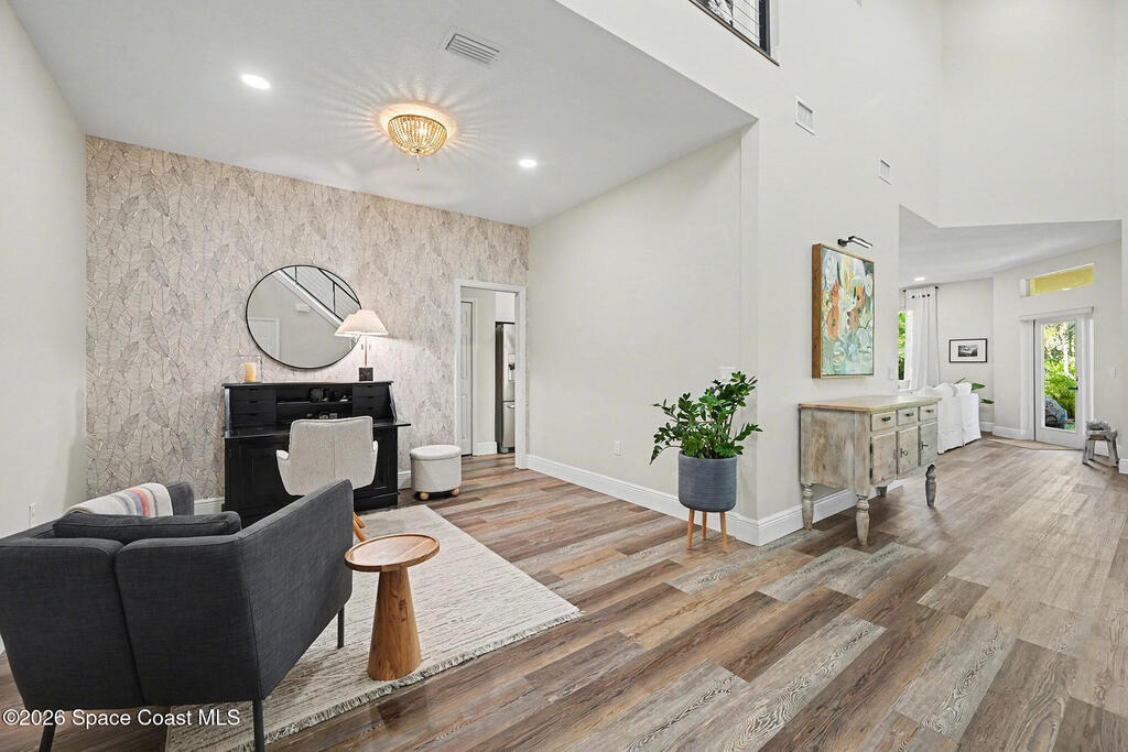 Gorgeous fully renovated end unit perfectly situated beachside gated community of Oceanside Village, offering resort-style amenities including pool, clubhouse, tennis, and basketball courts. This modern home features an open concept layout with a newly designed kitchen showcasing quartz countertops with waterfall edges and backsplash, under-cabinet lighting and newer stainless appliances. Luxury plank flooring, 7 inch baseboards throughout, hardwood stairs. All bathrooms have been tastefully updated with high-end finishes. Designer staircase & railing open the space and draw in natural light to the upstairs loft, ideal as a second family room or office. Updates include 2020 roof, newer air handlers, UV low-E impact glass windows upstairs for efficiency, fresh interior paint, new exterior paint, and custom blinds throughout. Building and flood insurance, roof replacement, exterior painting, landscape, grass, tree and shrubbery maintenance, irrigation, community amenities and security.