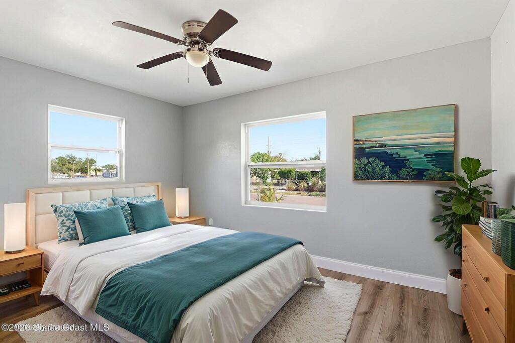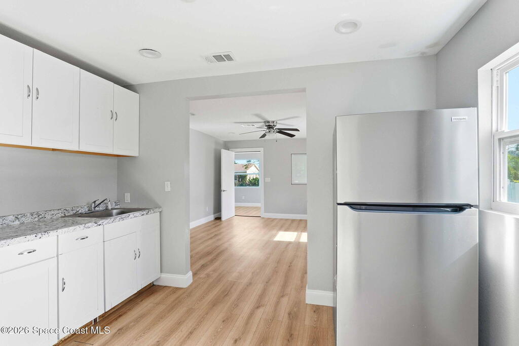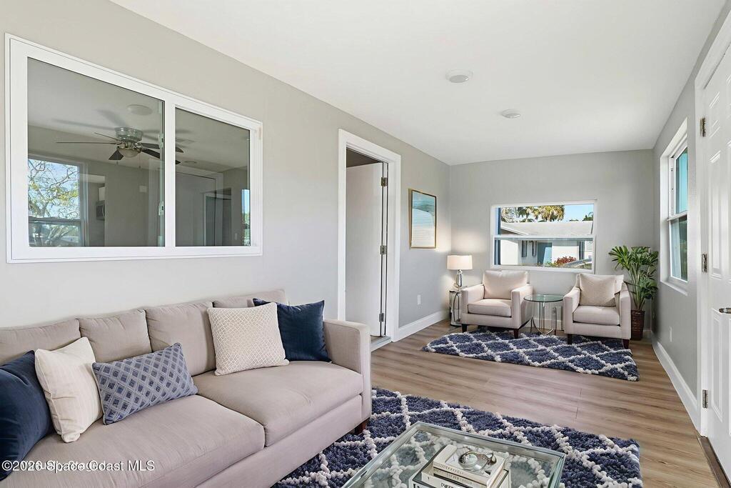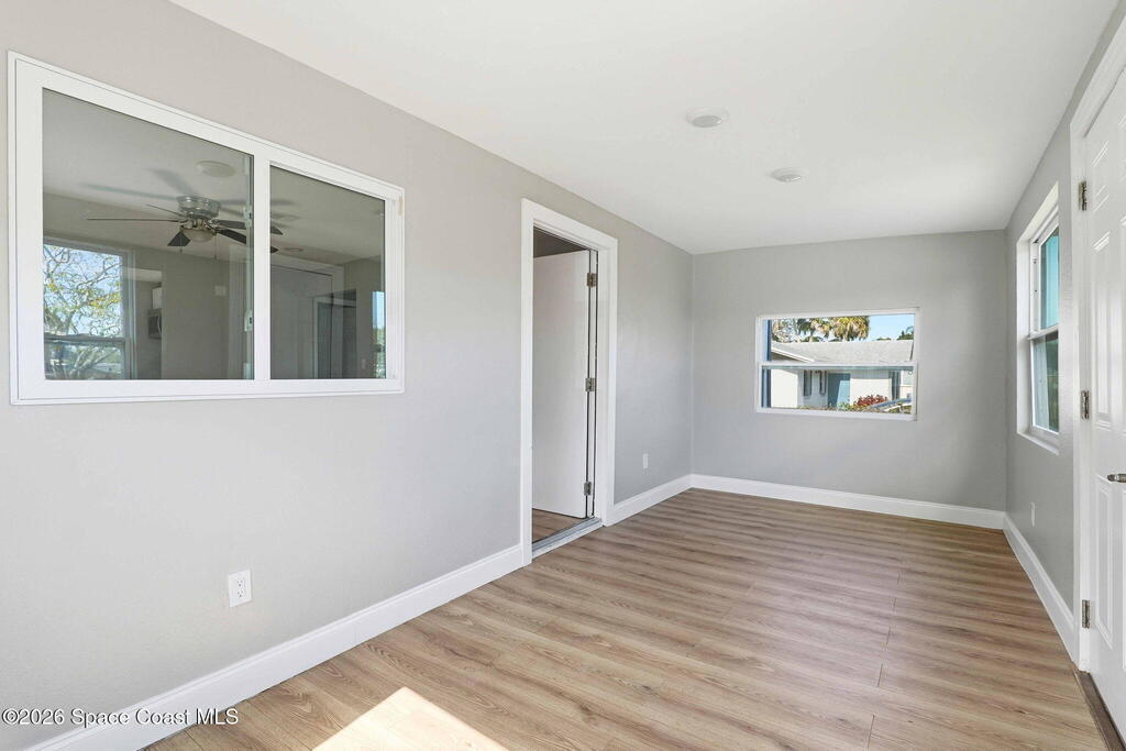 This 2 bedroom, 1 bathroom house in Titusville is simple, clean, and easy to live in. The inside has fresh paint and wood laminate floors throughout, so there's no carpet to deal with. In addition to the living room, there's an enclosed front porch and an enclosed back porch, which gives you extra room for things like working from home, hobbies, storage, or just spreading out a bit. The back porch also has washer and dryer hookups. The kitchen has very clean cabinets and appliances, and the backyard is fully fenced. There's also a shed for tools, bikes, or extra storage. If you're looking for a functional rental house in Titusville with extra usable space, this one checks a lot of boxes.