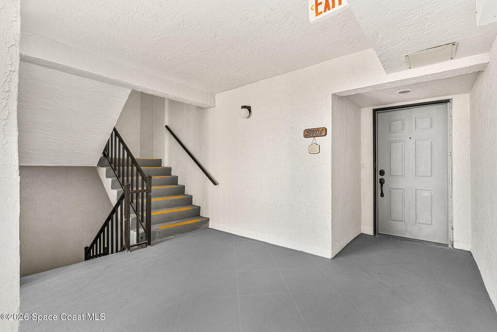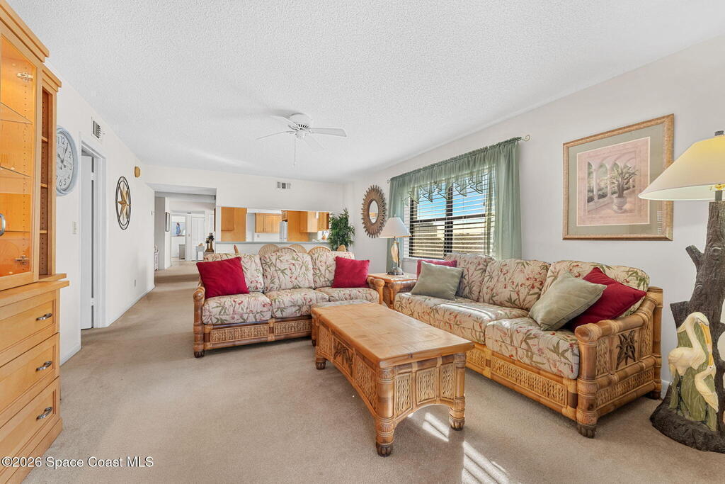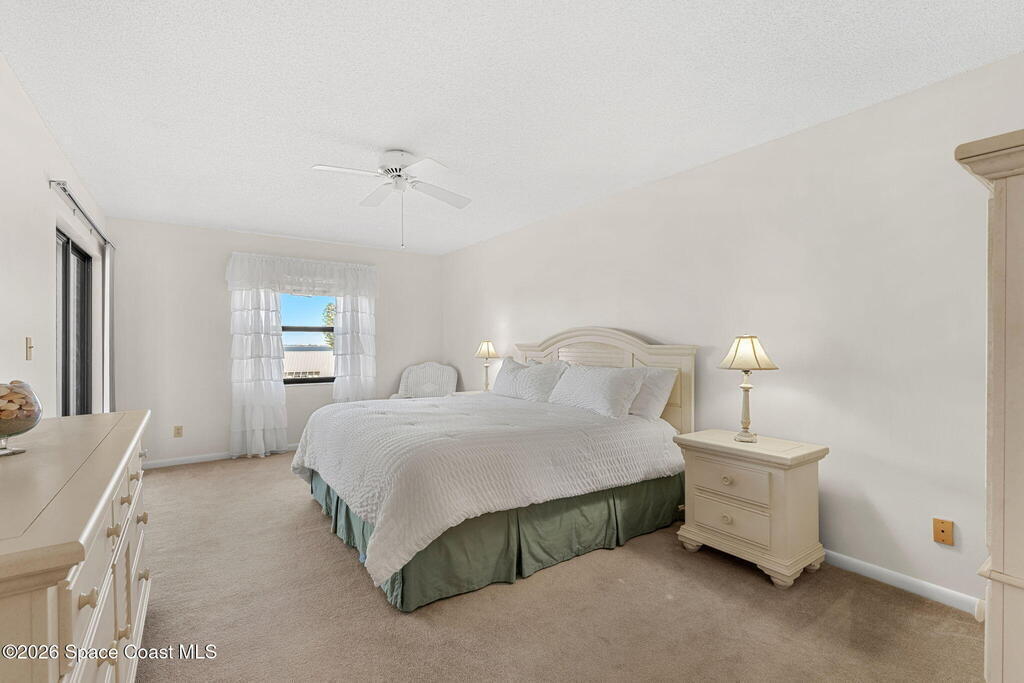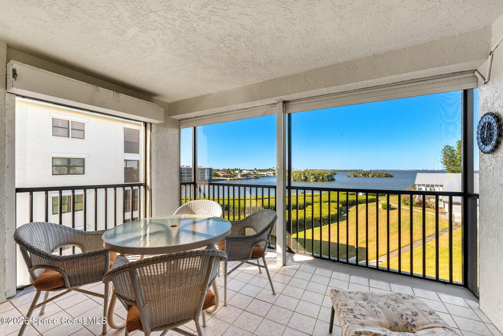 Rarely available 3-bedroom, 2-bath residence in Fountain Cove--an exceptional find in Cocoa Beach. Lovingly maintained as a second home, this fourth-floor unit offers custom wood cabinetry and Corian countertops in both the kitchen and baths, complemented by matching custom built-ins in the living room. Plush carpeting creates comfortable retreats in each bedroom. Enjoy sweeping Banana River views from the private balcony and the primary suite, where dual closets lead into a well-appointed en-suite bath. The balcony has recently completed restoration and is equipped with shutters for added peace of mind. Fountain Cove offers an inviting waterfront lifestyle with a pool, clubhouse, shuffleboard, river access, and car wash station. A deeded private one-car garage plus ample open parking complete this special offering.