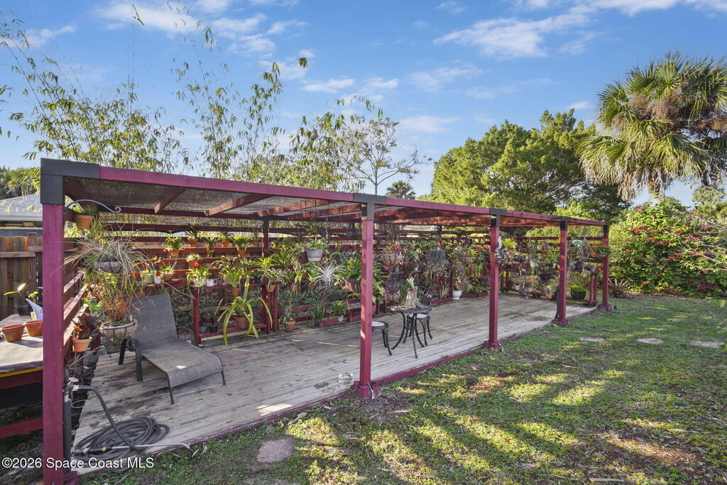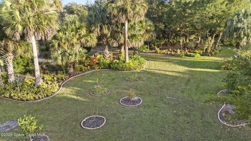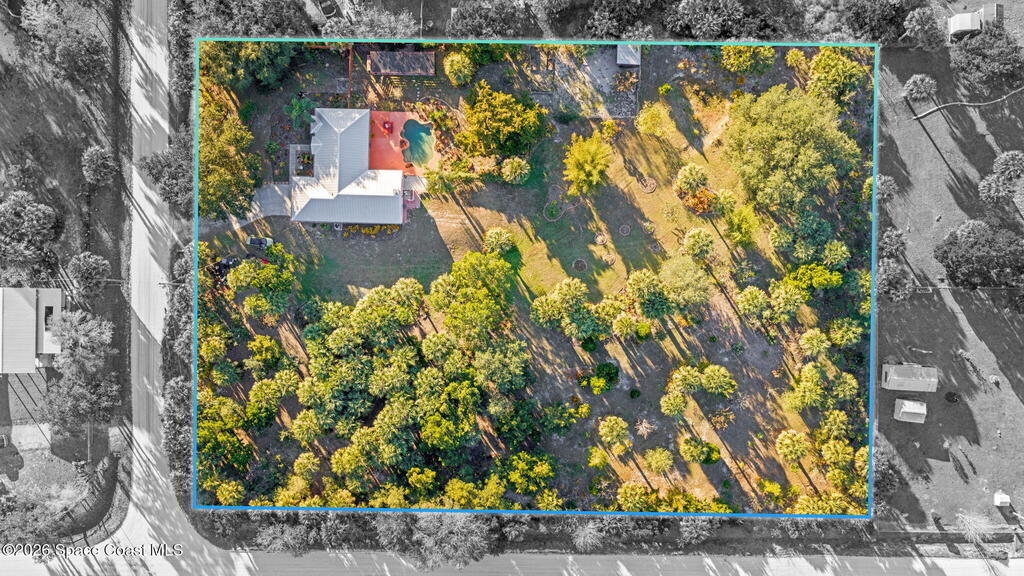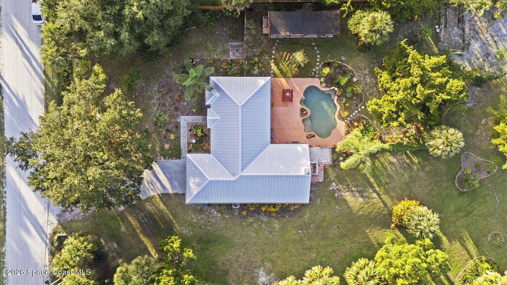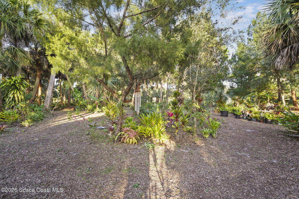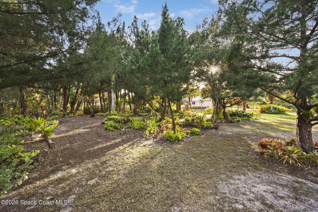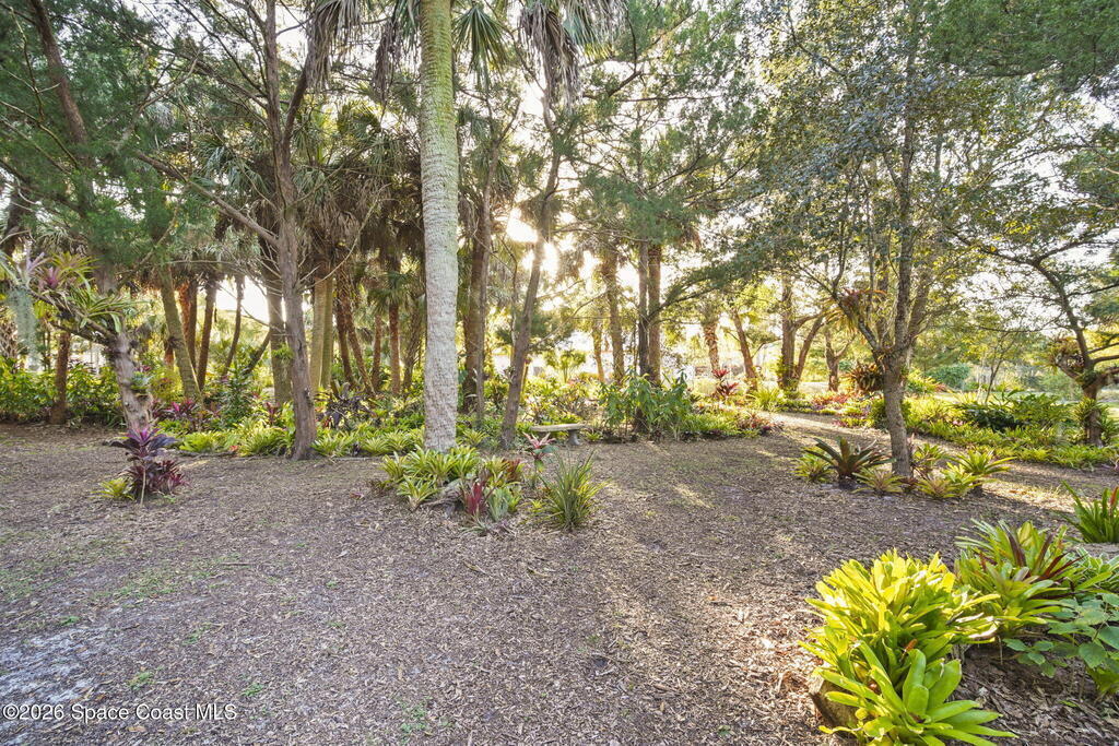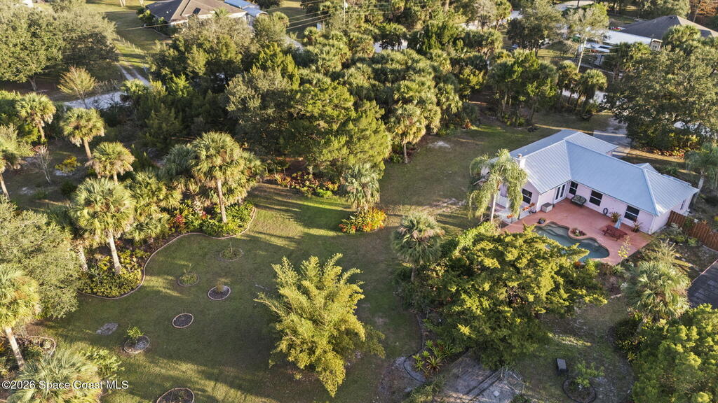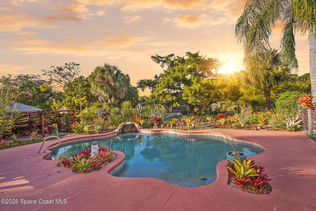 Garden, raise animals, or relax poolside. This unique two-acre retreat has it all. Sunlight pours through large windows, highlighting an open, easy floor plan with seamless luxury vinyl throughout. The spacious primary suite features a walk-in closet and a beautifully updated bath. The remodeled kitchen shines with newer appliances, new counters, sink, disposal, and a breakfast bar. French doors lead to a lush, tropical pool oasis with a covered shade house--perfect for lounging or showcasing plant collections. Imagine floating in the pool while watching rocket launches overhead. Enjoy peace of mind with a newer AC and newer appliances. Wander through winding paths on the second acre, complete with benches for wildlife viewing in your own private park. The property boasts fruit trees, gingers, bromeliads, plumeria, native plants, and mature oaks and cedars for shade. A rare, versatile paradise full of possibility. 2018 roof, 2023 AC, PEX water lines, shutters, termite bond.