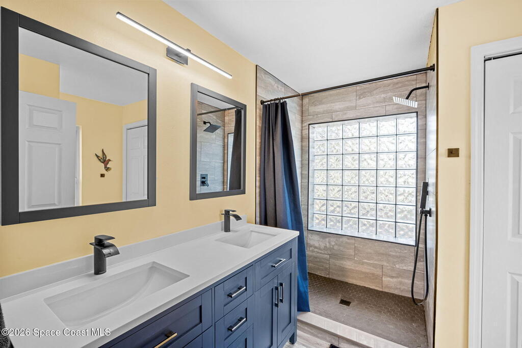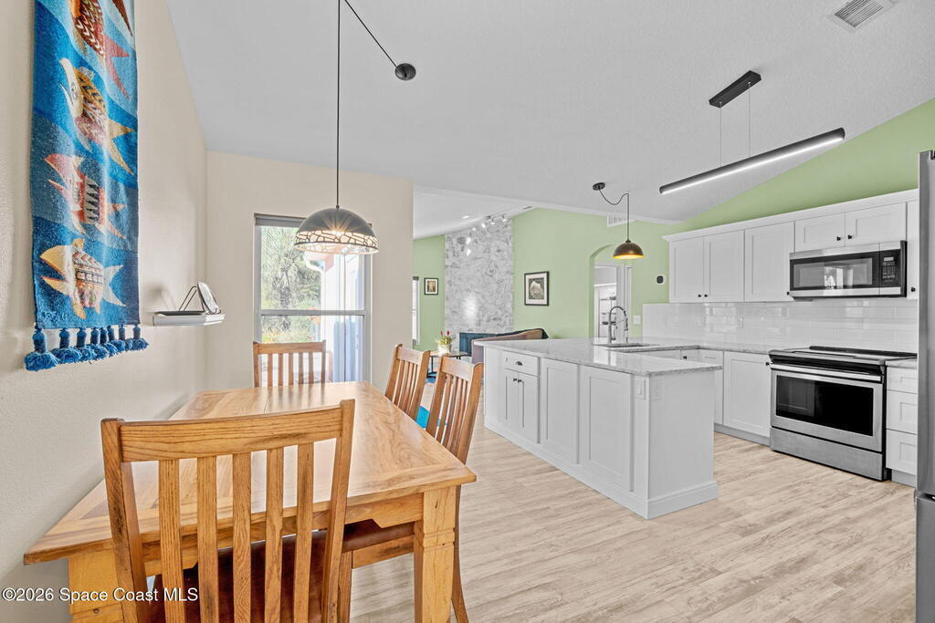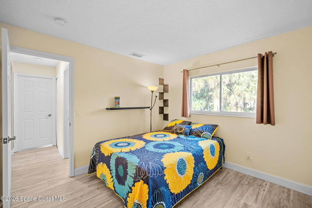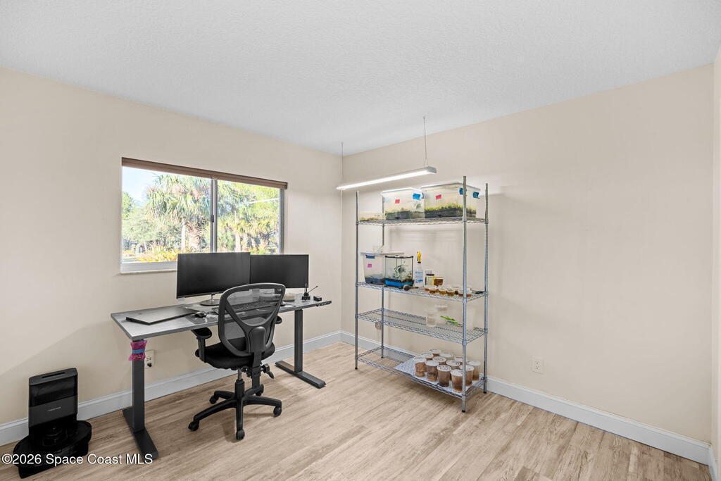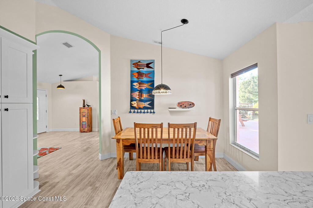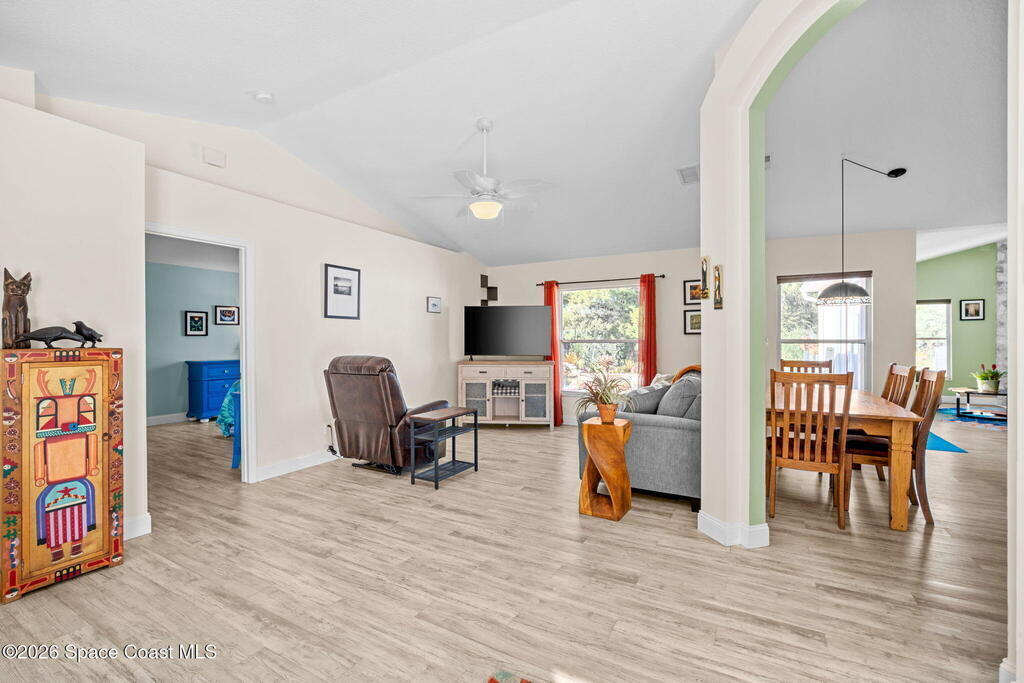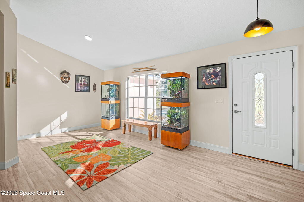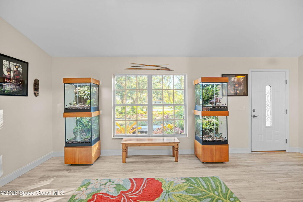 Garden, raise animals, or relax poolside. This unique two-acre retreat has it all. Sunlight pours through large windows, highlighting an open, easy floor plan with seamless luxury vinyl throughout. The spacious primary suite features a walk-in closet and a beautifully updated bath. The remodeled kitchen shines with newer appliances, new counters, sink, disposal, and a breakfast bar. French doors lead to a lush, tropical pool oasis with a covered shade house--perfect for lounging or showcasing plant collections. Imagine floating in the pool while watching rocket launches overhead. Enjoy peace of mind with a newer AC and newer appliances. Wander through winding paths on the second acre, complete with benches for wildlife viewing in your own private park. The property boasts fruit trees, gingers, bromeliads, plumeria, native plants, and mature oaks and cedars for shade. A rare, versatile paradise full of possibility. 2018 roof, 2023 AC, PEX water lines, shutters, termite bond.