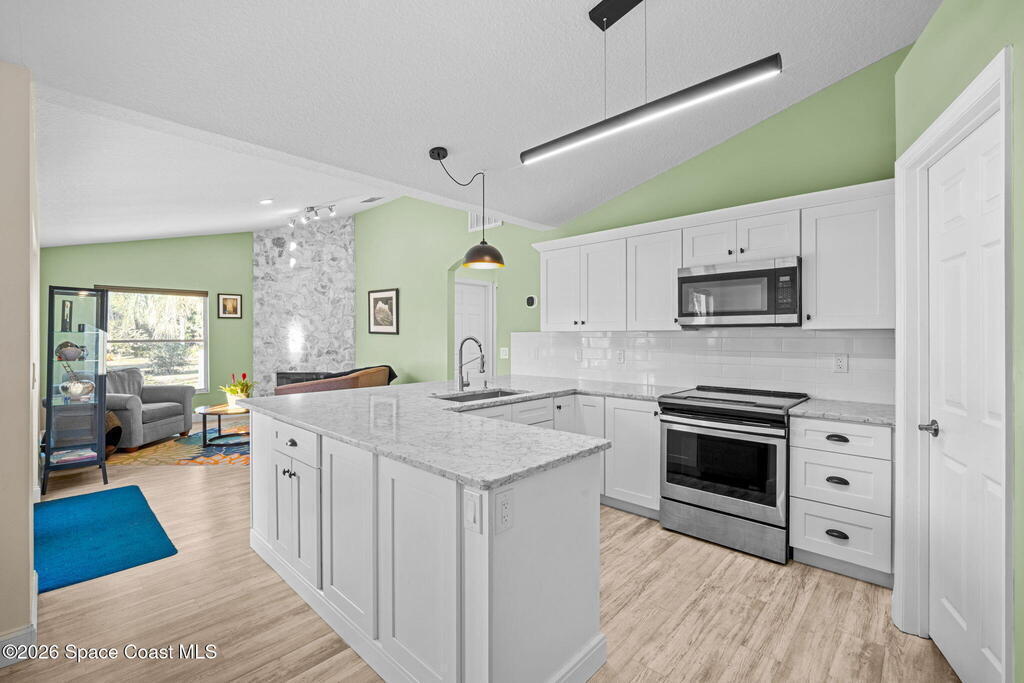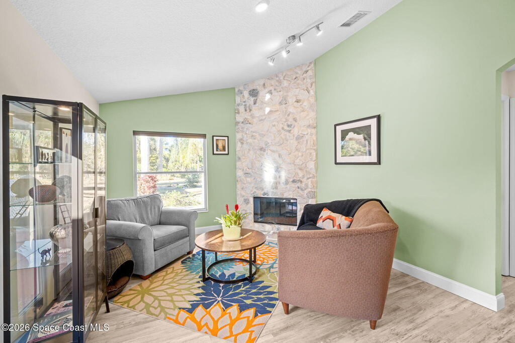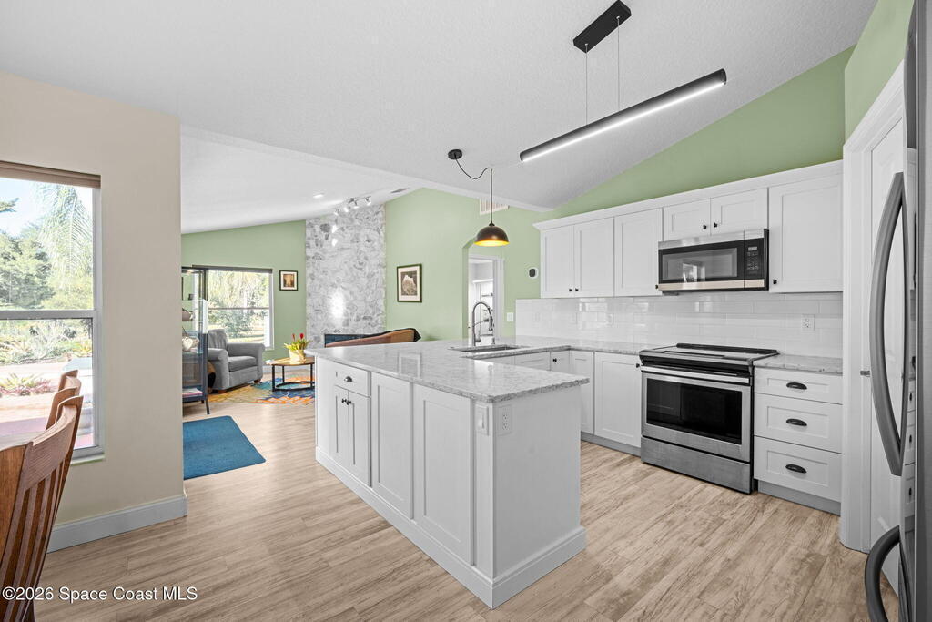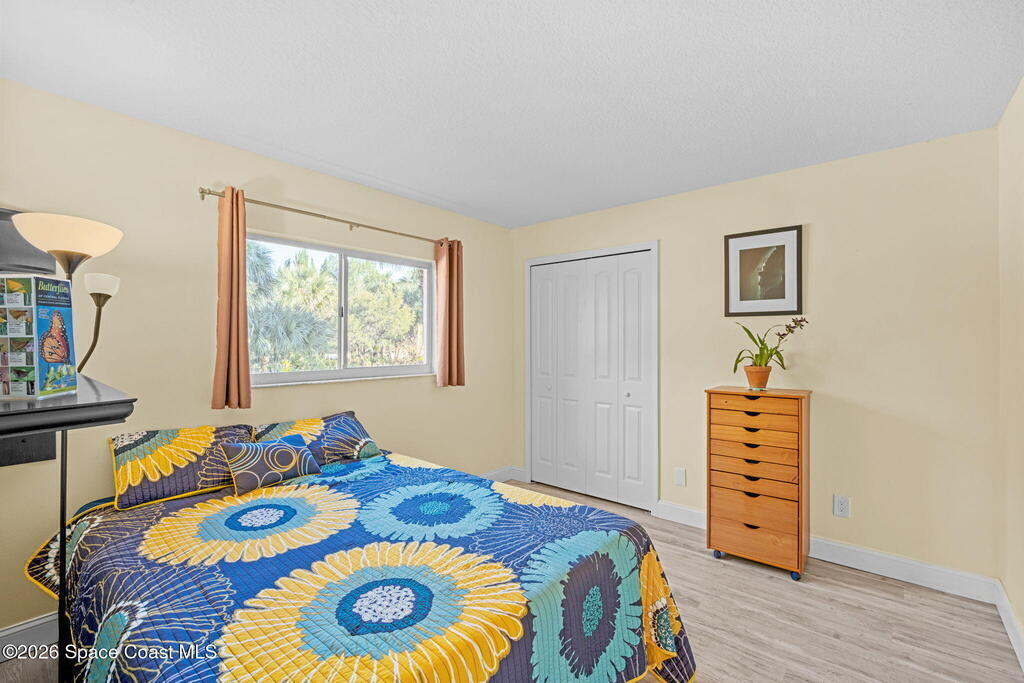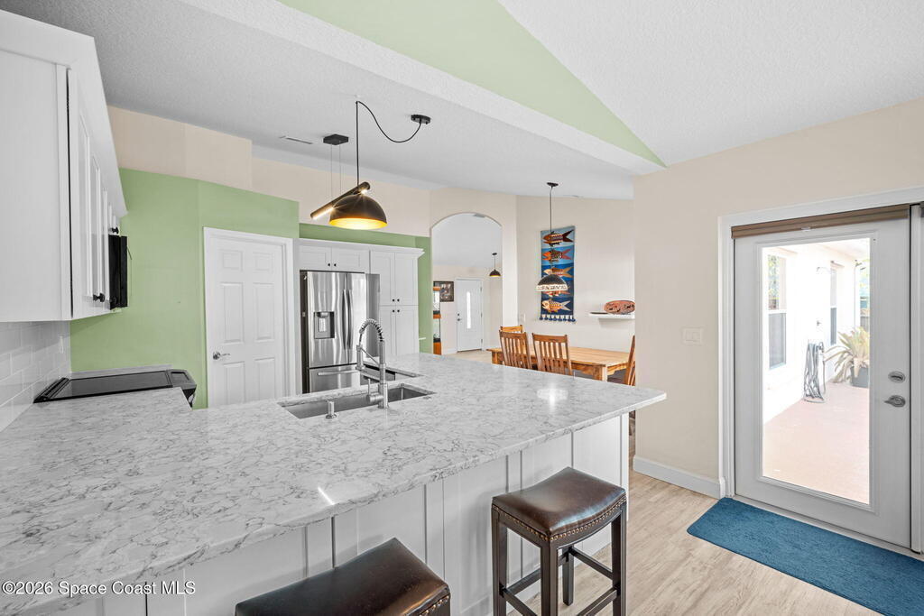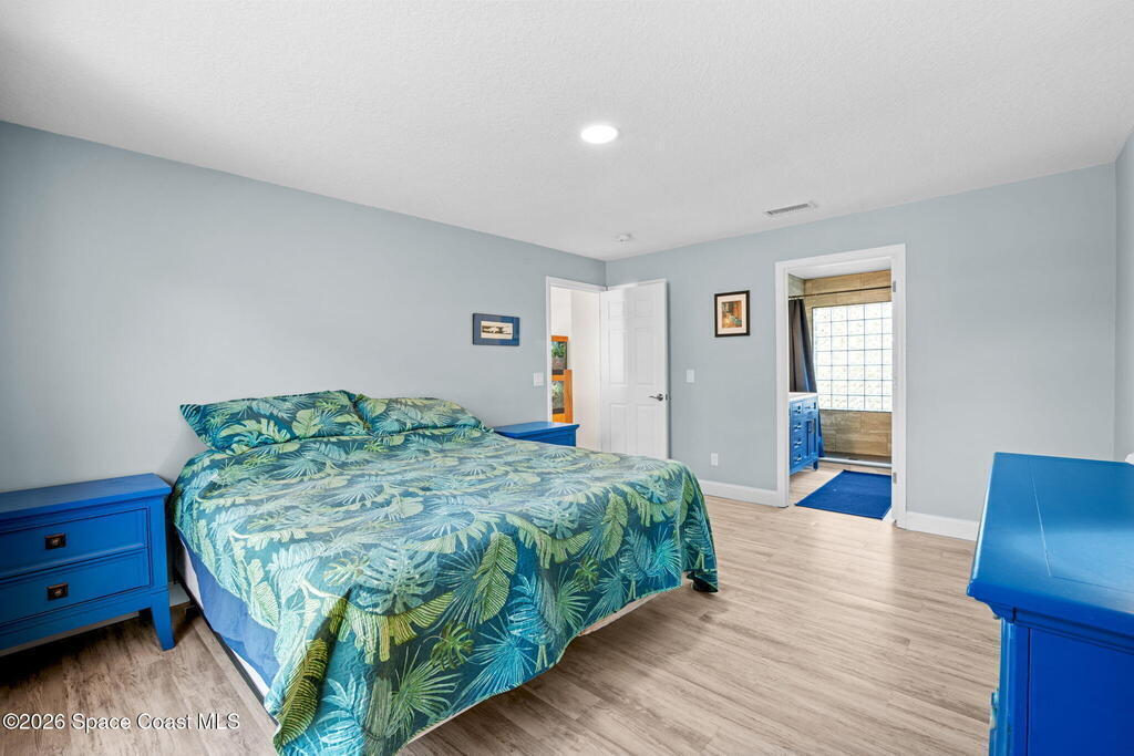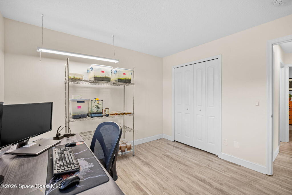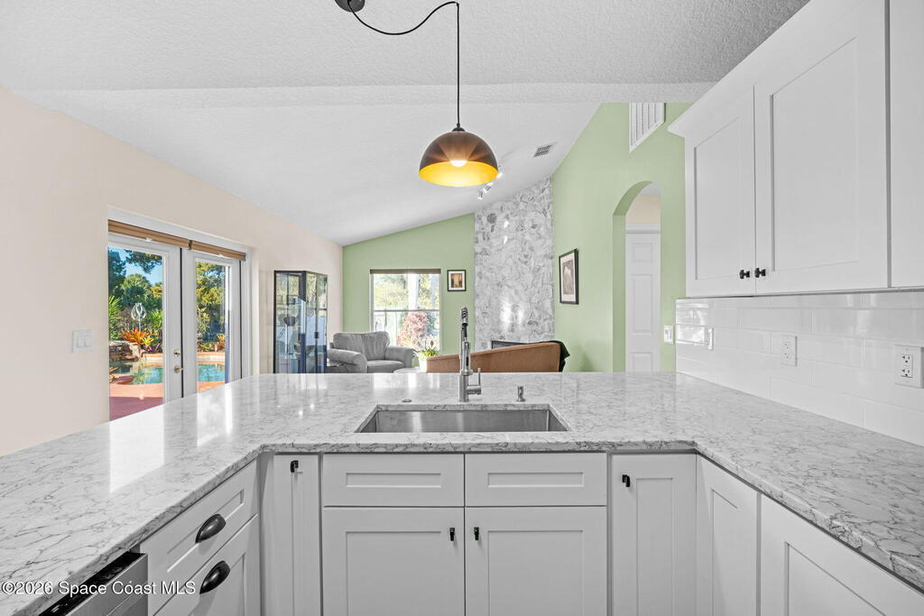 Garden, raise animals, or relax poolside. This unique two-acre retreat has it all. Sunlight pours through large windows, highlighting an open, easy floor plan with seamless luxury vinyl throughout. The spacious primary suite features a walk-in closet and a beautifully updated bath. The remodeled kitchen shines with newer appliances, new counters, sink, disposal, and a breakfast bar. French doors lead to a lush, tropical pool oasis with a covered shade house--perfect for lounging or showcasing plant collections. Imagine floating in the pool while watching rocket launches overhead. Enjoy peace of mind with a newer AC and newer appliances. Wander through winding paths on the second acre, complete with benches for wildlife viewing in your own private park. The property boasts fruit trees, gingers, bromeliads, plumeria, native plants, and mature oaks and cedars for shade. A rare, versatile paradise full of possibility. 2018 roof, 2023 AC, PEX water lines, shutters, termite bond.