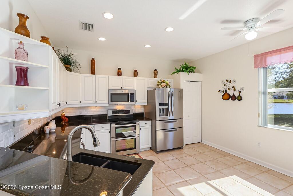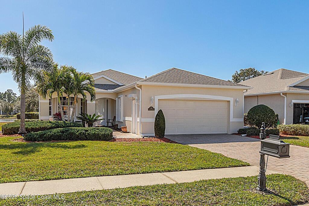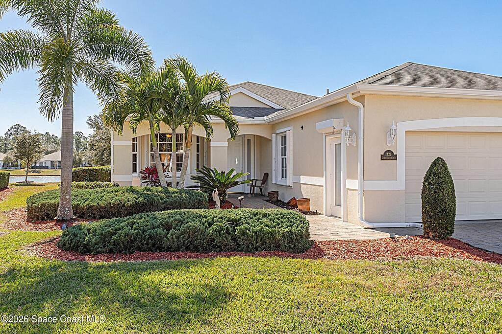 This outstanding lakeview home is located on a quiet street in the gated community of Monterey Cove at Bayside Lakes. Move-in condition! Monterey Cove has only one street with no through traffic. Just a five minute walk to the community center which has a clubhouse, resort style pool, exercise room, playground, tennis and basketball courts. Just short drive to Publix grocery, banks, Walgreens, Starbucks, and Dollar General and more. The home is a former model and features a new roof in 2021, H/W heater 2025, recent in and outside paint, accordion hurricane shutters (easy to open and close), oversized garage with windows (natural light) and access doors, and a screened and trussed patio. Tiled and upgraded vinyl flooring throughout (no carpeting), recessed lighting in living room. Kitchen features SS appliances, a double oven, and breakfast nook with lake view. Low HOA fee includes lawn and sprinkler care (perfect for those who travel or are part time residents). Agents: See Remarks.
