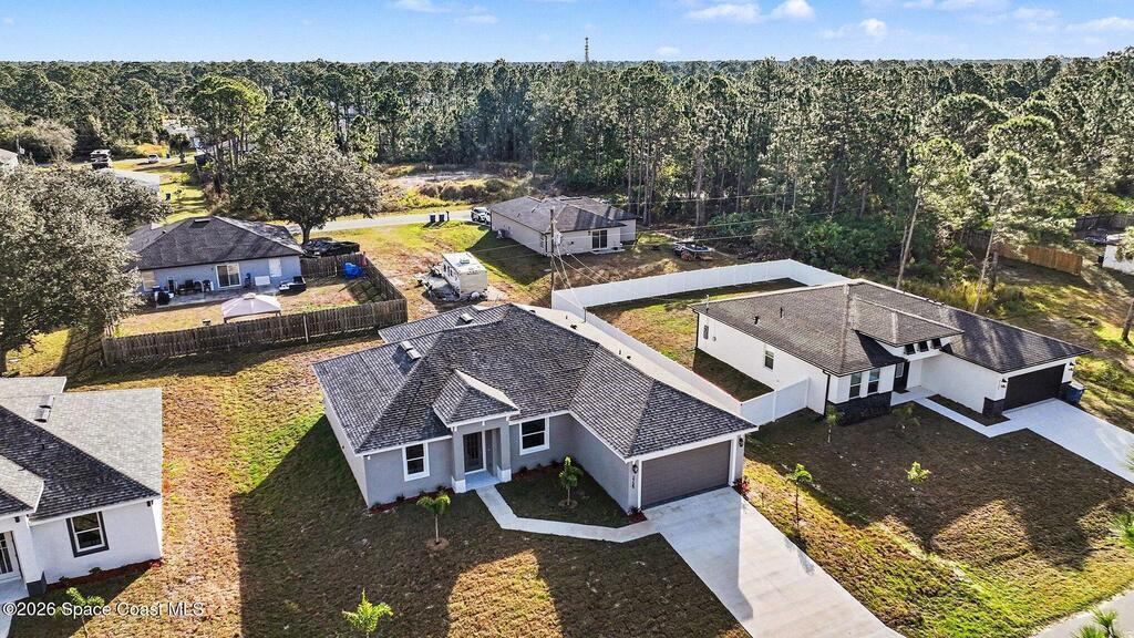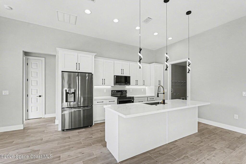 Impeccable craftsmanship and sophisticated design in the heart of Palm Bay, Florida. This stunning home embodies the essence of understated luxury, offering a serene retreat that blends modern high-end finishes with the relaxed atmosphere of the Space Coast. Every detail has been thoughtfully curated to provide a living experience that is both grand and inviting. The kitchen is anchored by a sprawling center island, perfect for entertaining or casual dining. This residence features lustrous quartz countertops not just in the kitchen, but carried seamlessly throughout the home, creating a cohesive aesthetic of elegance. Pristine tile flooring runs throughout the entire property, offering a cool, hypoallergenic, and sophisticated foundation that enhances the open, airy feel of the living spaces. The primary suite is a true sanctuary of relaxation. The en-suite bathroom rivals a high-end spa, featuring a grand walk-in shower equipped with dual rain shower heads, and a stand-alone bathtub