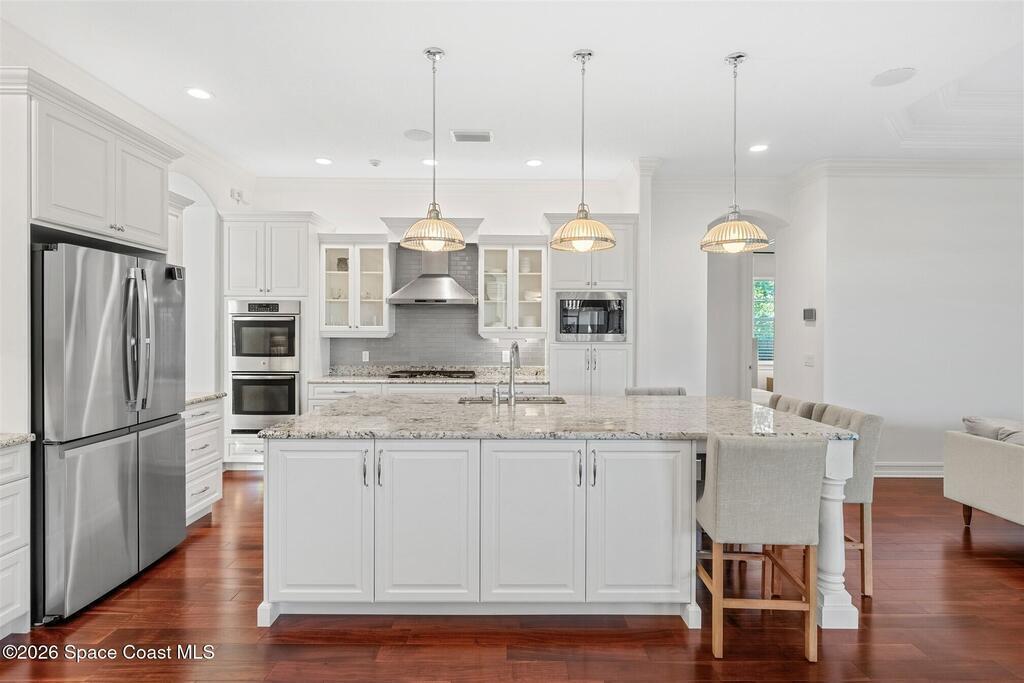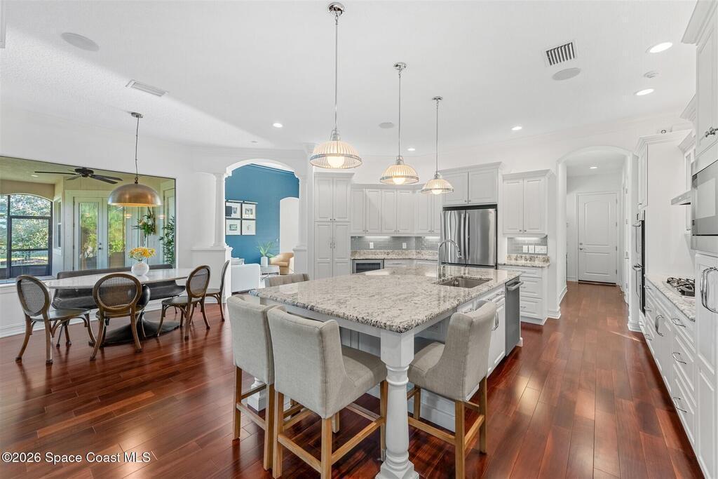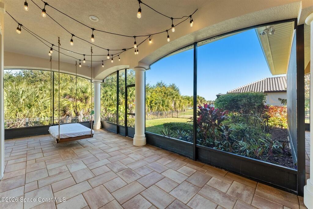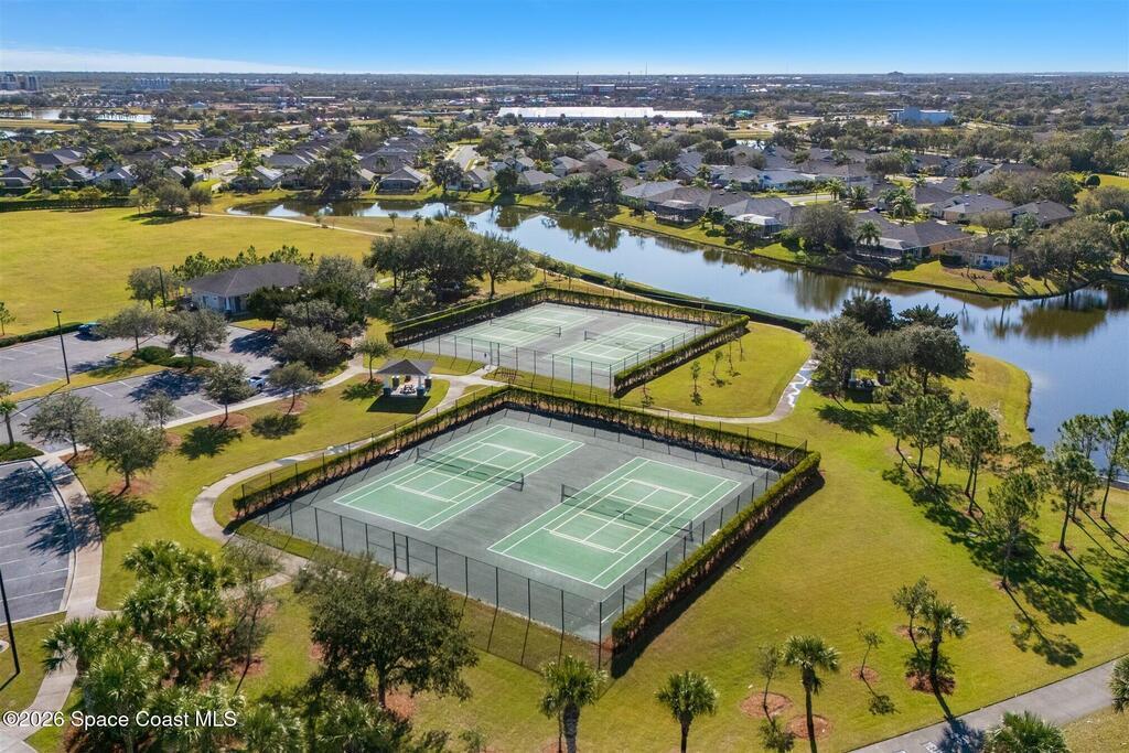 Privacy and luxury await in this custom-built home featuring 4 bedrooms, 3 baths plus office and located on a preserve with lake views. Enter through double glass doors into a home framed in whites and blues. Notice the custom trim work and gorgeous hardwood floors which draw your eye through the living, dining, office, kitchen and family rooms. The large kitchen with white cabinets and 9' designer island is the heart of the home, walk-in pantry, 5 burner gas cooktop, double ovens, microwave and wine fridge, complete any Buyer's wish list. Large Primary suite occupies its own wing and will not disappoint. Guest rooms are generously sized and separate from the primary bedroom. Oversized 3 car garage with custom interlocking floor system and sink. Large fenced in yard features paver sidewalks on both sides of the house and has room for a pool. Conveniently located to A rated schools, shopping and dining in West Viera.