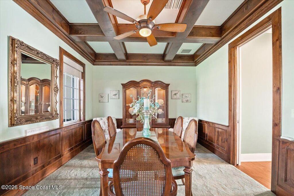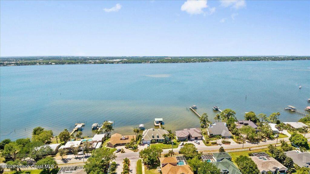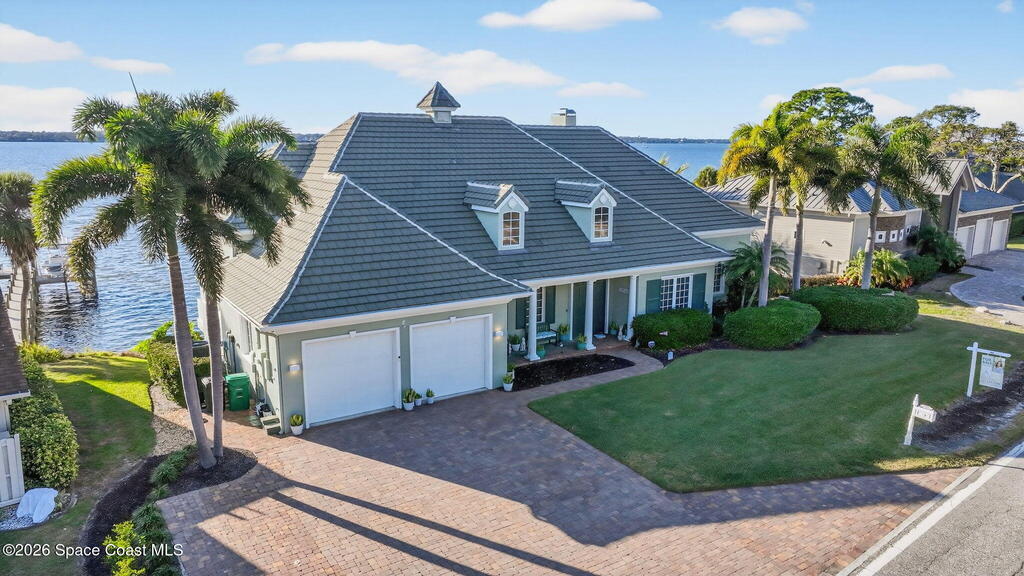 Experience expansive views of the marine-life-filled Indian River and breathtaking sunsets from every room of this 5200 sq ft waterfront home. Featuring 5 bedrooms, 6 baths, an office, and bonus room, this residence offers exceptional space for multi-generational living or entertaining. The stunning eat-in kitchen boasts river views, a balcony, custom cabinetry, granite counters, chef's island, and Sub-Zero refrigerator. The primary suite on the main level includes a private riverfront terrace. A lower-level suite offers living space, kitchenette area, and walk-out access to the river. Architectural details include tray ceilings, wood beams, crown molding, and high ceilings throughout. Enjoy the expanded dock with boat lift (2018), step-down fishing area, coquina rock shoreline, and large paved patio with fire pit. Oversized bedrooms, abundant storage, large closets, 2 NEW a/c units, no-see-um screened balcony, and jet ski lift, complete this exceptional riverfront retreat.