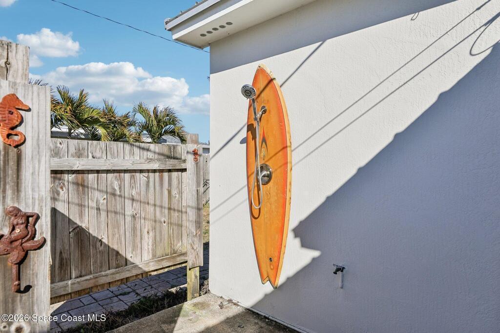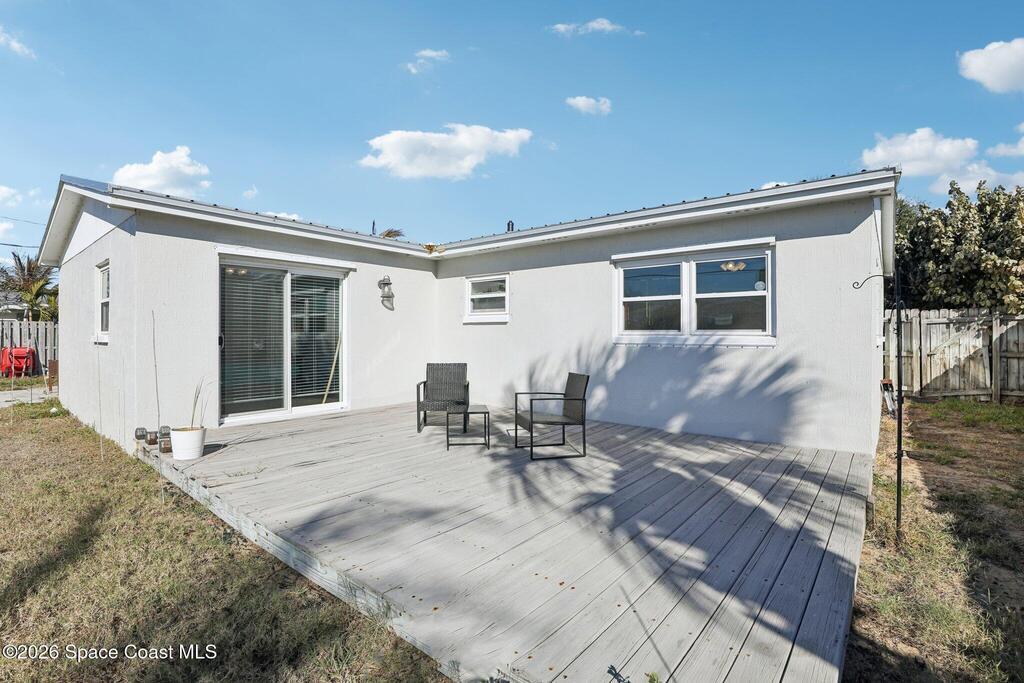 Charming beachside home on a spacious lot with no HOA! This beautifully remodeled 3-bedroom, 2-bath home offers a huge fenced backyard with double gates and plenty of room for a pool. Major updates include updated underground plumbing and electrical, a metal roof (2024), top-of-the-line Bosch HVAC (2024/2025), and a water heater (2023). Enjoy outdoor living with a large rear deck, storm shutters, and a brand-new storage shed. The garage features a spacious laundry room area, and the primary suite offers private access to the outdoor area. Established residential neighborhood. Located just a few blocks from the ocean and beach (6 minutes), with convenient access to Patrick Space Force Base (5 minutes), Port Canaveral (27 minutes), and Orlando International Airport (approx. 57 minutes).