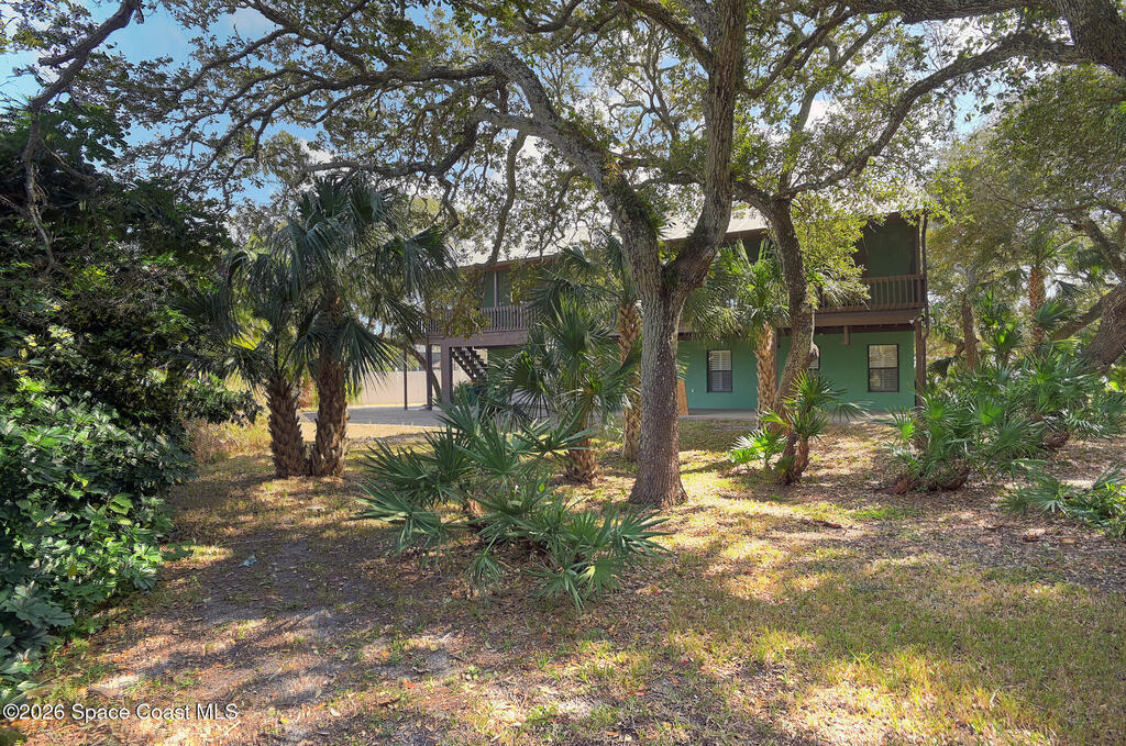 Well built two-story home is tucked among many majestic oak trees and this location is extremely private. The expansive second-floor great room features kitchen with island plus vaulted ceilings, skylights and boasts a wood-burning fireplace. Slider opens to an extra long screened-in lanai with tile floors. Accordion hurricane shutters provide added protection and peace of mind. Downstairs there are two bedrooms and a full bath; upstairs primary suite offers generous space and double closets. Both bathrooms include Jacuzzi tubs. Oversized two car garage is a drive-through with two garage doors. Ocean access is very close and gated and has covered pavilion. The .36-acre lot is larger than most, with lush landscaping and large driveway for parking. This property blends privacy, a wooded feel, and convenient access to ocean and gated entry.