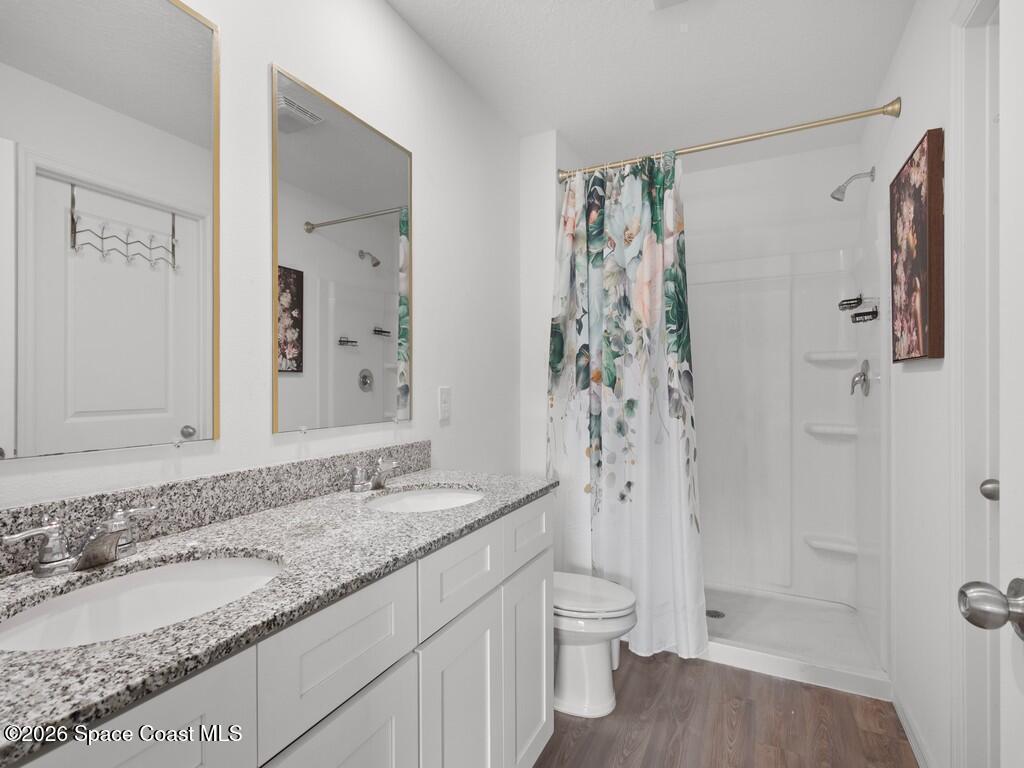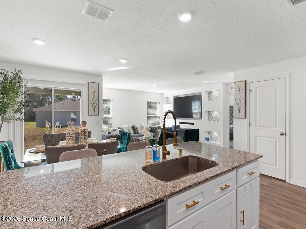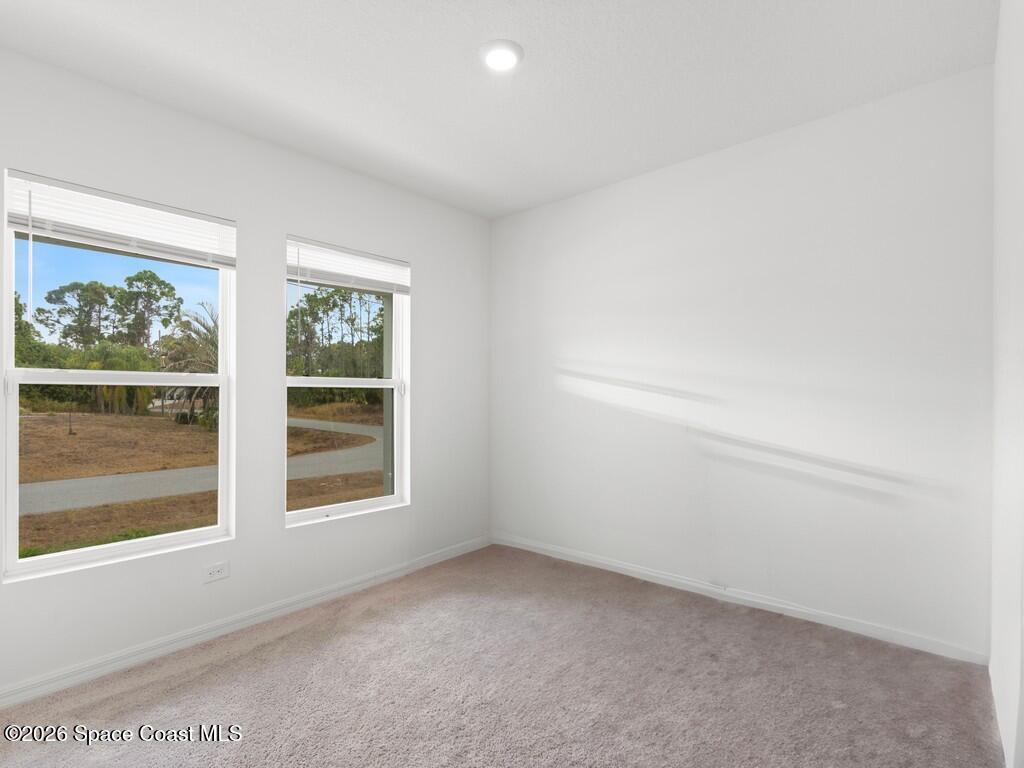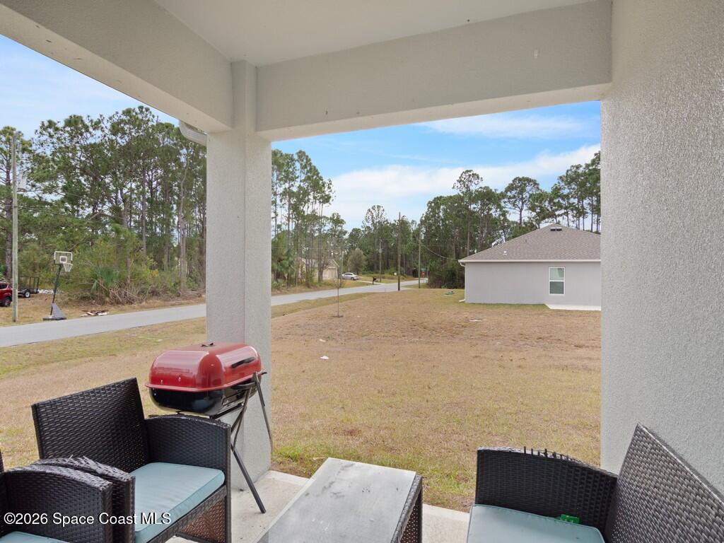 Gorgeous and spacious 3-bedroom, 2-bath single-family home located in the desirable Palm Bay community. This home offers a split-bedroom floor plan, providing privacy with the primary suite situated on its own side of the home. A versatile den with a door functions perfectly as a fourth bedroom, home office, or guest space. The thoughtfully designed layout offers ample storage and comfortable living throughout. Enjoy a full-size laundry room with full-size washer and dryer. The beautiful kitchen features white cabinetry, granite countertops, stainless steel appliances, and is open to the living and dining areas, ideal for entertaining. The primary suite includes a generously sized walk-in closet and dual vanity sinks. Additional highlights include a two-car garage, rear porch, and a large corner-lot yard, perfect for families or pets, with only one neighboring home. Conveniently located minutes from Publix, shopping, dining, and everyday conveniences in a growing community.