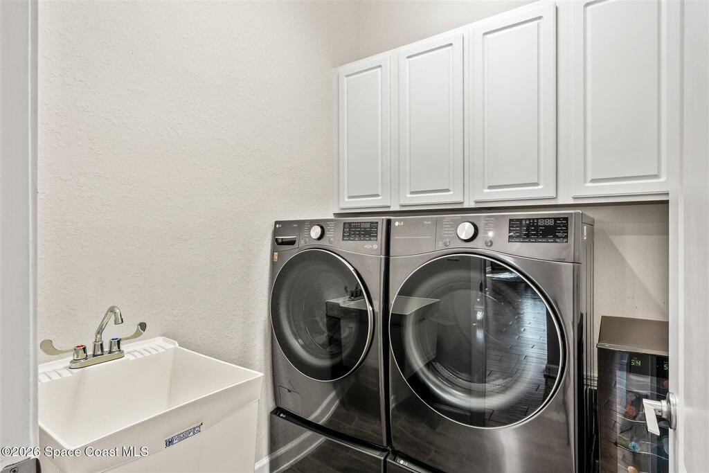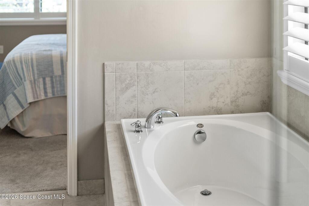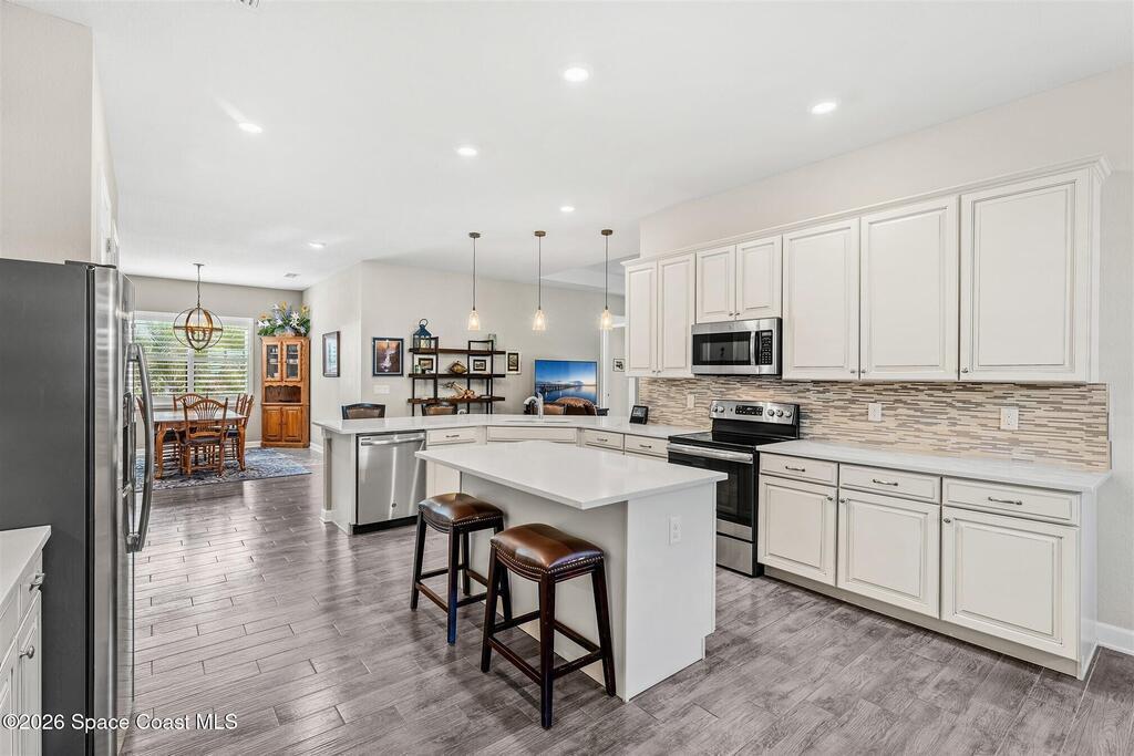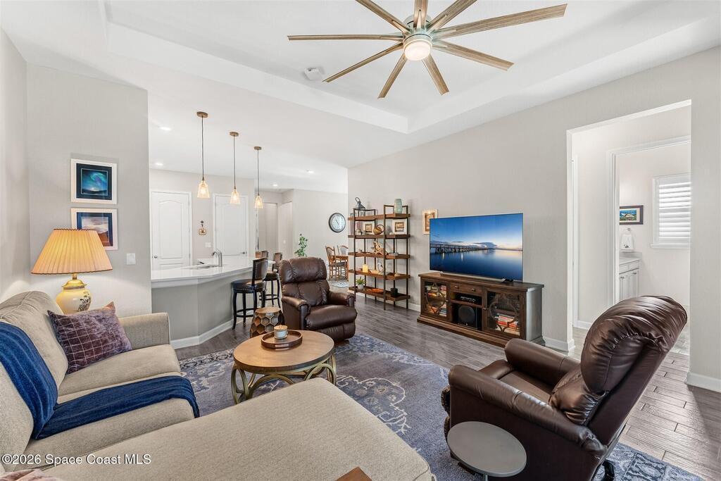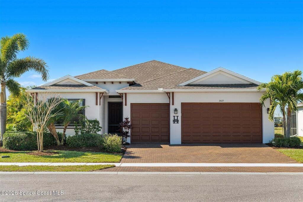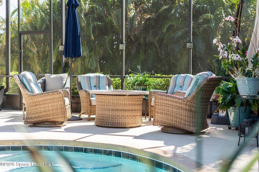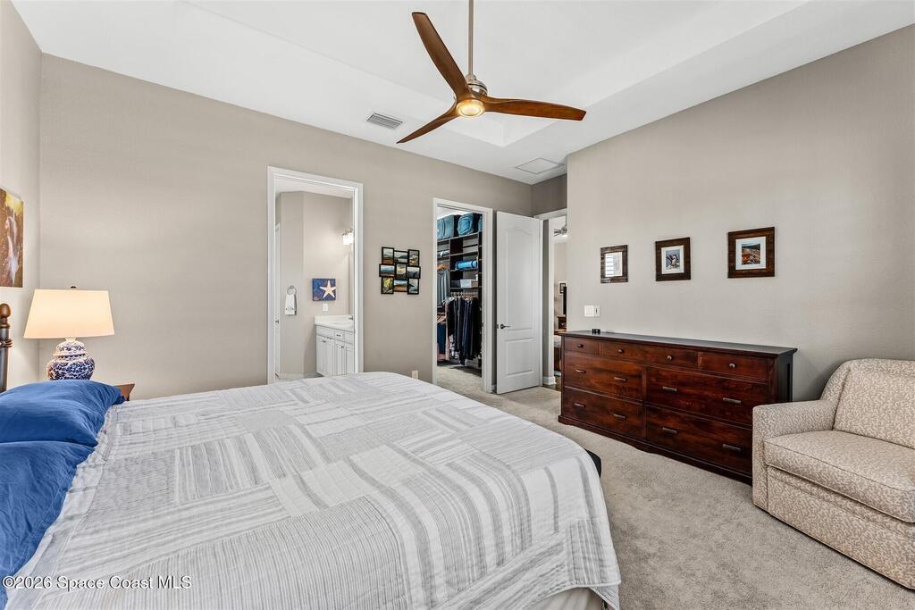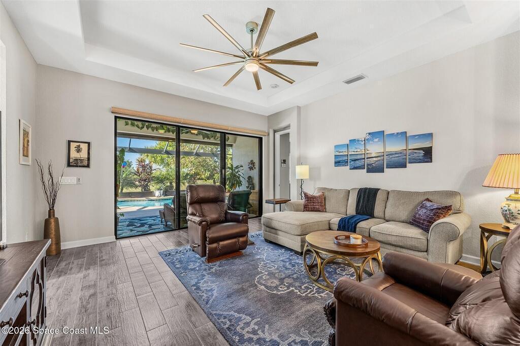 A tropical paradise awaits in this lovely 4 bed, 3 bath, 3 car garage POOL home in Bridgewater, Viera's resort style 55+ community! Located on a cul-de-sac, this meticulous home has additional lush landscaping for extra privacy! You will love the lanai with electric rolldown hurricane panels to keep your patio furniture protected during storms and the heated pool with a huge, screened enclosure! The ideal primary bedroom has a tray ceiling, a walk-in closet with custom built-ins and a bath with soaking tub and shower! Must have features include a guest bedroom w/ensuite bath, plantation shutters, wood look plank tile floors, tray ceiling & remote shades in great room, upgraded kitchen cabinets w/3 cm quartz counters, laundry room with sink, and even an EV plug and epoxy floors in garage! Energy efficient with attic radiant barrier & smart home features! Private clubhouse includes heated pool and spa, fitness center, lighted tennis & pickleball courts, billiards room and movie theater