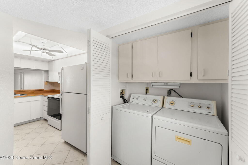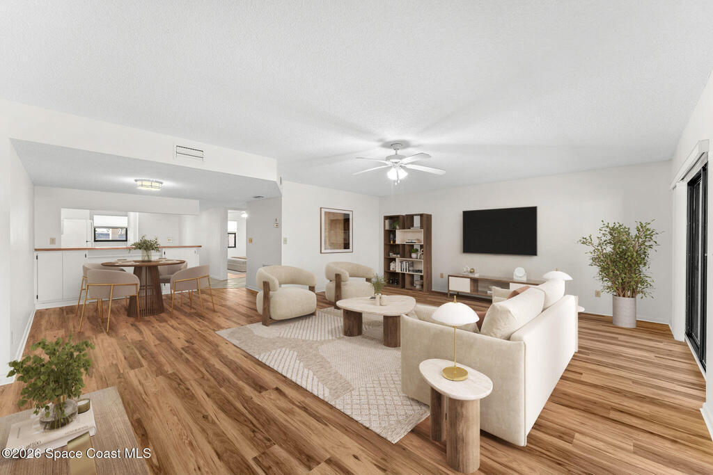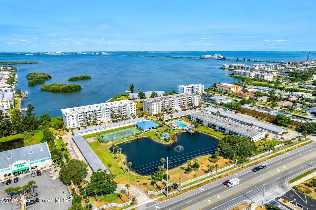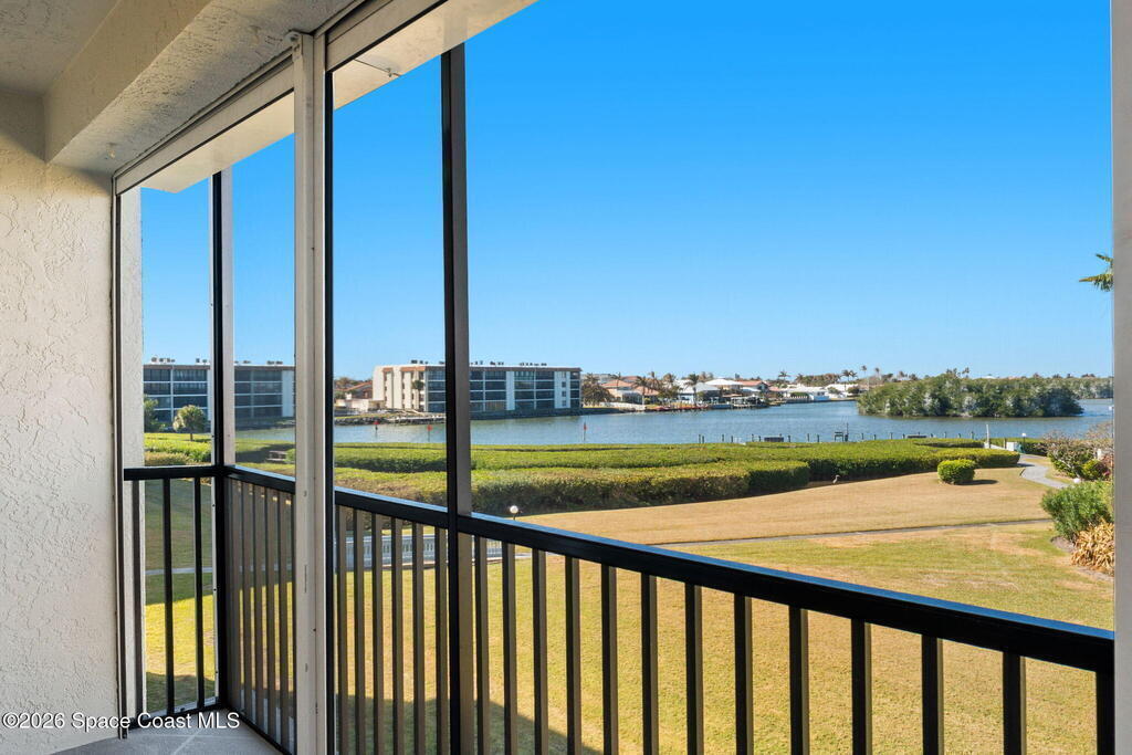 Enjoy front-row sunset views over the Banana River from this rare 2-bedroom, 2-bath condo in Fountain Cove. With nearly double the balcony and living space of any neighboring units, this wide-layout plan feels more like a stand-alone home than a condo, offering unobstructed panoramic water views. Inside, you'll find it warm and inviting, with new laminate flooring in the main living areas and a spacious, open layout that's ideal for everyday living or seasonal stays. The large primary suite offers water views and an en-suite bath, while a private in-unit washer and dryer and a one-car garage just steps from the main building add everyday convenience. Fountain Cove offers resort-style amenities including a riverfront heated pool, spa, tennis courts, and scenic boardwalk. The oversized balcony is perfect for relaxing, watching wildlife, or taking in the boat parade and spectacular sunsets. All just a short walk to the beach, Publix, and restaurants.