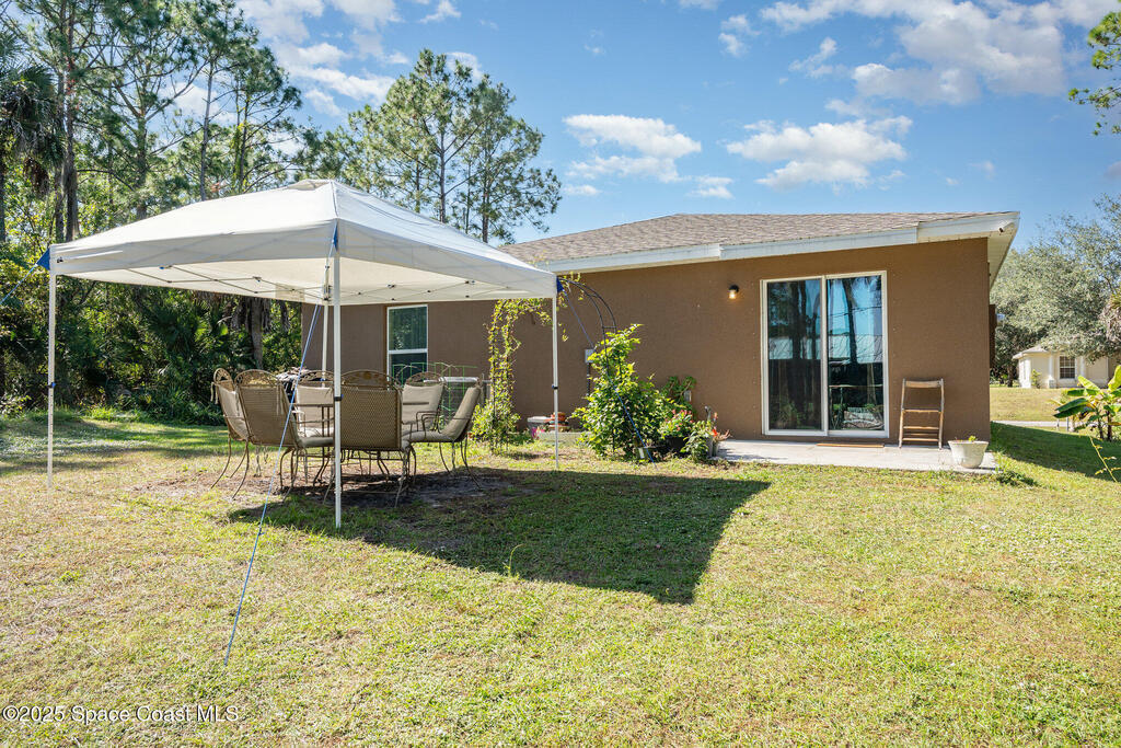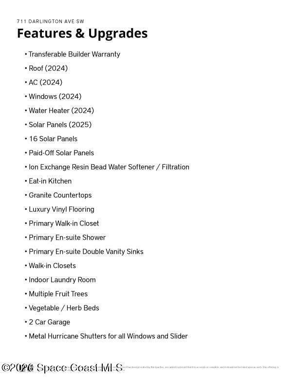 Practically brand new 3 bed / 2 bath built in 2024 with transferable builder warranty. This one has it all - open floor plan, water filtration system, fruit trees and paid off solar panels! The kitchen boasts granite countertops, white shaker cabinets, stainless steel appliances, and bar seating. The primary ensuite offers a double vanity with granite countertops and walk-in closet. Additional bedrooms offer maximum storage with walk-in closets. Vinyl plank in main living areas. Indoor laundry room. Gardener's paradise with citrus, grape, cherry, pineapple, fig, bananas, mango, avocado, lettuce beds, elderberry, basil and so much more! Minutes away from major shopping centers, restaurants, parks, and quick access to I95.