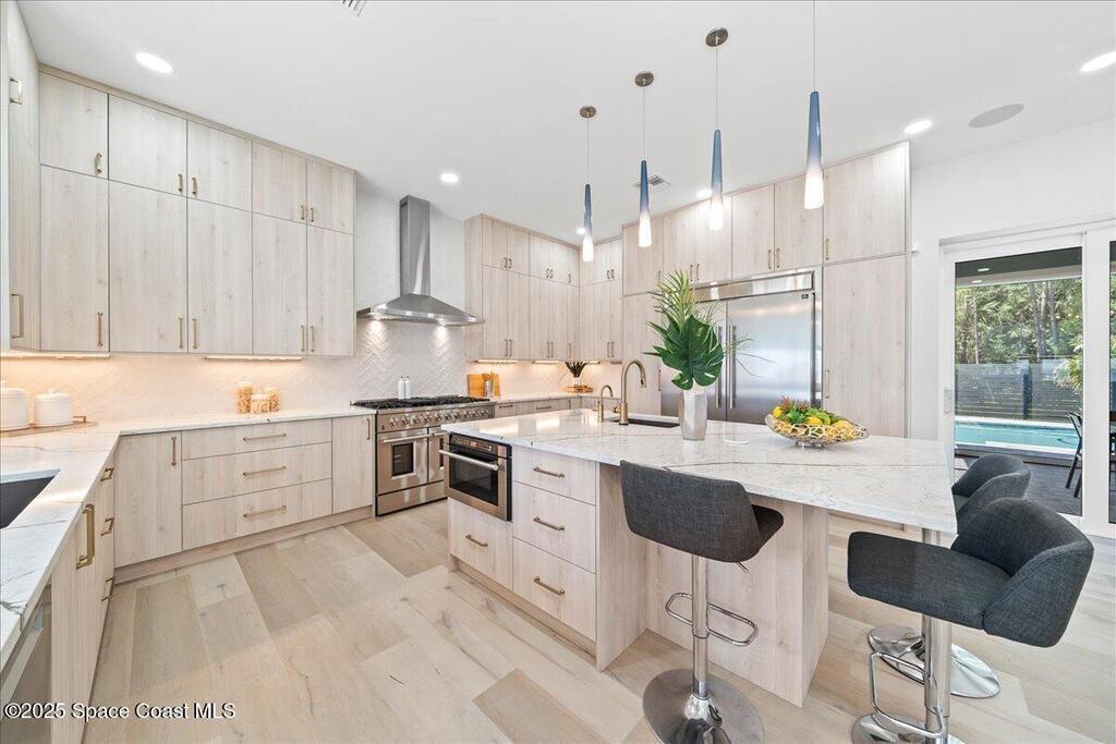 This beautiful riverfront property in Titusville, Florida, situated on Indian River, provides spectacular views of the water and unobstructed views of the launch pads. The newly developed house has a coastal contemporary design, which seamlessly blends modern luxury with classic charm. As soon as you step inside, you will be greeted by a welcoming and spacious open-plan living area. With four bedrooms and three and a half bathrooms, this home offers ample space for everyone. The backyard will include a fenced-in pool, spa, and a summer kitchen perfect for relaxing and enjoying the warm summer days. Don't miss your opportunity to see this pristine new property.