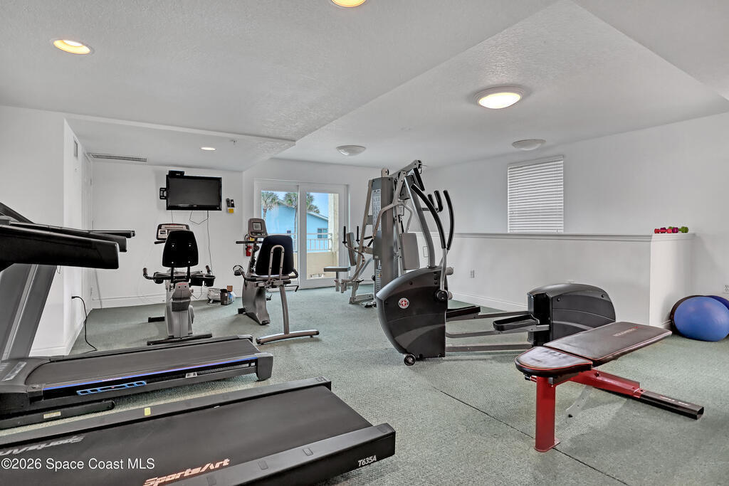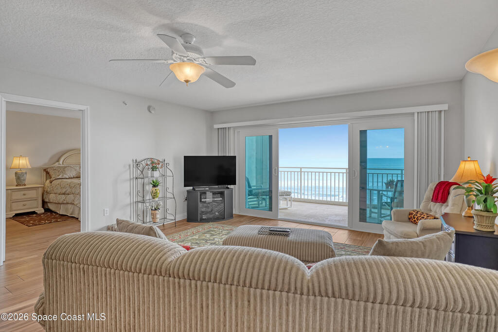 Beautiful top-floor condo with direct ocean views and an open, airy layout. This 3-bedroom, 2-bath residence showcases breathtaking beachfront vistas and an inviting open floor plan ideal for coastal living. Impact sliders and tile flooring define the spacious living and dining areas, opening to a private balcony overlooking the ocean. The kitchen features a large breakfast bar, kitchen island, granite countertops, white cabinetry, and white appliances--perfect for entertaining while enjoying the view. The primary suite is a serene retreat with private balcony access, dual walk-in closets, and an ensuite bath offering double sinks, a tile shower, and a jetted soaking tub. Two additional bedrooms provide quiet comfort, one with direct access to the second bath accented by finishes and tile. Condo offers a private walled one- car garage. Residents enjoy premium amenities including a heated community pool, ocean-view fitness center, and exclusive private ocean access.