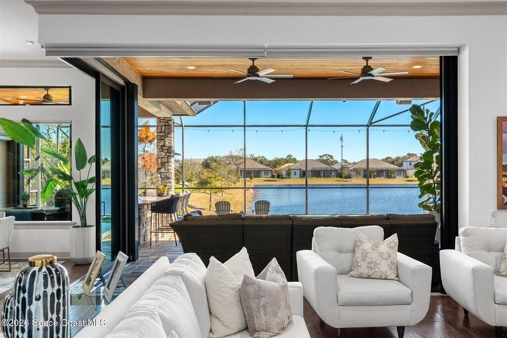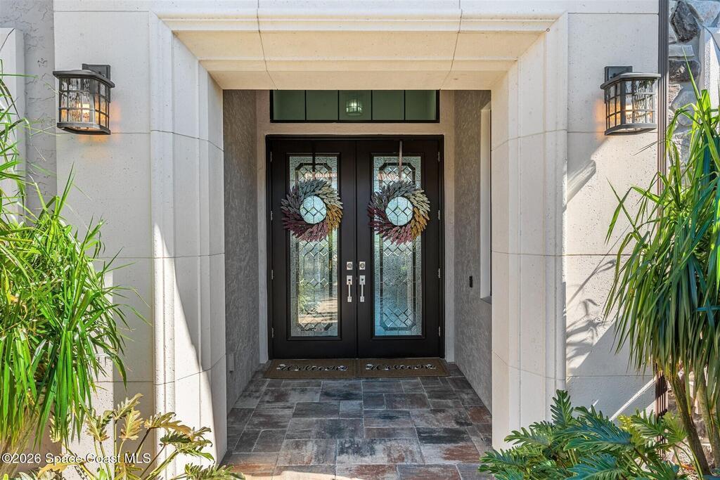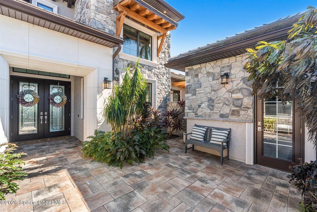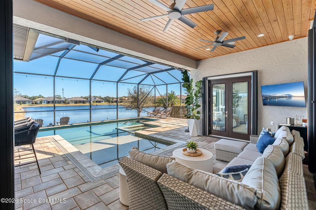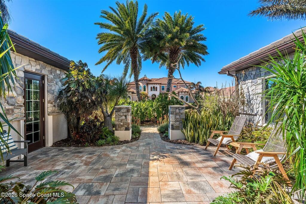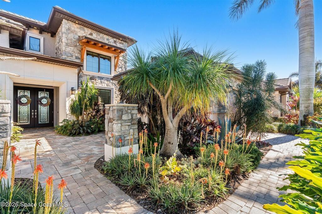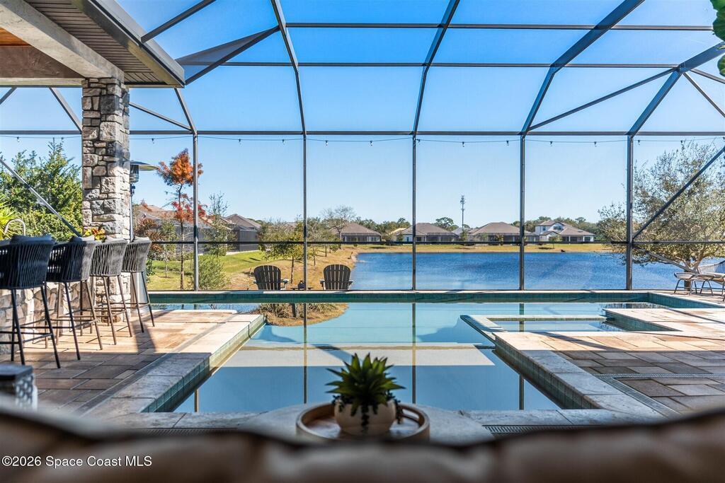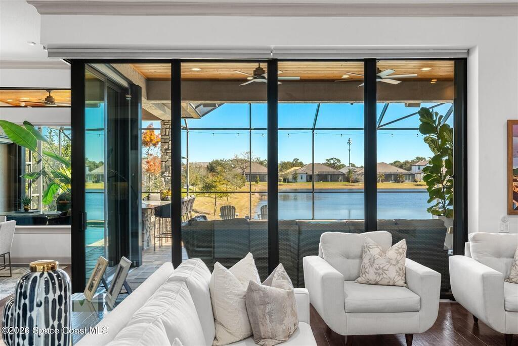 Tucked behind the gates of Suntree's coveted Casabella neighborhood, this stunning modern waterfront residence showcases an open-concept design that effortlessly blends indoor and outdoor living. Offering 3 bedrooms, 3 baths, a private office, bonus/game room, an attached two-car garage plus a detached one-car garage with additional workshop space, the home is perfectly positioned on an east-facing lakefront lot with sweeping water views from nearly every living space. A picturesque stone and brick courtyard framed by dual garages welcomes you to the front entry. Inside, near floor-to-ceiling glass sliders immediately draw the eye to breathtaking lake and pool vistas. Expansive 90-degree disappearing sliders create a seamless transition from the great room and dining area to the lanai, ideal for entertaining. The great room features soaring double tray ceilings, custom cabinetry niches, rich hardwood flooring, and automated blinds for privacy. The chef's kitchen is anchored by an