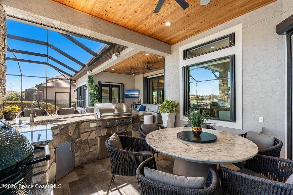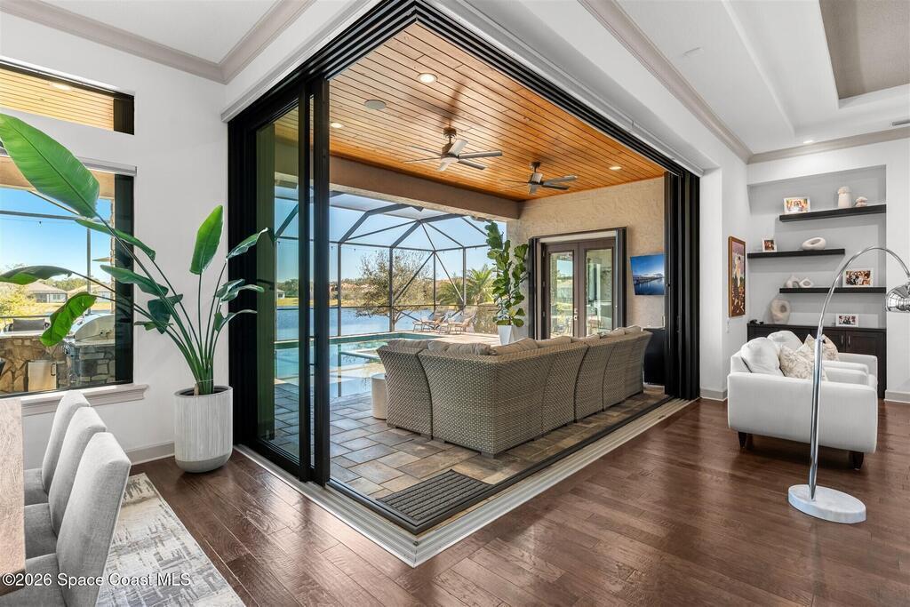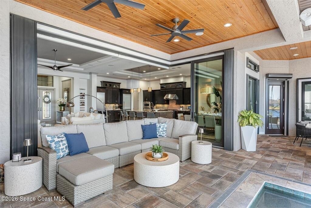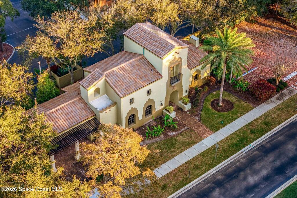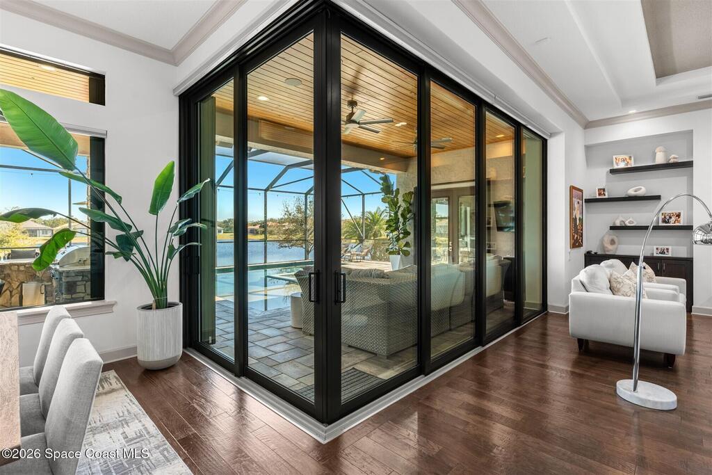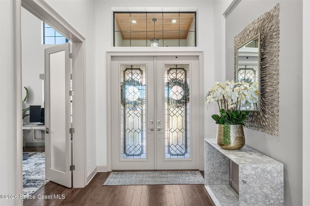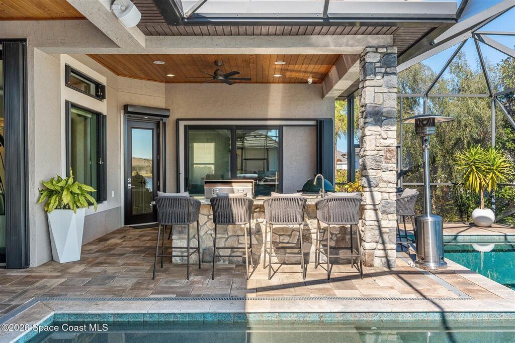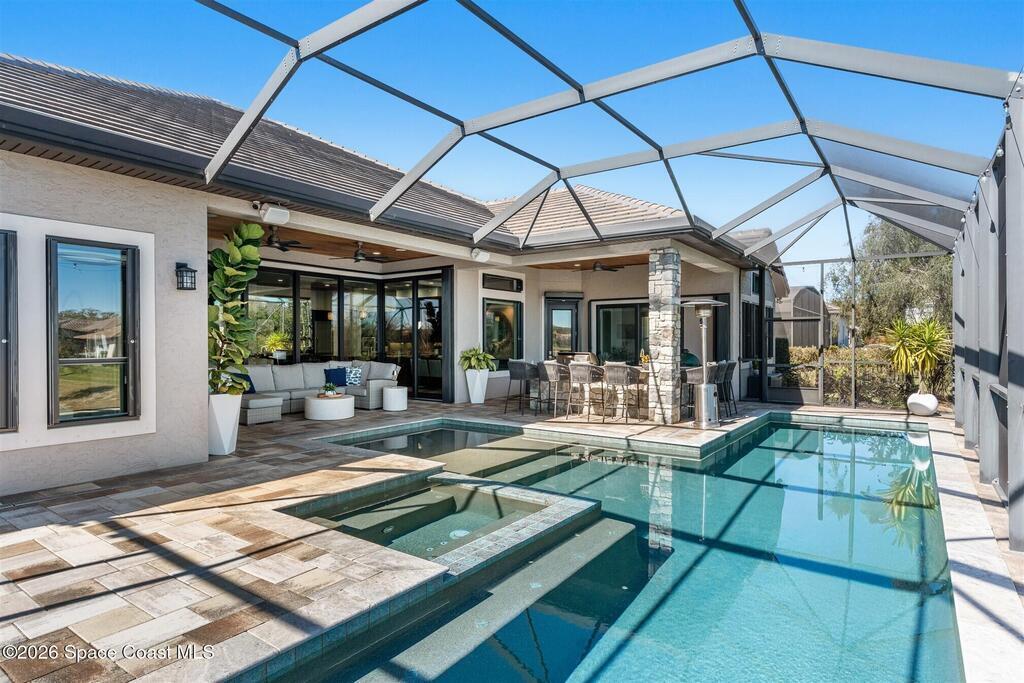 Tucked behind the gates of Suntree's coveted Casabella neighborhood, this stunning modern waterfront residence showcases an open-concept design that effortlessly blends indoor and outdoor living. Offering 3 bedrooms, 3 baths, a private office, bonus/game room, an attached two-car garage plus a detached one-car garage with additional workshop space, the home is perfectly positioned on an east-facing lakefront lot with sweeping water views from nearly every living space. A picturesque stone and brick courtyard framed by dual garages welcomes you to the front entry. Inside, near floor-to-ceiling glass sliders immediately draw the eye to breathtaking lake and pool vistas. Expansive 90-degree disappearing sliders create a seamless transition from the great room and dining area to the lanai, ideal for entertaining. The great room features soaring double tray ceilings, custom cabinetry niches, rich hardwood flooring, and automated blinds for privacy. The chef's kitchen is anchored by an