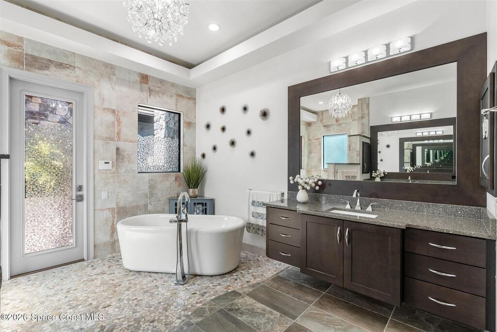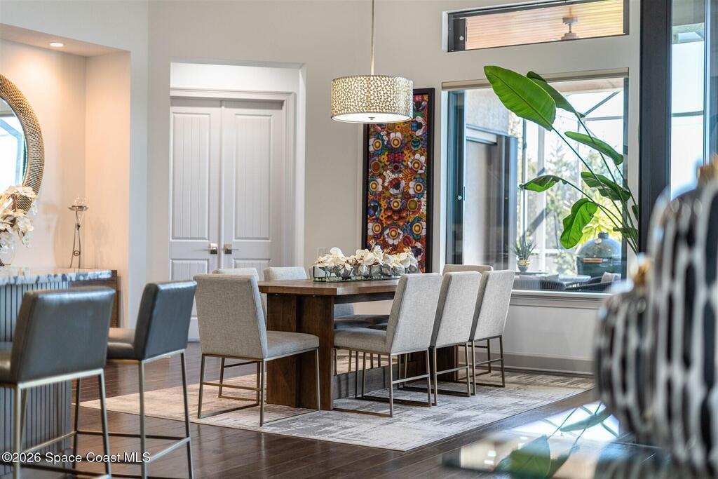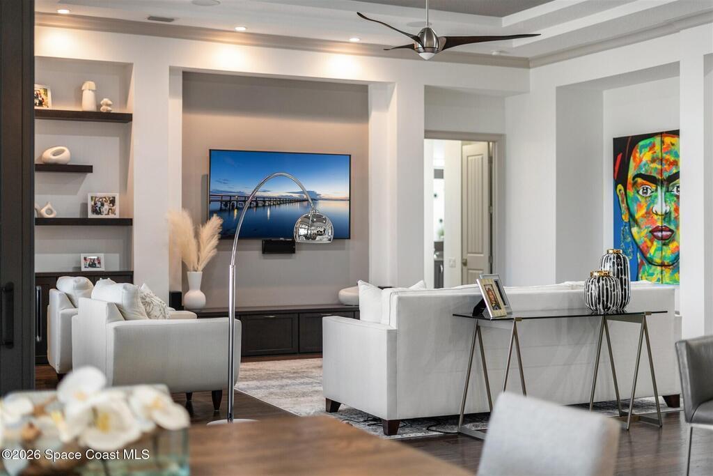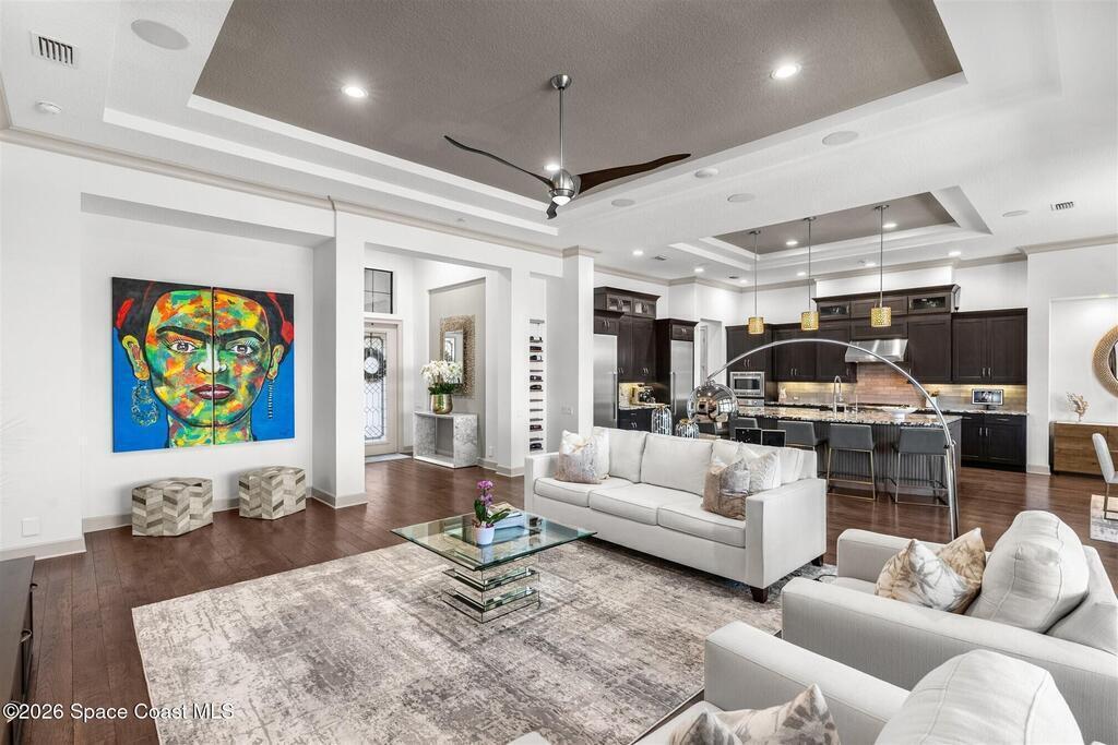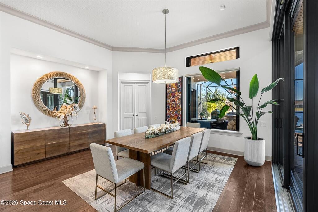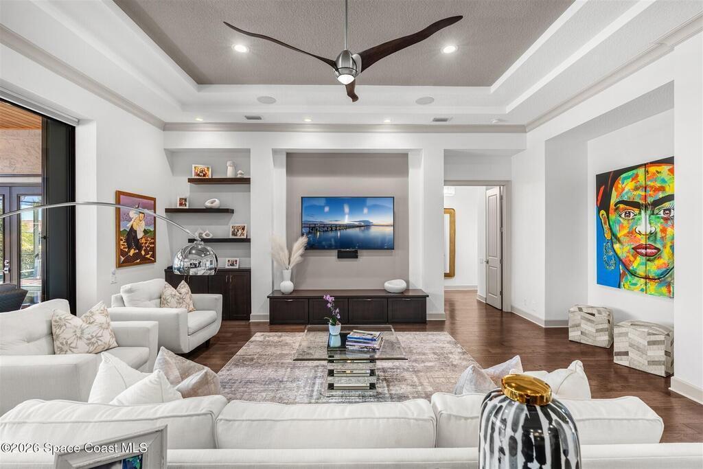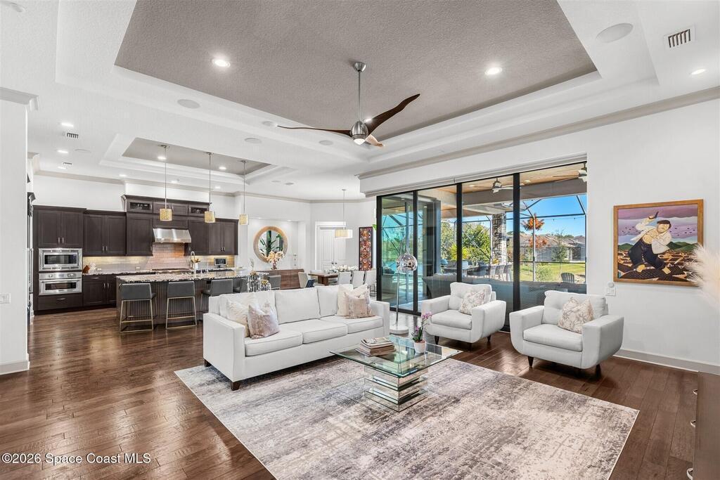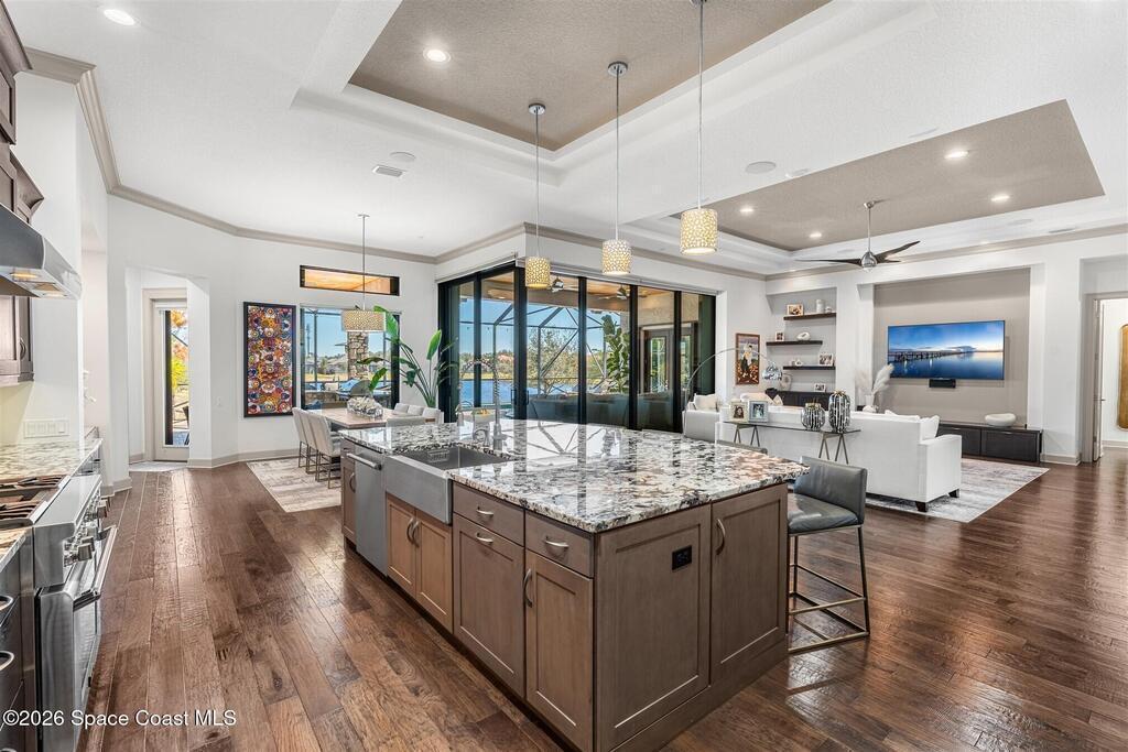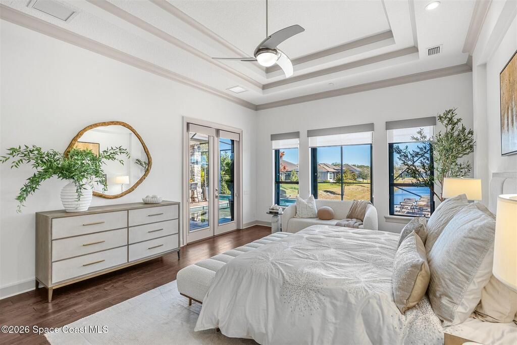 Tucked behind the gates of Suntree's coveted Casabella neighborhood, this stunning modern waterfront residence showcases an open-concept design that effortlessly blends indoor and outdoor living. Offering 3 bedrooms, 3 baths, a private office, bonus/game room, an attached two-car garage plus a detached one-car garage with additional workshop space, the home is perfectly positioned on an east-facing lakefront lot with sweeping water views from nearly every living space. A picturesque stone and brick courtyard framed by dual garages welcomes you to the front entry. Inside, near floor-to-ceiling glass sliders immediately draw the eye to breathtaking lake and pool vistas. Expansive 90-degree disappearing sliders create a seamless transition from the great room and dining area to the lanai, ideal for entertaining. The great room features soaring double tray ceilings, custom cabinetry niches, rich hardwood flooring, and automated blinds for privacy. The chef's kitchen is anchored by an