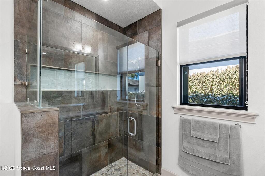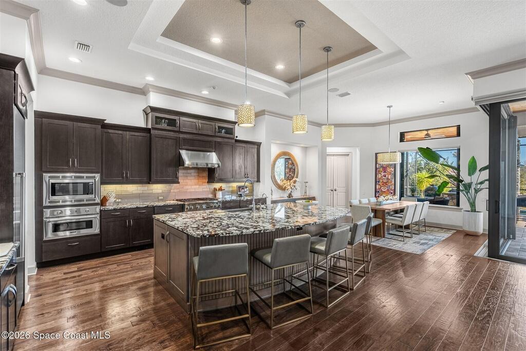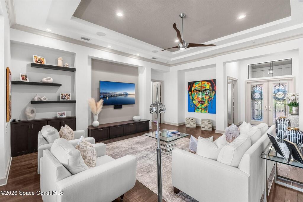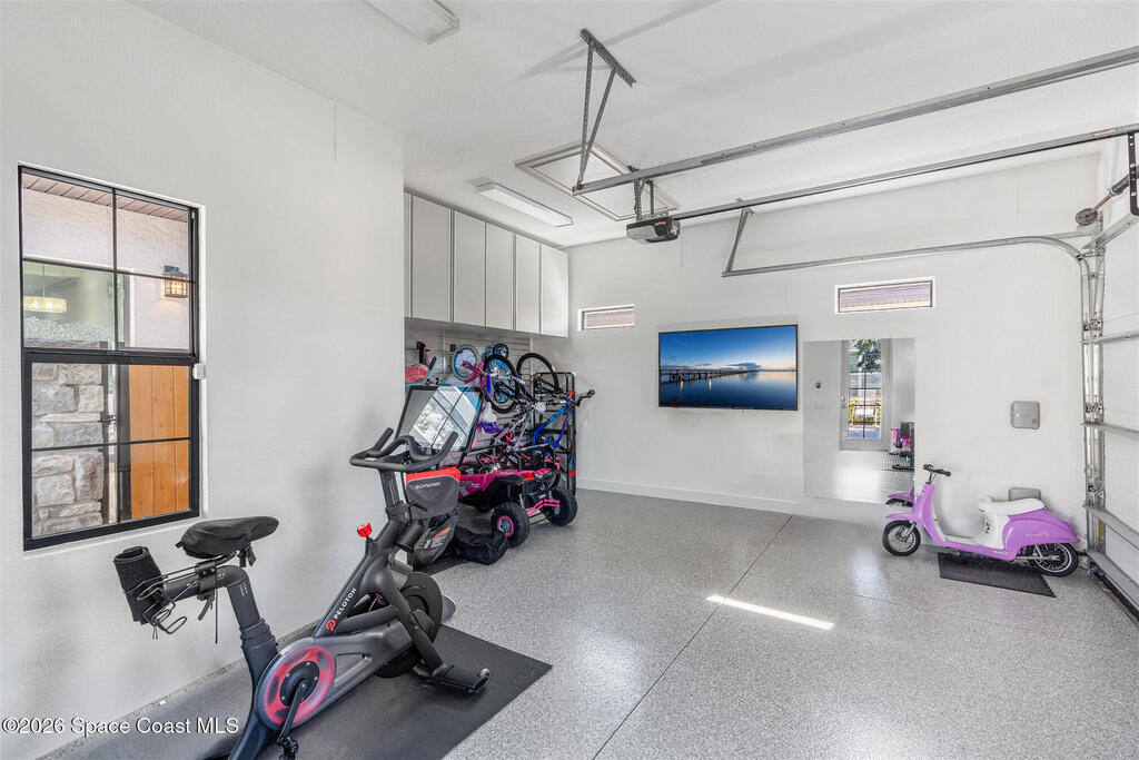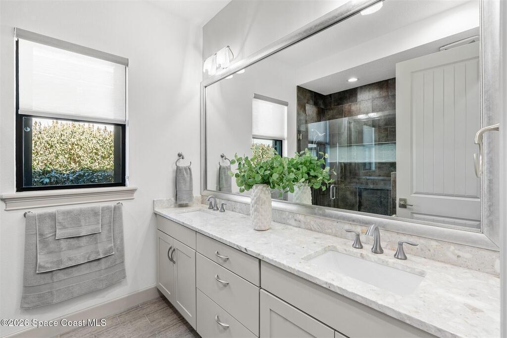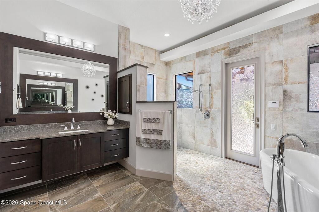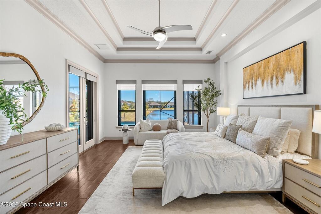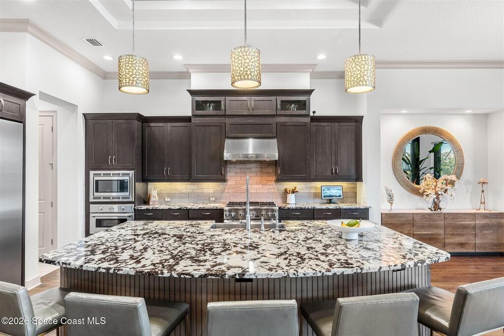 Tucked behind the gates of Suntree's coveted Casabella neighborhood, this stunning modern waterfront residence showcases an open-concept design that effortlessly blends indoor and outdoor living. Offering 3 bedrooms, 3 baths, a private office, bonus/game room, an attached two-car garage plus a detached one-car garage with additional workshop space, the home is perfectly positioned on an east-facing lakefront lot with sweeping water views from nearly every living space. A picturesque stone and brick courtyard framed by dual garages welcomes you to the front entry. Inside, near floor-to-ceiling glass sliders immediately draw the eye to breathtaking lake and pool vistas. Expansive 90-degree disappearing sliders create a seamless transition from the great room and dining area to the lanai, ideal for entertaining. The great room features soaring double tray ceilings, custom cabinetry niches, rich hardwood flooring, and automated blinds for privacy. The chef's kitchen is anchored by an