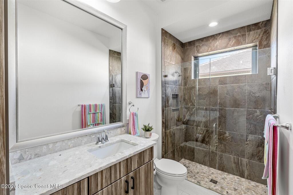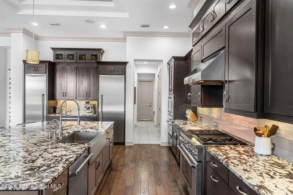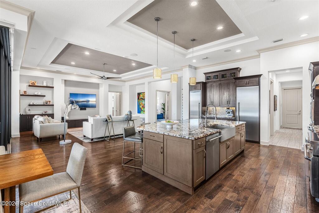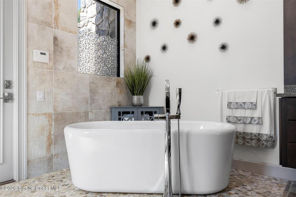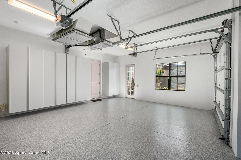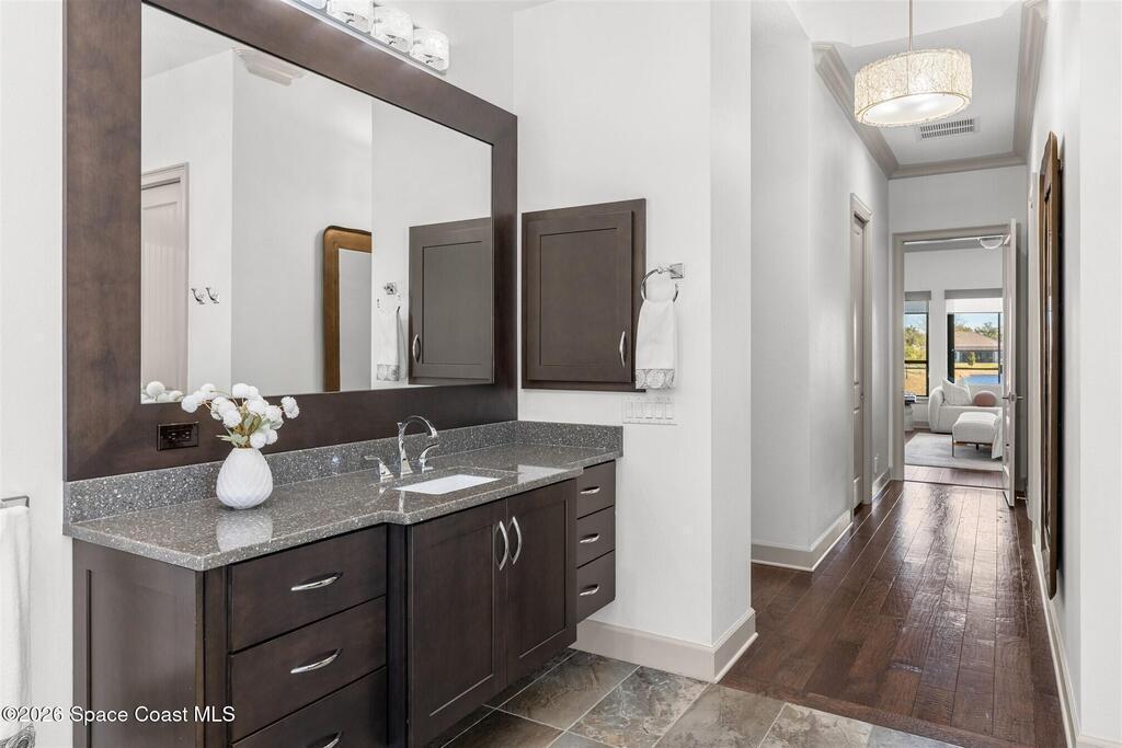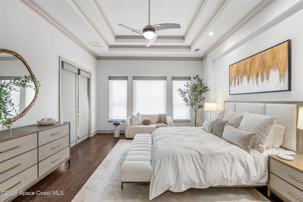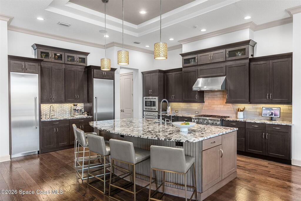 Tucked behind the gates of Suntree's coveted Casabella neighborhood, this stunning modern waterfront residence showcases an open-concept design that effortlessly blends indoor and outdoor living. Offering 3 bedrooms, 3 baths, a private office, bonus/game room, an attached two-car garage plus a detached one-car garage with additional workshop space, the home is perfectly positioned on an east-facing lakefront lot with sweeping water views from nearly every living space. A picturesque stone and brick courtyard framed by dual garages welcomes you to the front entry. Inside, near floor-to-ceiling glass sliders immediately draw the eye to breathtaking lake and pool vistas. Expansive 90-degree disappearing sliders create a seamless transition from the great room and dining area to the lanai, ideal for entertaining. The great room features soaring double tray ceilings, custom cabinetry niches, rich hardwood flooring, and automated blinds for privacy. The chef's kitchen is anchored by an