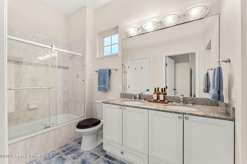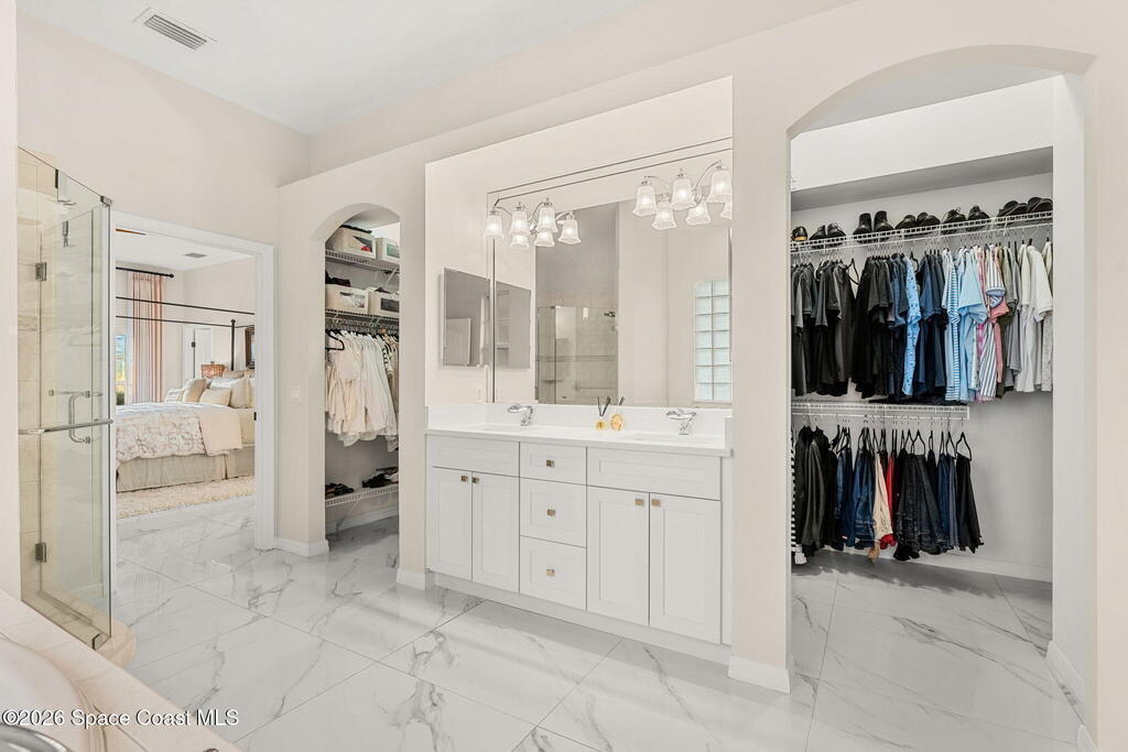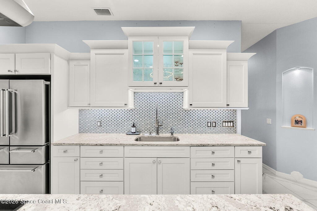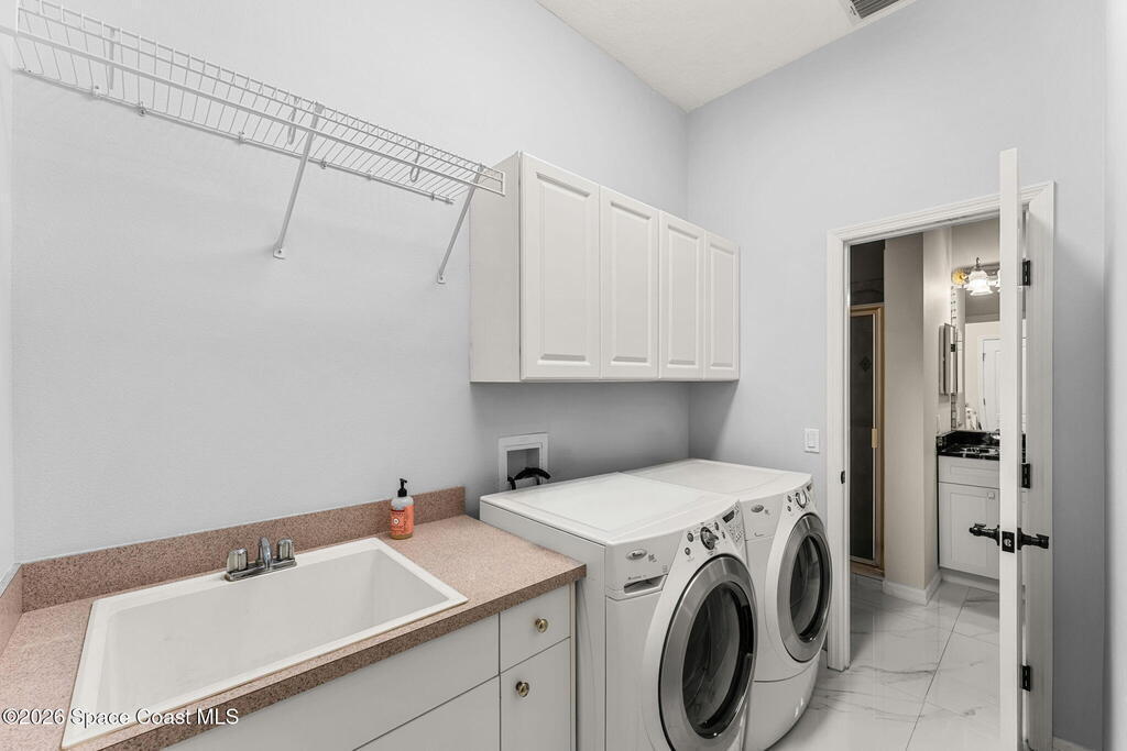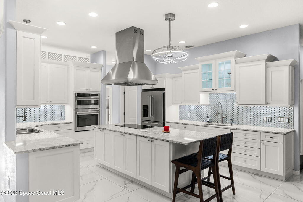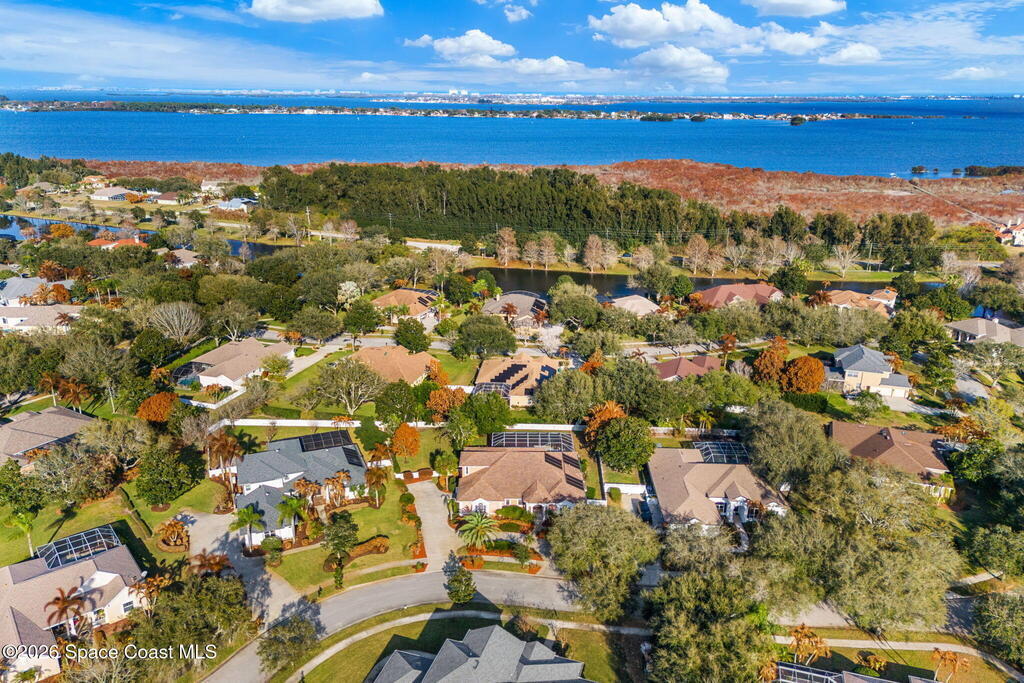 Set on a private 1/2-acre estate between the rivers in South Merritt Island, this light-filled coastal residence offers refined luxury living designed for entertaining & elegance. Arrive via a sweeping circular drive & step into open, sophisticated spaces enhanced by stunning 3' x 3' polished porcelain tile. Featuring 5 bedrooms, 3.5 baths, & spacious upstairs flex room ideal as a 6th bedroom, executive office, or media room. The private primary wing includes an adjoining flex space perfect for a nursery, dressing room, or study. The showstopping chef's kitchen is the heart of the home, appointed with SS appliances, double ovens, double sinks, professional-grade cooktop, an impressive 9-ft island, quartz tops, custom backsplash, Butler's pantry, and maple cabinetry. Outdoor living shines with an oversized screened lanai, summer kitchen, solar-heated pool, outdoor shower, fenced yard & lush fruit trees. Oversized garage, newer roof, & updated systems complete this exceptional offering.