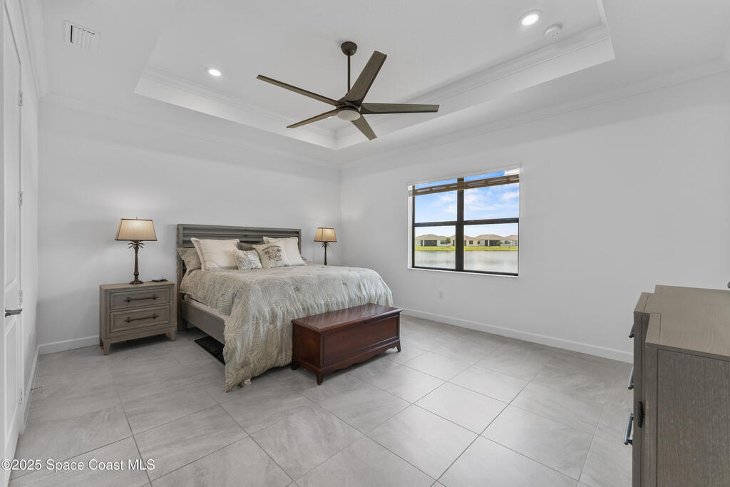 Rare TREVISO floor plan complete with many upgrades including IMPACT WINDOWS and wide waterfront lot with a south facing direction. You will love the views! 3 well separated bedrooms PLUS a generous sized office PLUS a 12 x 12 FLEX ROOM. ! Beautiful tile throughout/no carpet. High ceilings, upgraded kitchen backsplash, lighting, ceiling fans, crown moulding, blinds, and more. Primary bedroom , bath and closet are very spacious and on one side of the home while 2nd and 3rd bedrooms (one is en- suite) plus office /flex room are on the opposite side of the home. Utility room is off the kitchen and opens into very spacious 3 car garage. Come enjoy all that Bridgewater has to offer, from a world class pool to pickleball courts, bocce, billiards, movie theater, coffee lounge to gathering rooms to enjoy community activities with friends. Love the lifestyle; love your new home!