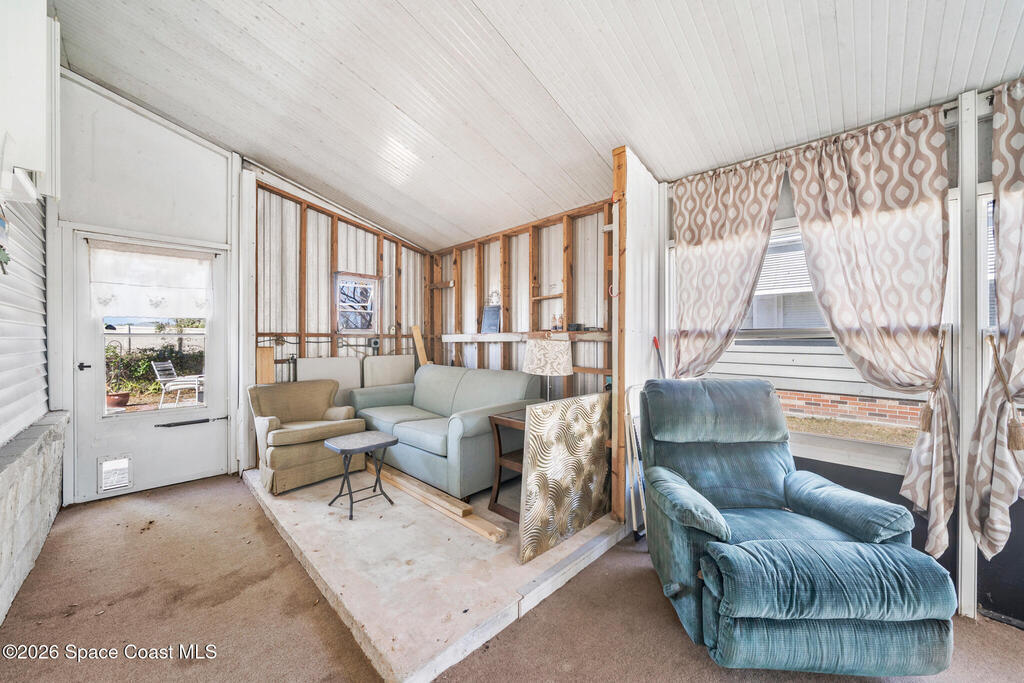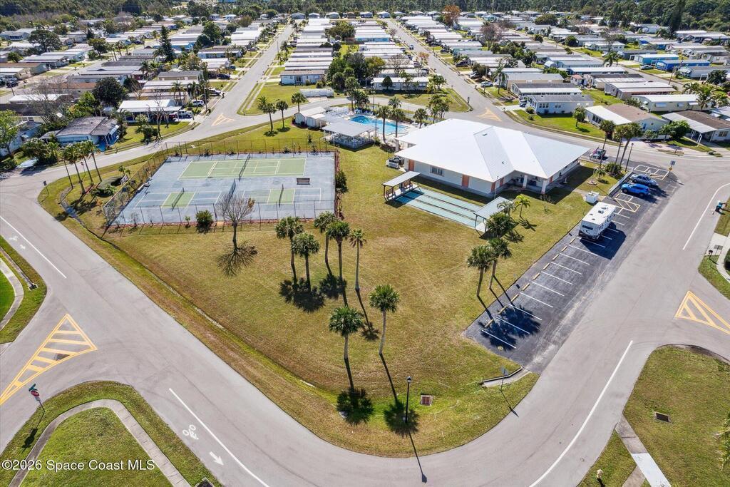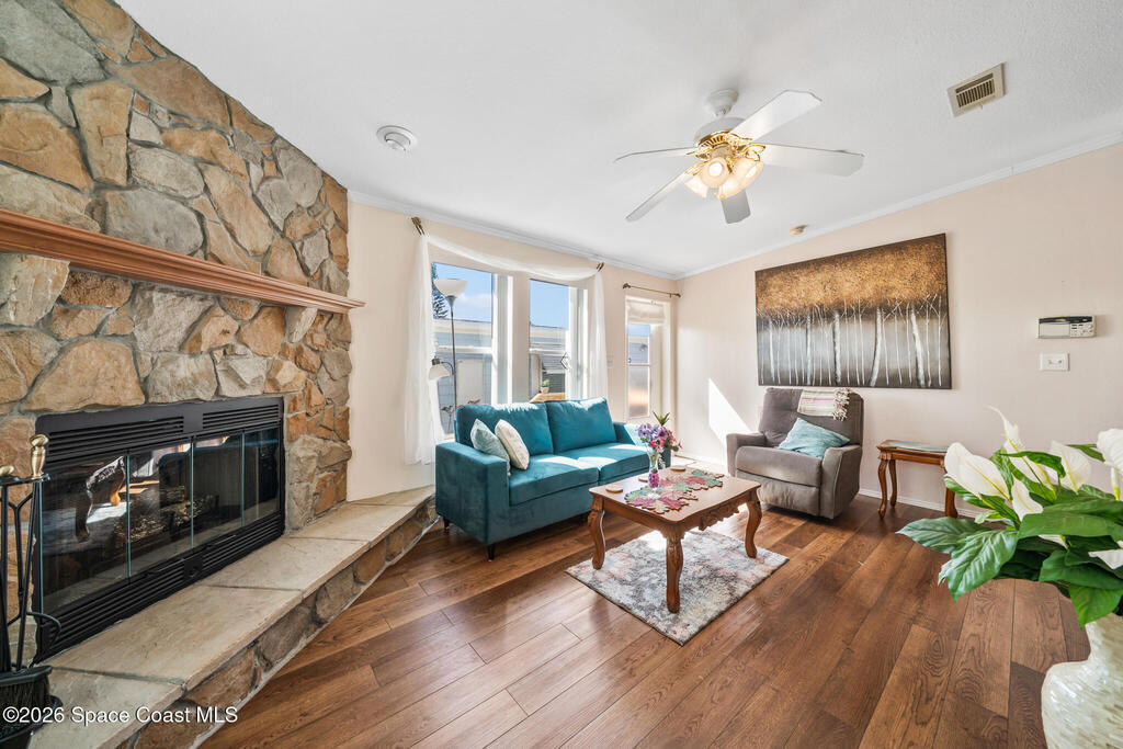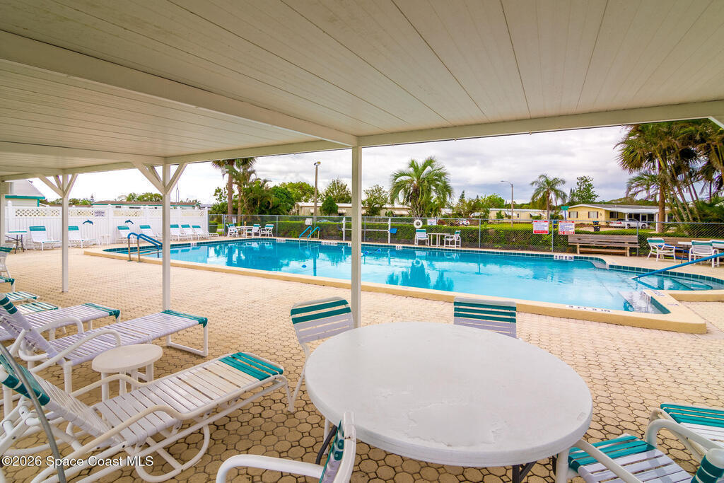 Palm Bay Colony is a 55+ community offering an active clubhouse, heated pool, pickleball, shuffleboard, tennis, and fitness center, and here, you don't just own the home, you own the land. This well-kept 2-bedroom, 2-bath home features vaulted ceilings, laminate flooring in the main living areas, and a stone wood-burning fireplace that anchors the space. The beautiful, updated kitchen offers solid wood cabinetry and opens comfortably to the dining and living areas. An in-home laundry closet is tucked into the second bathroom, and the washer & dryer stay. The primary suite includes a walk-in shower and generous counter space. Outside, enjoy a FL room, covered carport, storage shed, and a fully fenced backyard with mature trees and patio space - easy to maintain and enjoy Florida living. Conveniently located near shopping, dining, and the beaches. The $1, 500 Palm Bay Colony membership has already been paid by the current owner and transfers to you, and the ongoing fee is just $45/month.