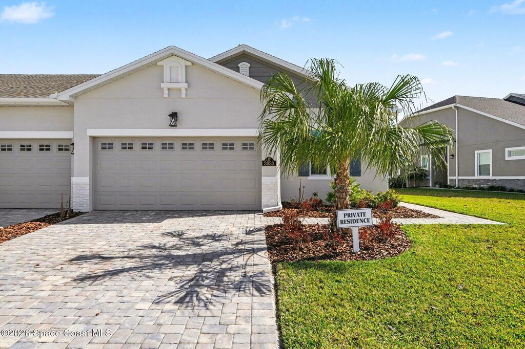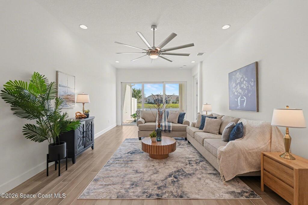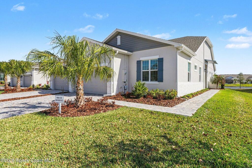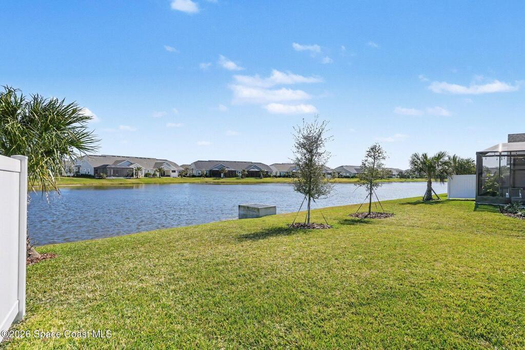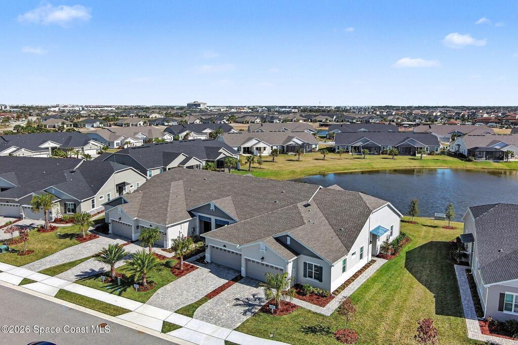 Enjoy stunning water views from the extended back porch of this never-lived-in 2025 Montgomery II end-unit townhome in sought-after Viera. This beautifully upgraded single-story home offers 3 BD, 2 BA, 2-car garage, blending modern design w/ easy living! Beautiful flooring throughout, including primary suite. The open kitchen, dining area & family room serves as the heart of the home, featuring quartz countertops, gas range, stainless-steel appliances--perfect for entertaining. Impact glass windows! OPEN & SPACIOUS FLOOR PLAN! Primary suite includes a large walk-in closet & shower w/ seat. HOA covers exterior maintenance, roof replacement, and lawn care for true low-maintenance living. Enjoy resort-style amenities at Addison Village, including pools, tennis, basketball, and pickleball courts- just a couple of blocks away! Conveniently located 45 minutes to Orlando & 20 minutes to the beach. Why wait to build when this upgraded, move-in-ready with premium views is ready for you now?!