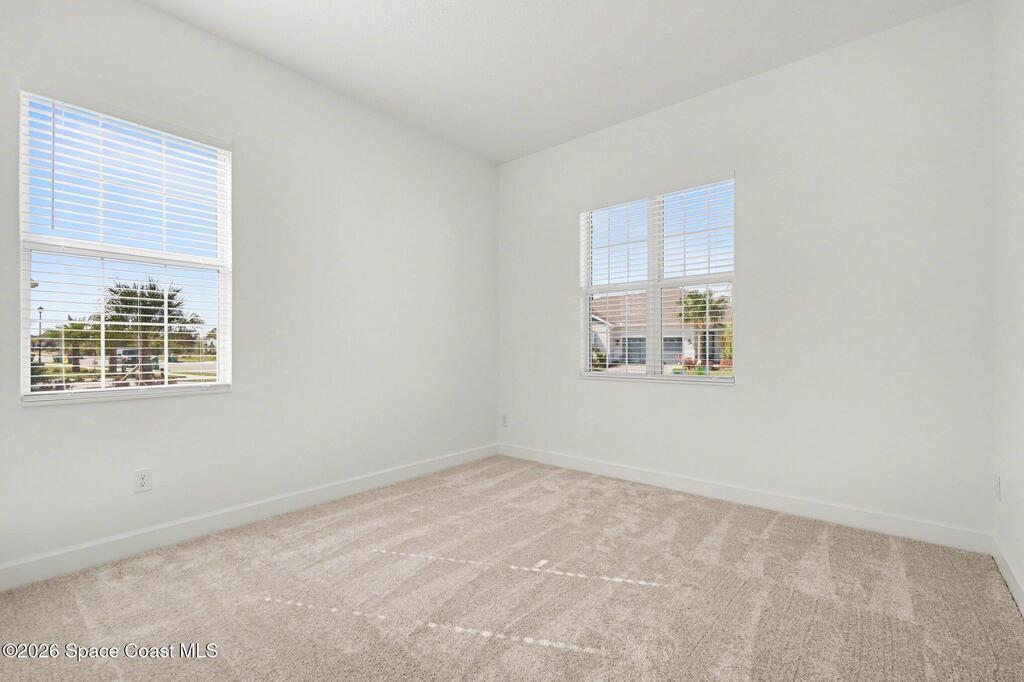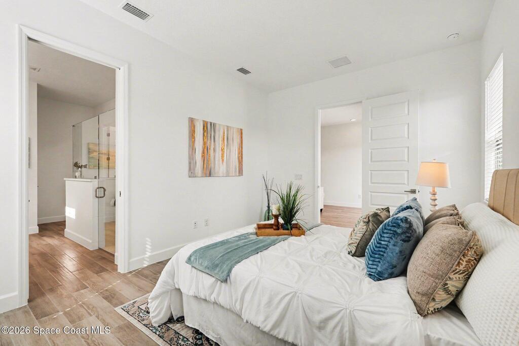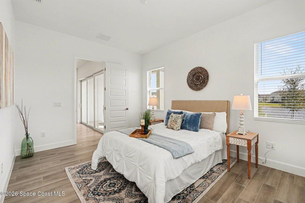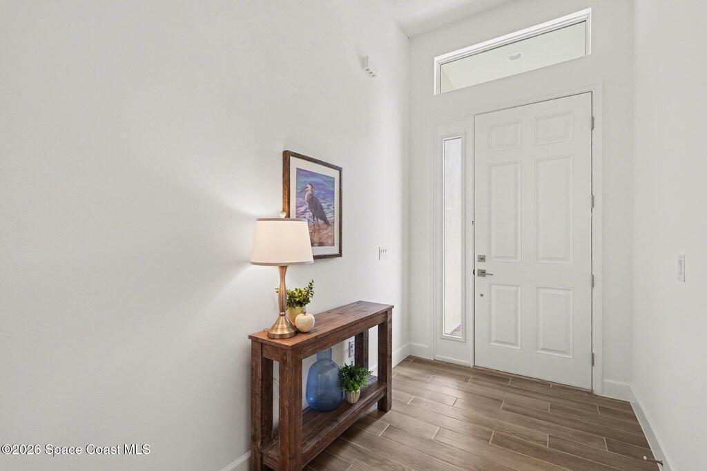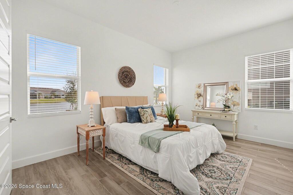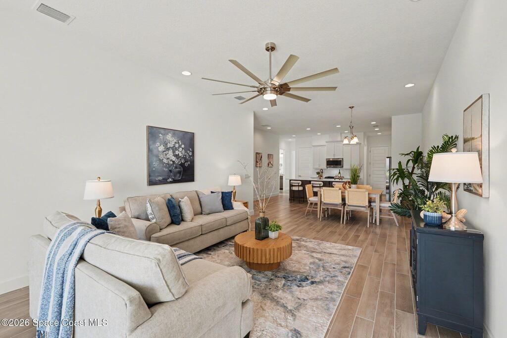 Enjoy stunning water views from the extended back porch of this never-lived-in 2025 Montgomery II end-unit townhome in sought-after Viera. This beautifully upgraded single-story home offers 3 BD, 2 BA, 2-car garage, blending modern design w/ easy living! Beautiful flooring throughout, including primary suite. The open kitchen, dining area & family room serves as the heart of the home, featuring quartz countertops, gas range, stainless-steel appliances--perfect for entertaining. Impact glass windows! OPEN & SPACIOUS FLOOR PLAN! Primary suite includes a large walk-in closet & shower w/ seat. HOA covers exterior maintenance, roof replacement, and lawn care for true low-maintenance living. Enjoy resort-style amenities at Addison Village, including pools, tennis, basketball, and pickleball courts- just a couple of blocks away! Conveniently located 45 minutes to Orlando & 20 minutes to the beach. Why wait to build when this upgraded, move-in-ready with premium views is ready for you now?!
