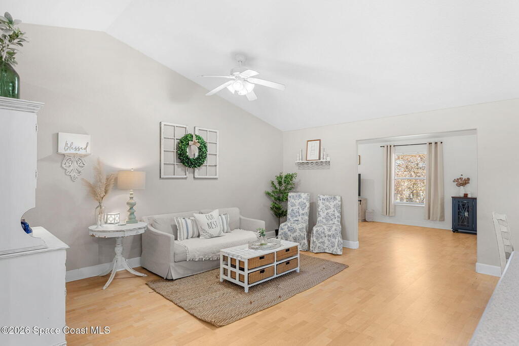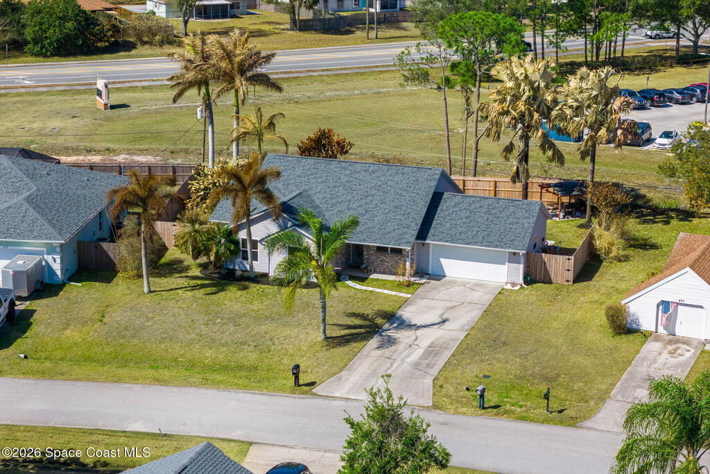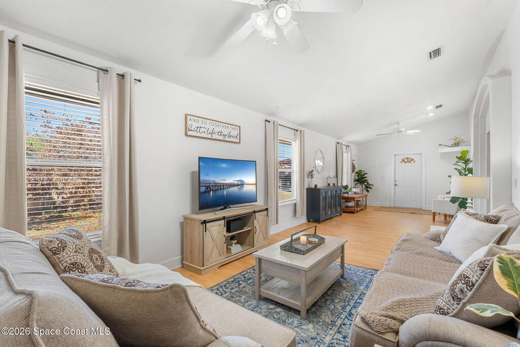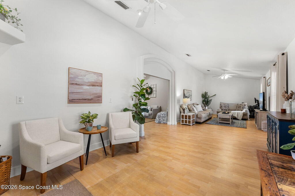 Welcome home to 449 Gilbert Drive NE in the heart of Central Palm Bay, where space, light, and comfort come together beautifully.Pulling up, you'll immediately notice the inviting curb appeal--mature palms, a wide driveway, and a side-entry two-car garage set on a generous .27-acre lot. This is the kind of property that gives you breathing room, with a fully fenced backyard and no HOA to limit your lifestyle.Step inside and you're greeted by soaring vaulted ceilings and warm wood-look laminate flooring that flows through the main living areas. The open floor plan creates an airy, expansive feel from the moment you enter. Rounded archways and soft natural light give the home character and warmth, while the layout offers flexibility for the way you live.The kitchen truly anchors the home. Crisp white cabinetry, new major kitchen appliances (May 2024), generous counter space, and a breakfast bar make it both functional and welcoming.