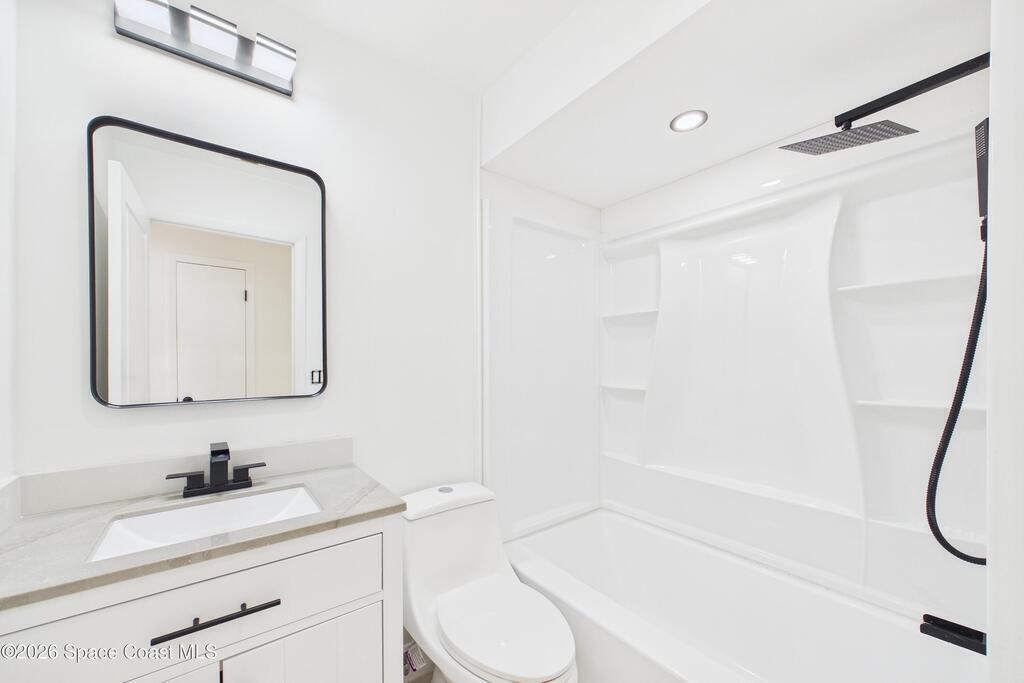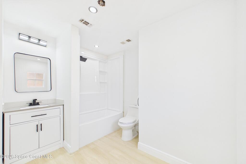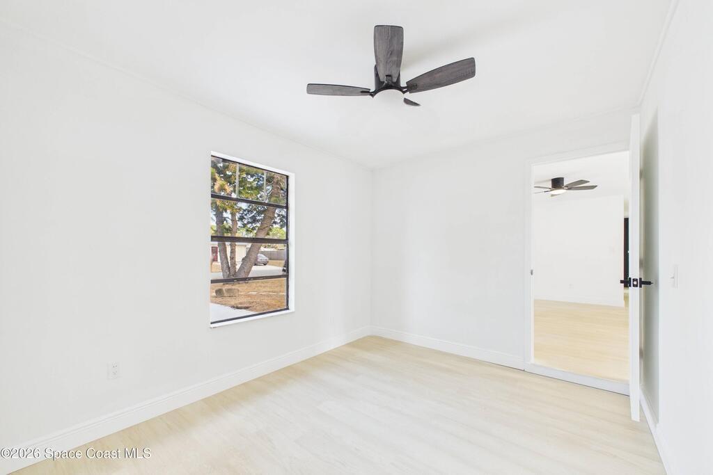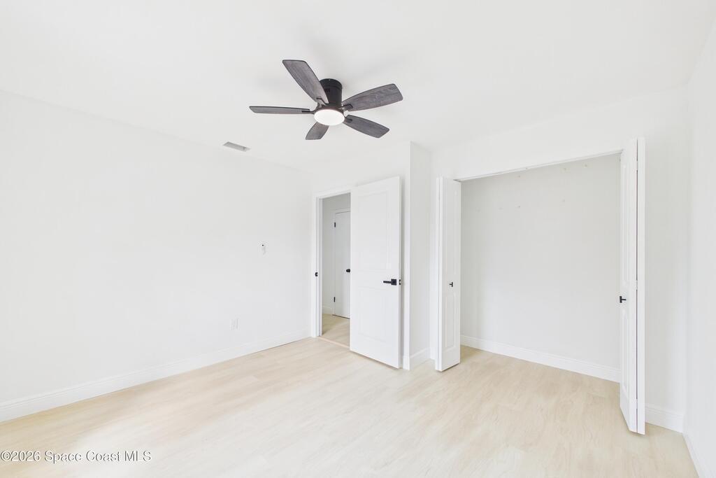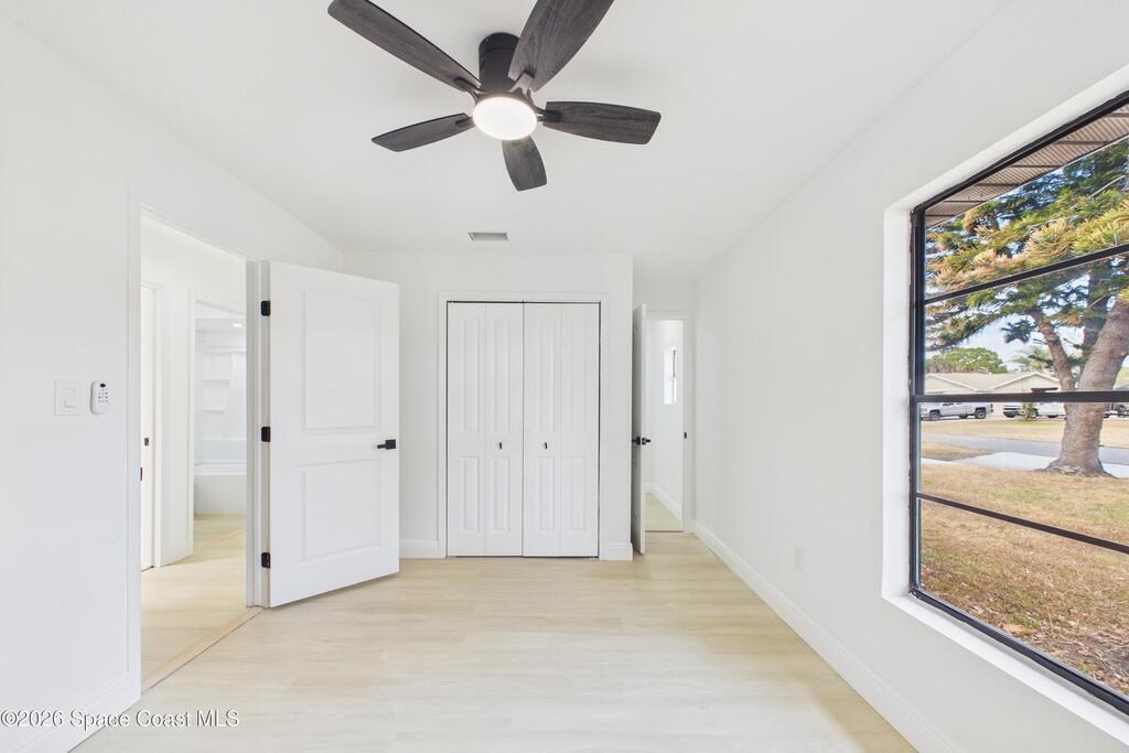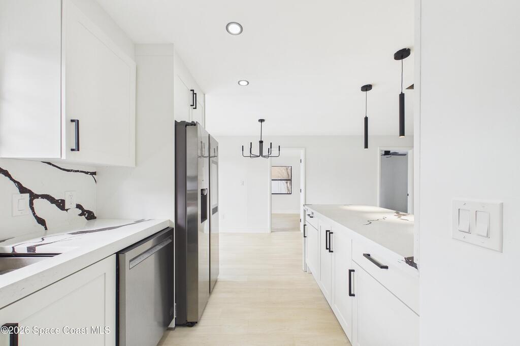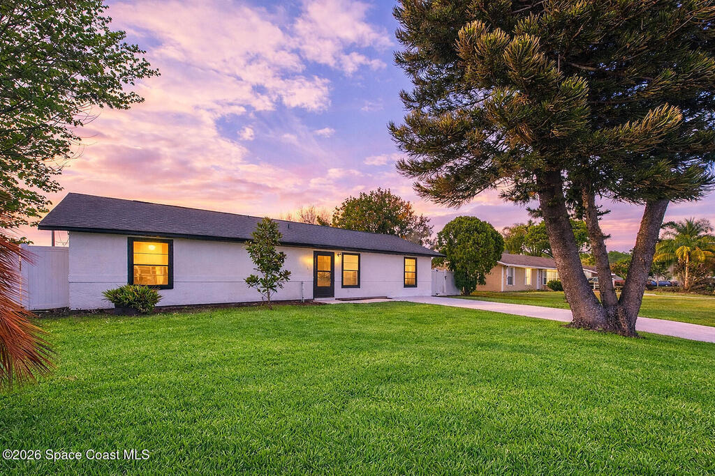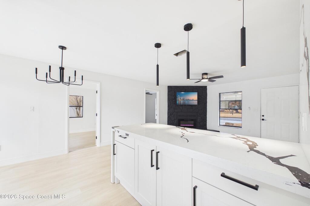 Fully renovated 4 bedroom, 2 bathroom POOL home in Port St. John offering move in ready living with modern and sleek finishes throughout. This single story concrete block home features an open concept floor plan, luxury vinyl plank flooring, new AC, and a stylish electric fireplace that anchors the main living area. The redesigned kitchen showcases custom cabinetry, Calacatta quartz countertops, Samsung stainless steel smart appliances, and pendant lighting over a large breakfast bar, ideal for gatherings. Both bathrooms are beautifully updated with clean, contemporary design. Roof replaced in 2018, with a partial re roof completed in 2025 during chimney removal, adding value and peace of mind. Enjoy Florida outdoor living in your fully fenced backyard with white PVC privacy fence, 28 ft in ground pool, new pool pump, and brand new exterior electrical panel, plus generous yard space for entertaining, pets, and play.