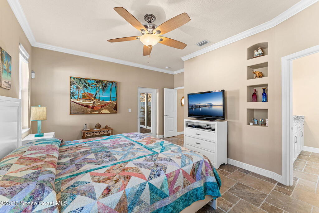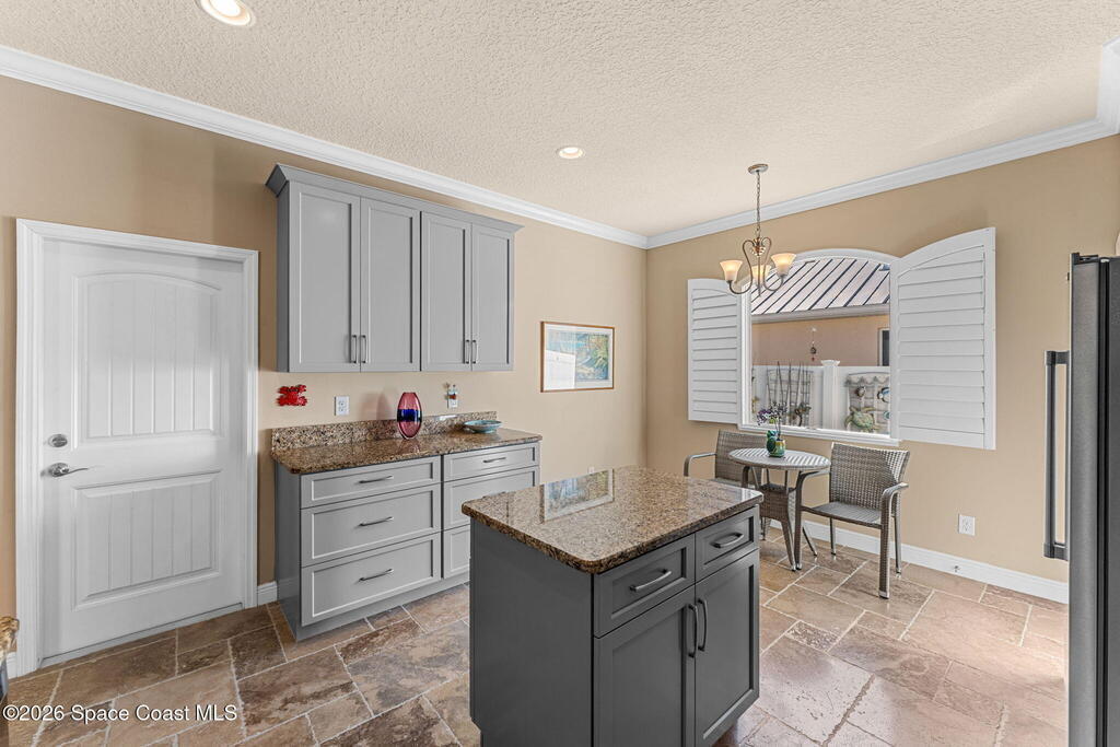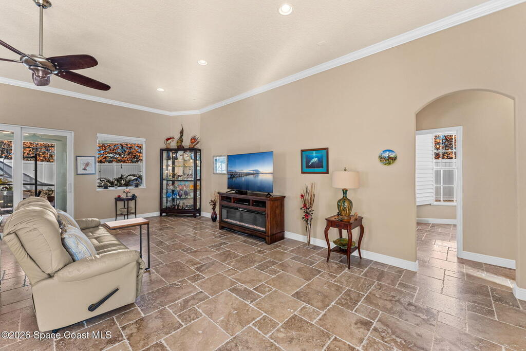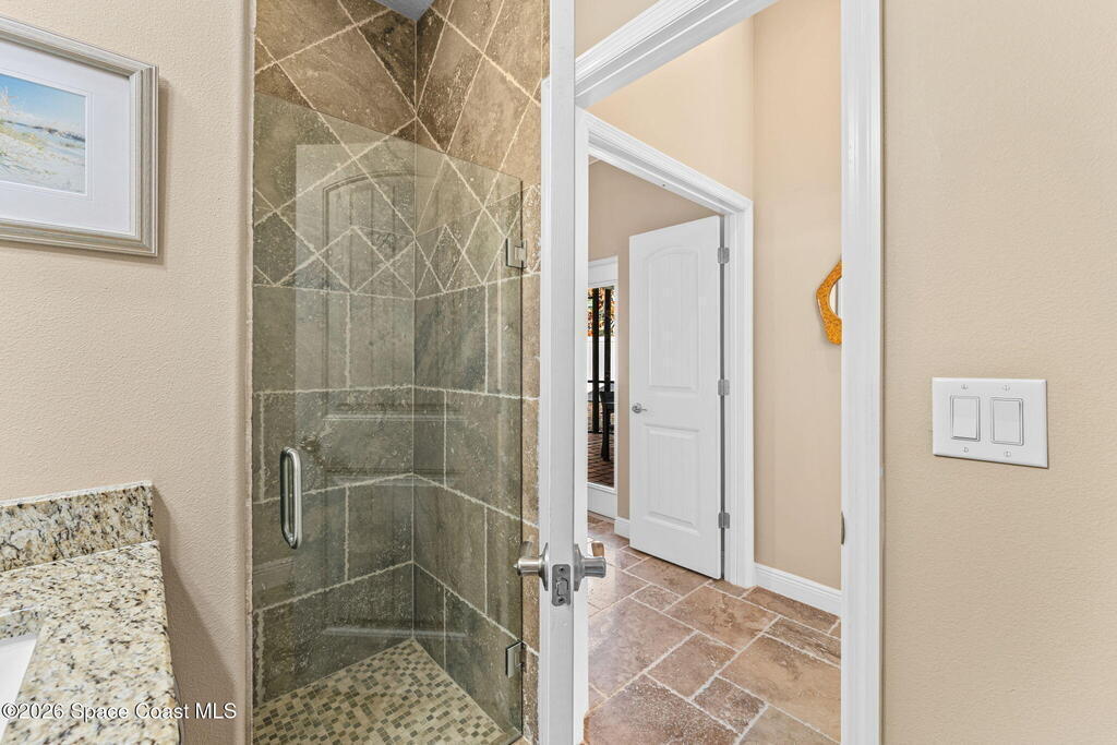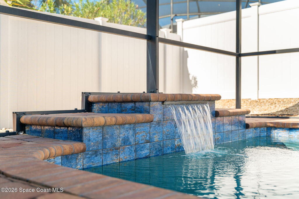 Built in 2014 and just steps from the ocean, this meticulously maintained 3-bedroom, 3-bathroom pool home in Cocoa Beach offers the rare combination of location, condition, and structural quality. With only one owner and lightly lived in, the home shows like new. No pets, no smoking, and no shoes worn inside reflect the exceptional level of care throughout. Inside, soaring ceilings create an open and airy feel. The home features 100% travertine flooring throughout -- including floors, showers, and full bath walls -- along with granite countertops, six-panel solid wood doors, solid vinyl plantation shutters, and a Kohler jetted garden tub in the primary suite. An alarm system is already in place for added security.