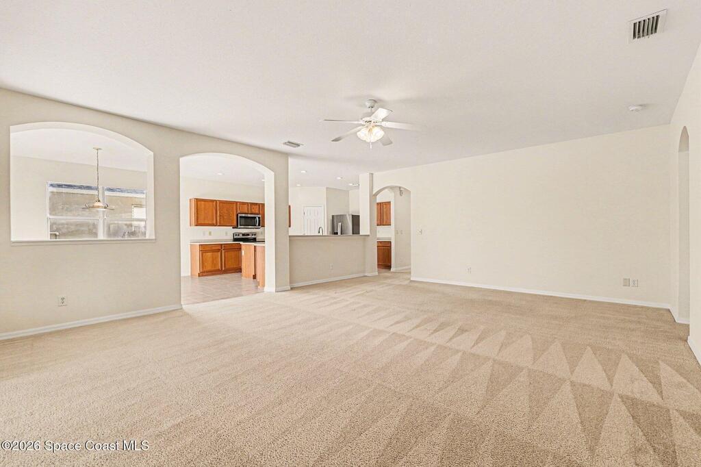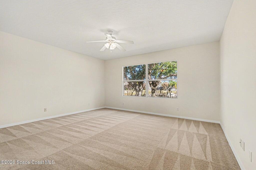 Beautifully maintained home with low annual HOA fees and numerous recent updates! Freshly painted inside and out -- including garage walls and floor -- this move-in ready property features new LVP flooring in the formal dining room, ceiling fans in every room, and a convenient inside laundry room. The open family room flows seamlessly from the kitchen, showcasing stainless steel appliances, Corian countertops, oak cabinetry with an island, abundant storage, recessed lighting, and a walk-in pantry. The spacious owner's suite offers dual sinks, a walk-in closet, glass shower, and relaxing Roman tub. Step outside to a large screened and covered lanai overlooking a tranquil neighborhood pond with fresh mulch and beautiful Oak tree. Major systems -- roof, HVAC, and water heater -- are all newer than fall of 2024. This home is located in Sandhill Trace in desirable Grand Haven off the Pineda Extension and perfect for I-95 travel, the new Costco, grocery markets, and other daily conveniences.