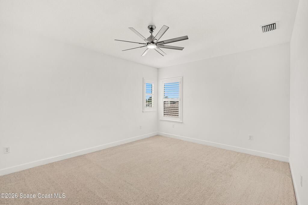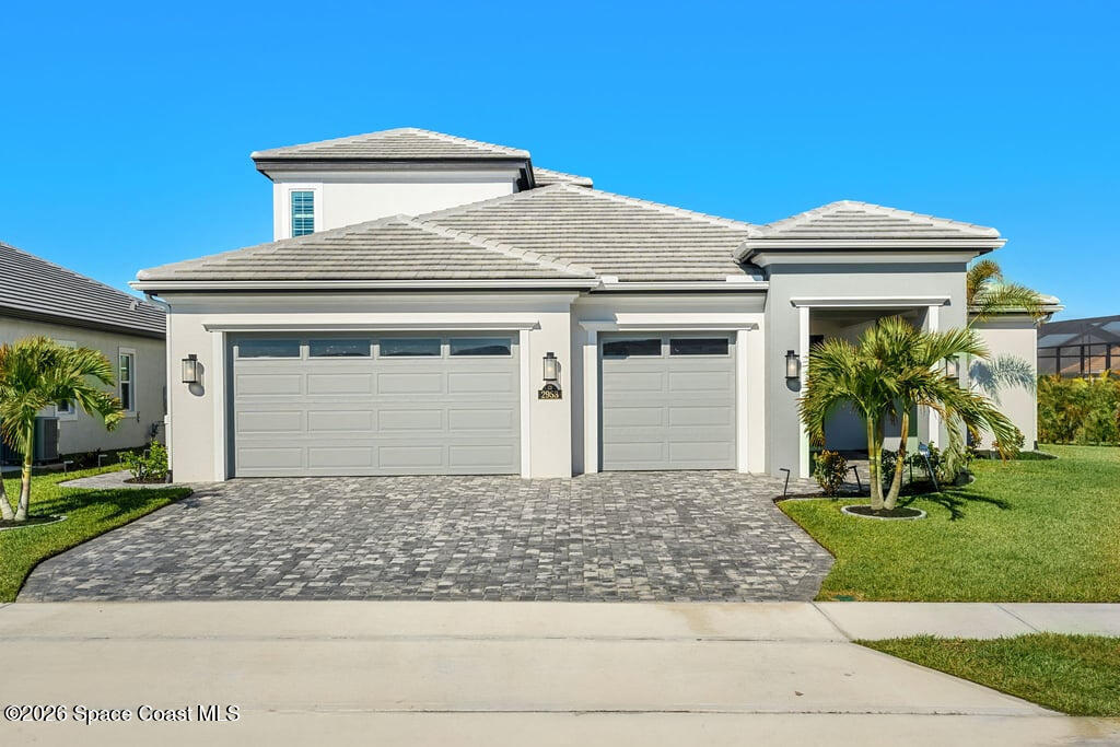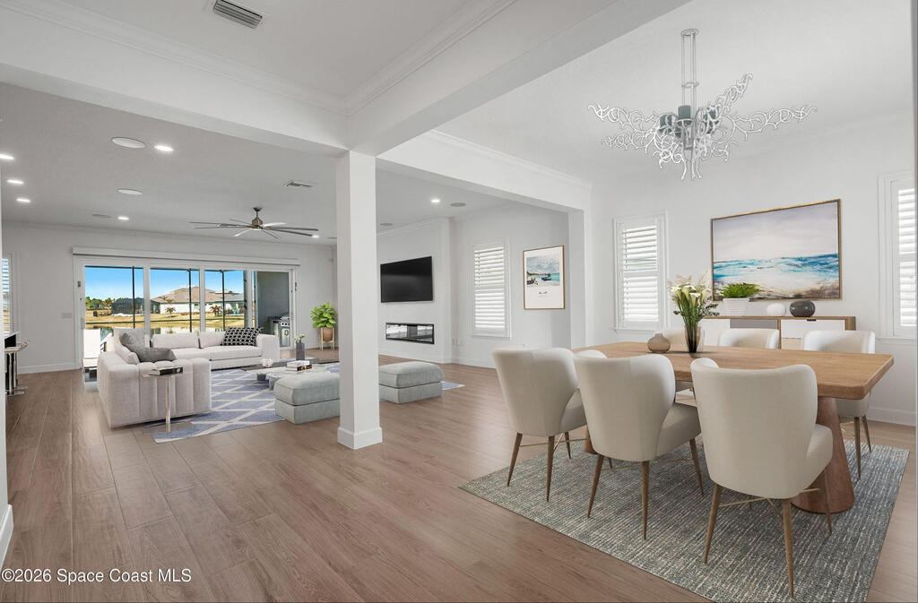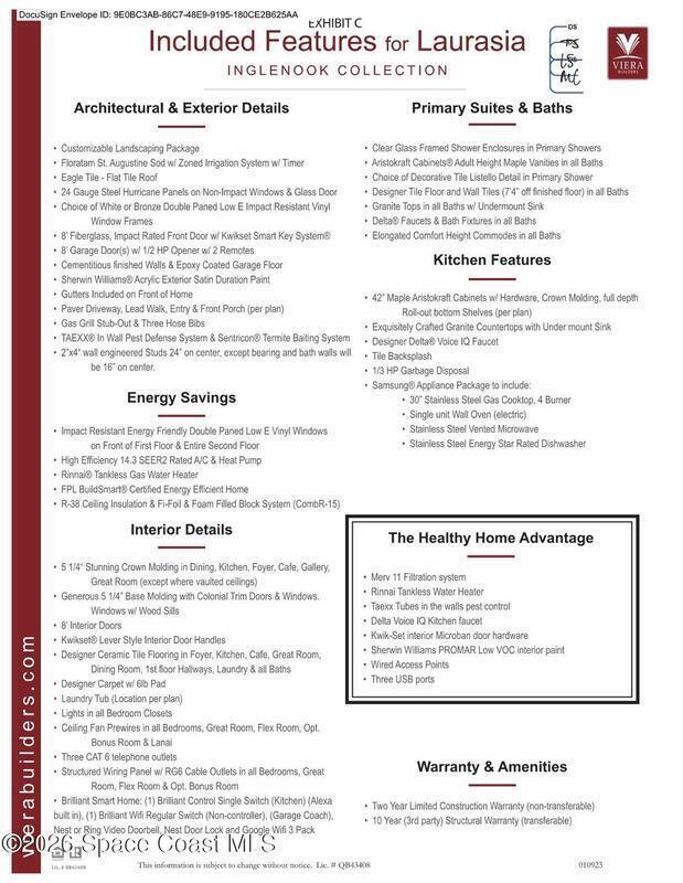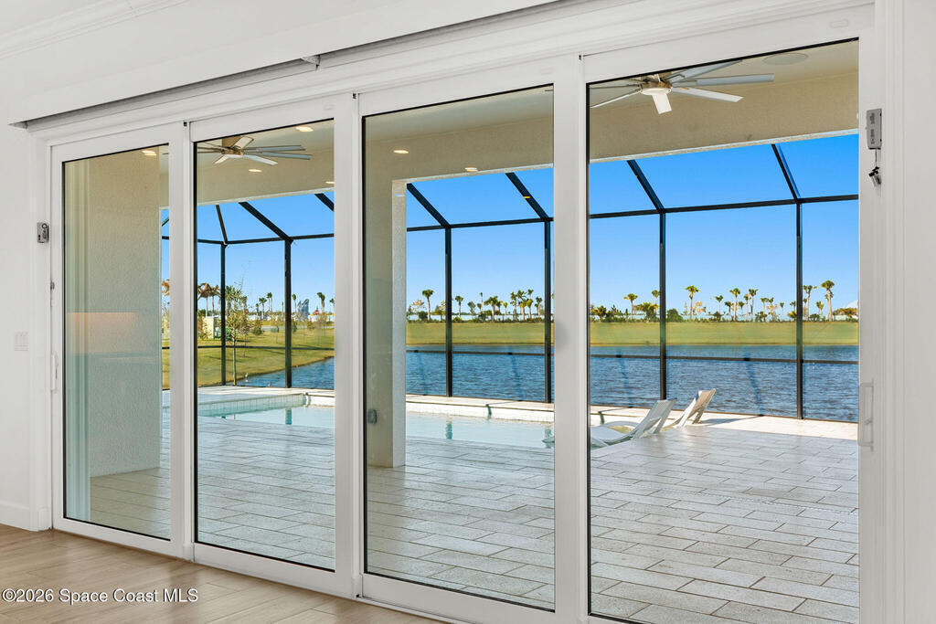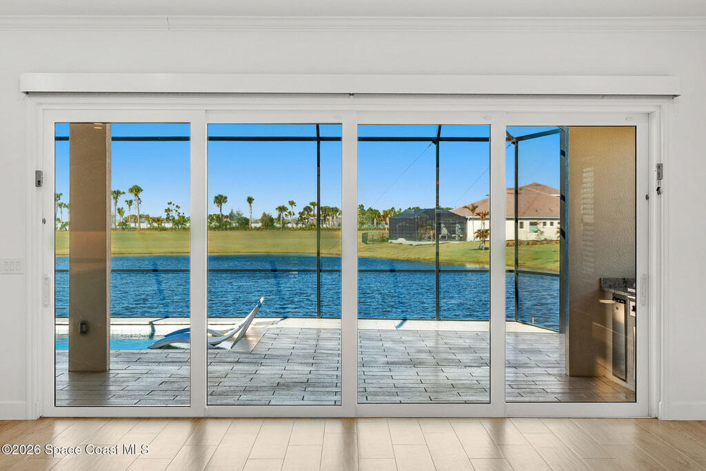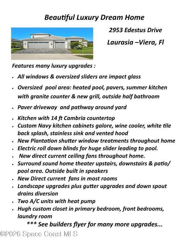 Beautiful, luxury home in Laurasia Viera's newest upscale community. Spectacular water views from this very open floor plan: heated salt water pool surrounded by spacious paver deck, covered lanai, summer kitchen, granite counters & grill. Upgrades:impact windows & sliders, plantation shutters, electric blinds for sliders, ceiling fans, , surround sound inside & out, designer ceramic tile flooring. Gourmet kitchen:breathtaking 14 ft Cambria island & countertops, tons of cabinets, tile backsplashes, stainless steel appliances, opens to a huge living room with electric fireplace, TV hookup & spacious dining room. Dream primary bedroom;custom closet, bath in clean white: ample cabinets, double sink counter, luxurious tiled walk-in shower with glass panels.Just off the main area 2nd bedroom/office & bathroom.3rd bedroom, bath & custom closets. Downstairs laundry. UPSTAIRS:oversized bonus room, bedroom, full bath, closet, storage space. Do not miss the upgrade sheets in the photos. Come live the dream.