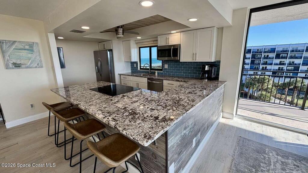 Welcome to this beautifully updated 6th-floor corner residence offering sweeping ocean views and an open-concept layout designed for light-filled coastal living. This 1, 600 sq ft condo features brand-new impact-resistant, floor-to-ceiling expansive multi-slide glass doors that open seamlessly to a private wraparound balcony -- creating exceptional indoor-outdoor flow and panoramic views. The spacious primary suite includes a versatile bonus room ideal for a home office, studio, fitness space, or additional sitting area. The thoughtfully designed floor plan offers a separate dining room and living room, two generous bedrooms, and two full bathrooms. Additional highlights: Private garage #20 Washer/dryer & Furnishings included