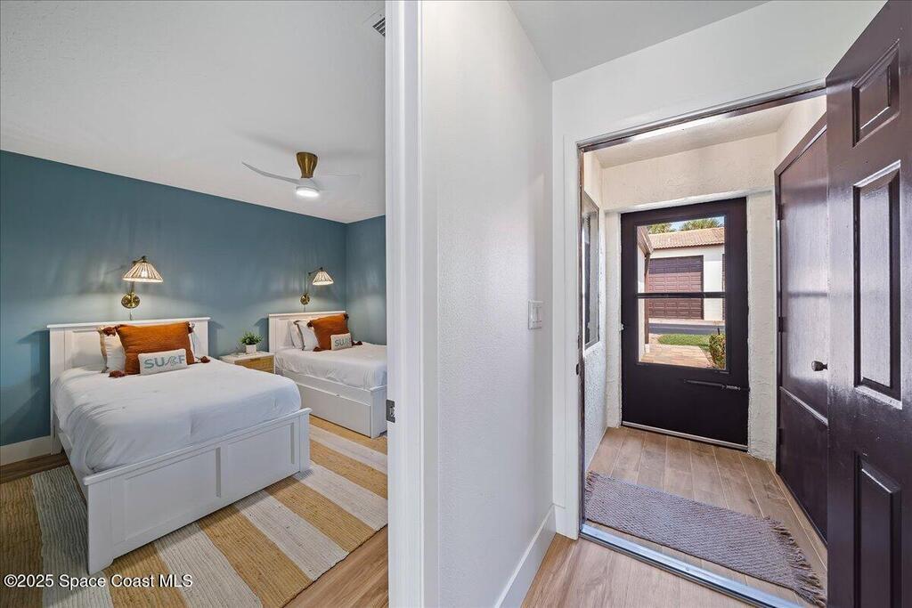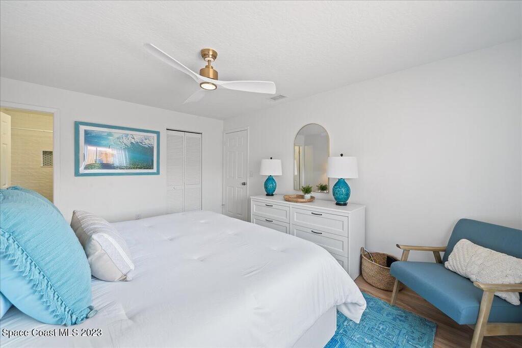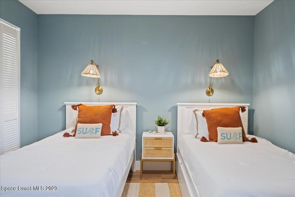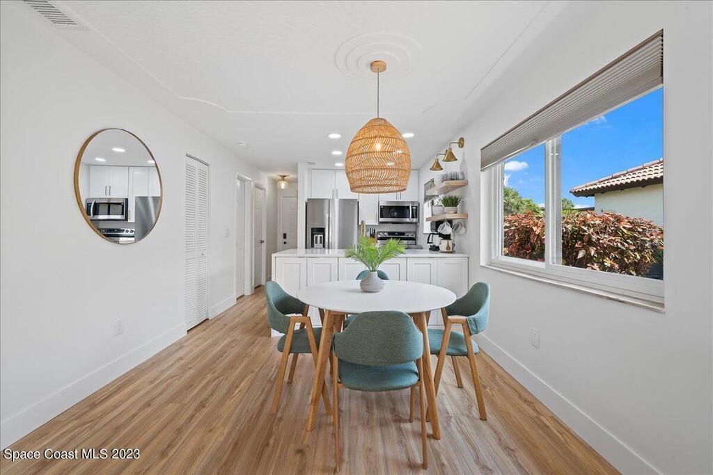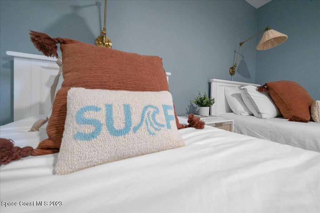 Enjoy true resort-style living in this fully furnished, remodeled beach home in the gated community of Beach Woods. This home was thoughtfully designed as a comfortable and peaceful beach retreat. It is located in the best spot in the neighborhood, just steps from the community pool. Full remodel was completed in December 2022 when the home was reconfigured into an open floorplan with brand new kitchen, bathrooms, flooring, fixtures, and appliances. New hurricane impact windows 2025. The primary suite is outfitted with a king-sized bed and oversized walk-in closet. The secondary bedroom has two twin beds with a third trundle stowed below. Rent includes all utilities, cable/internet. Adventurous visitors are welcome to use the bicycles and kayaks stored in the single car garage. The upscale amenities include a river pier
