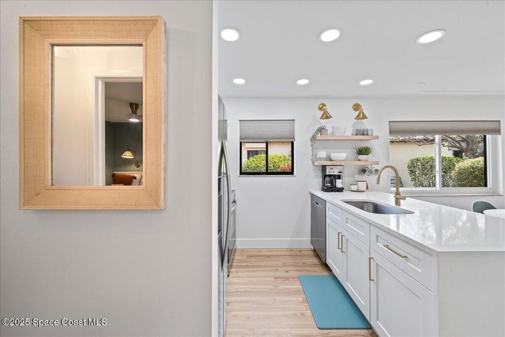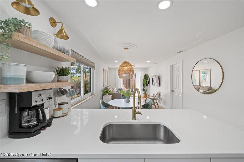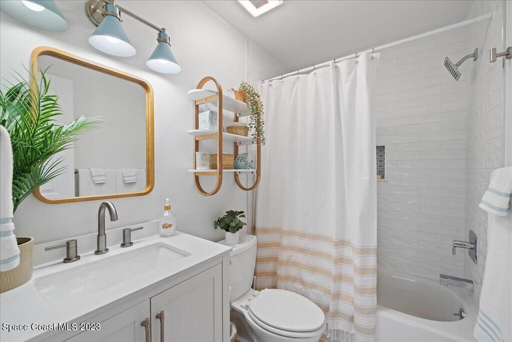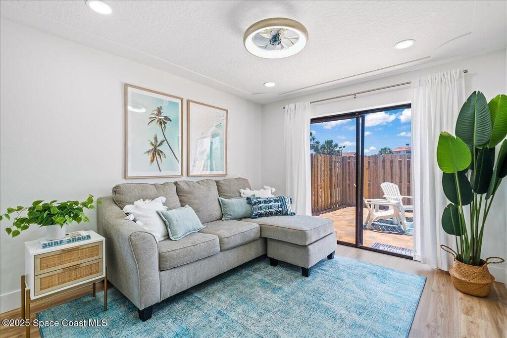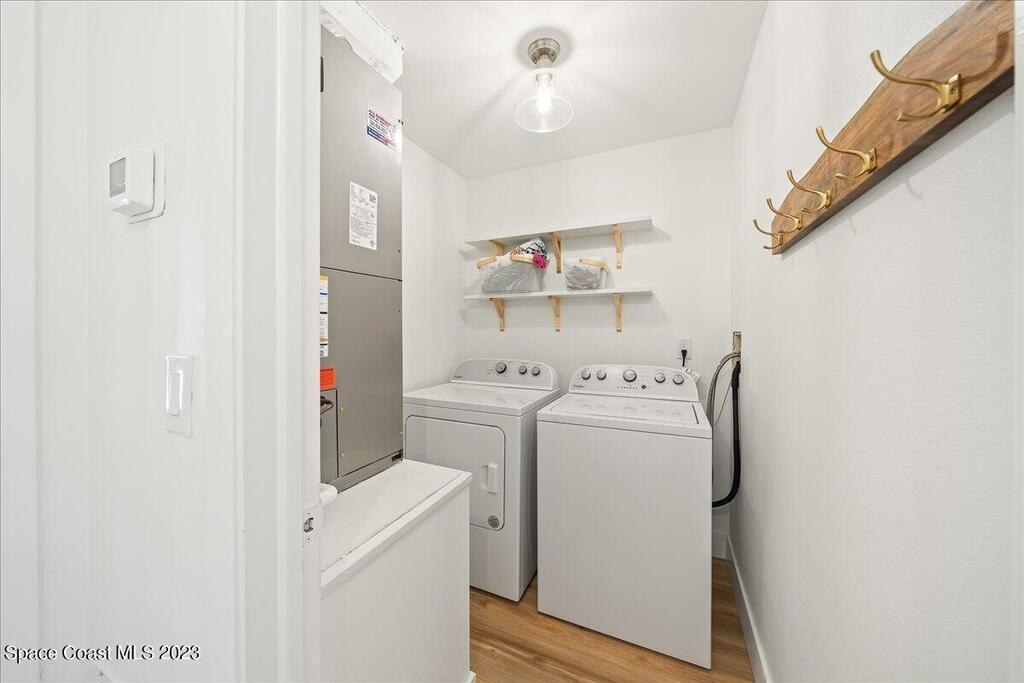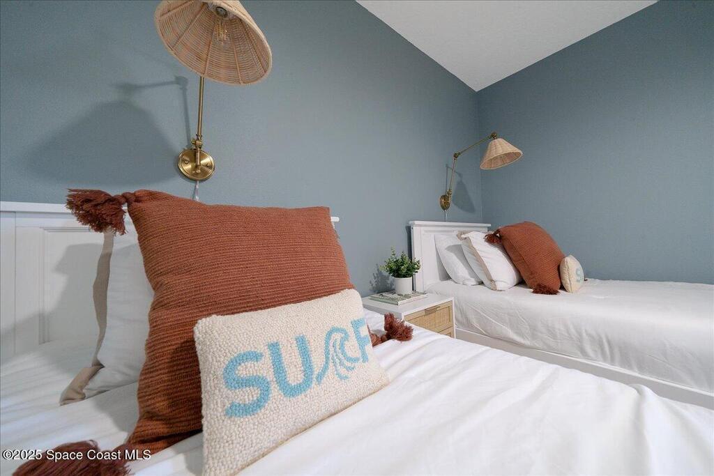 Enjoy true resort-style living in this fully furnished, remodeled beach home in the gated community of Beach Woods. This home was thoughtfully designed as a comfortable and peaceful beach retreat. It is located in the best spot in the neighborhood, just steps from the community pool. Full remodel was completed in December 2022 when the home was reconfigured into an open floorplan with brand new kitchen, bathrooms, flooring, fixtures, and appliances. New hurricane impact windows 2025. The primary suite is outfitted with a king-sized bed and oversized walk-in closet. The secondary bedroom has two twin beds with a third trundle stowed below. Rent includes all utilities, cable/internet. Adventurous visitors are welcome to use the bicycles and kayaks stored in the single car garage. The upscale amenities include a river pier