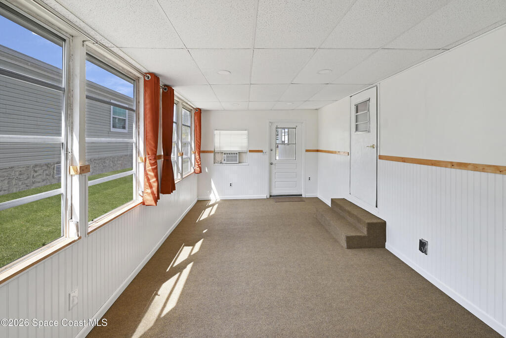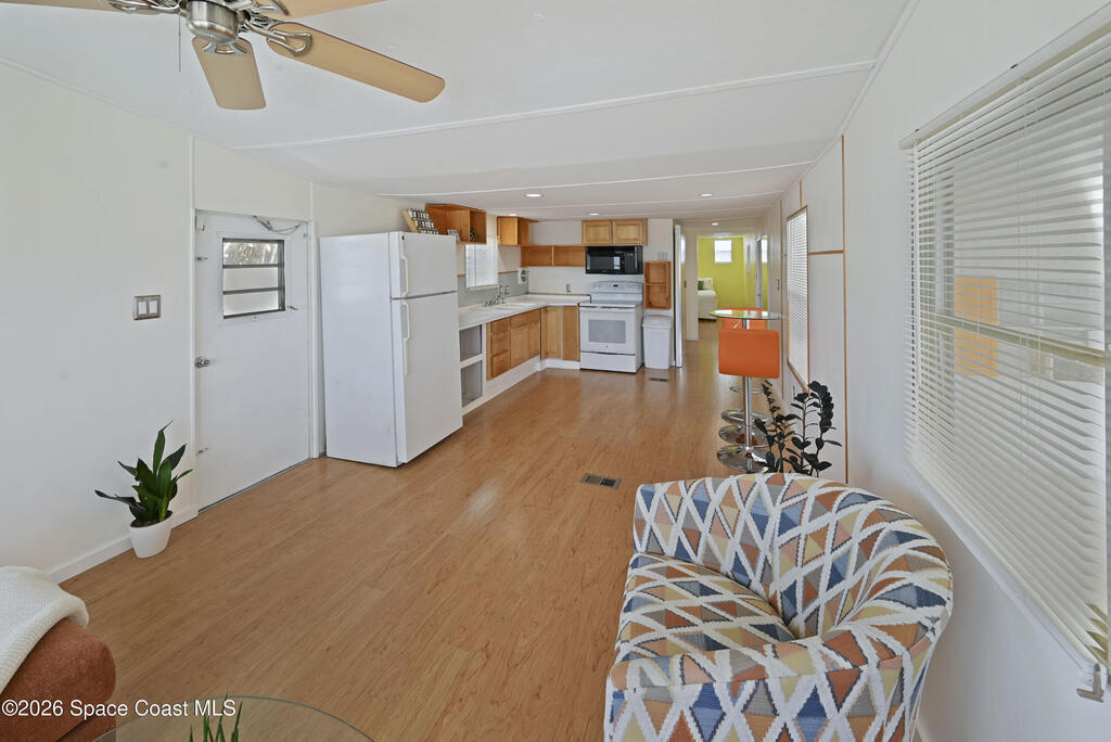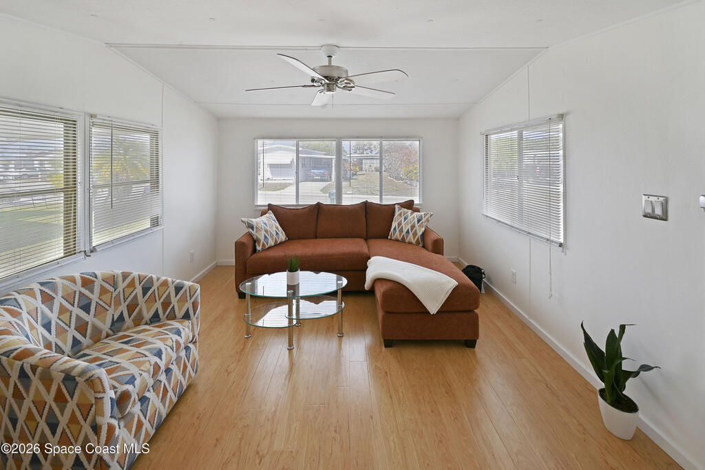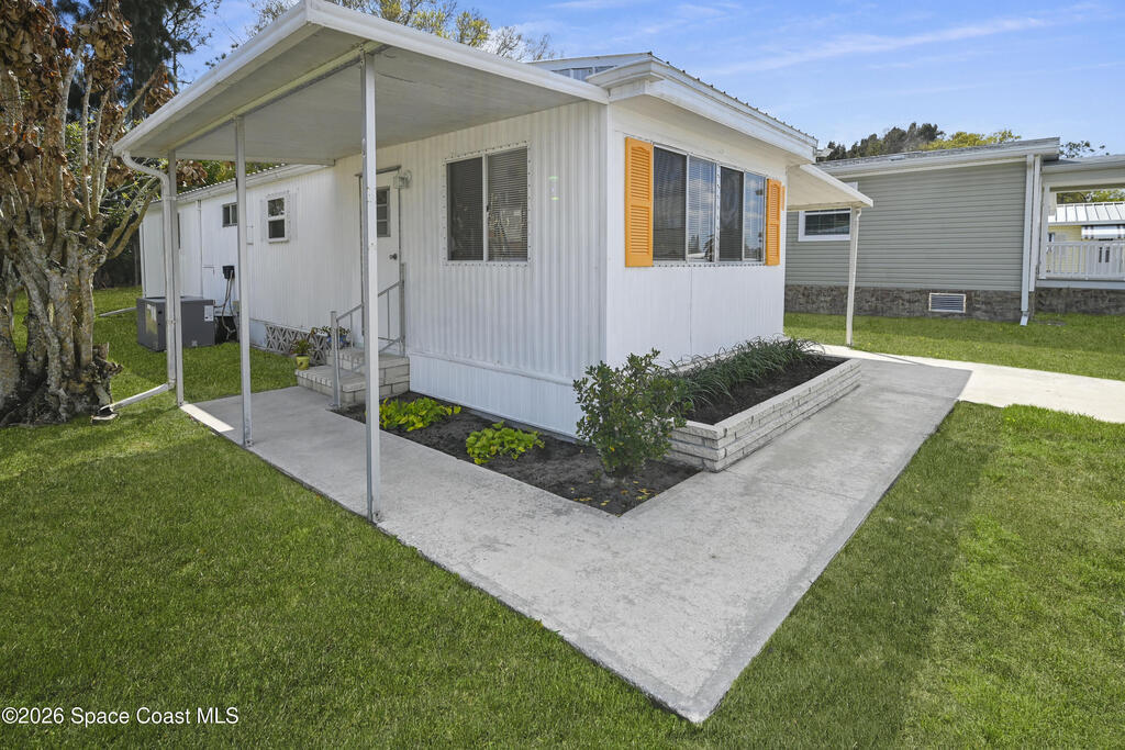 Stunning updated, furnished home in Holiday Park! Newer upgrades include a metal roof, water heater, updated bathroom, some new windows, subfloor, fresh paint, and new flooring. Property also features gutters and downspouts. The spacious living area features a vaulted ceiling and an open, inviting floor plan. The beautifully remodeled bathroom offers a rainfall showerhead, handheld wand, new toilet, vanity, and a stylish floating door. The large bedroom provides comfortable space to unwind. Home also has recessed lighting. Enjoy the Florida room with carpet and window A/C, plus a rear porch with large pavers and a storage shed, a welcoming covered front porch, and a long carport. The community offers two pools (heated and unheated), pool tables, darts, basketball, bocce, shuffleboard, a recreation hall, library, and more. Conveniently located near shopping, dining, entertainment, and quick access to I-95. Move-in ready and waiting for you!