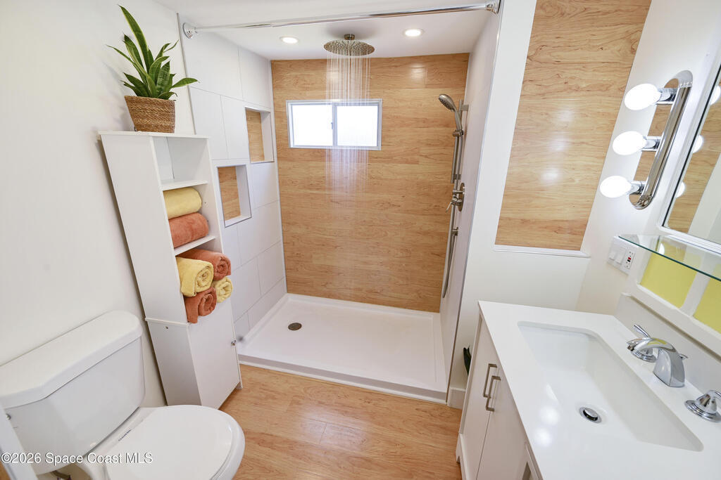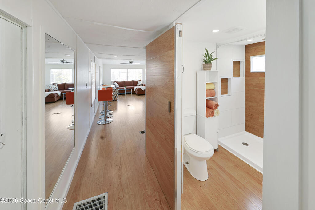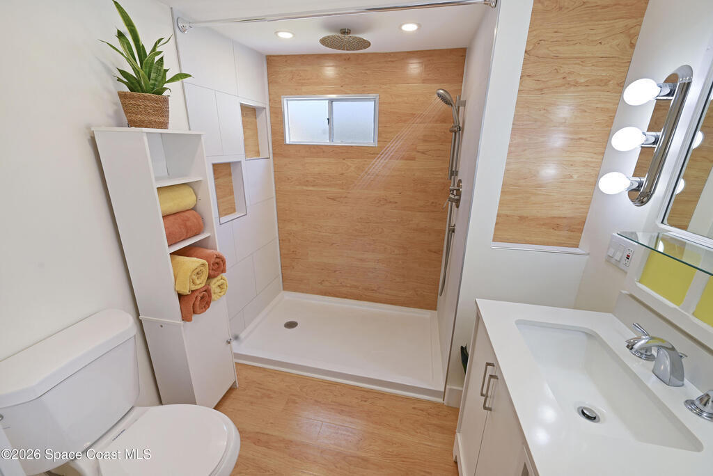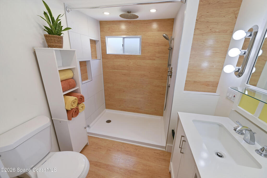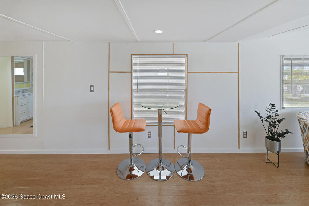 Stunning updated, furnished home in Holiday Park! Newer upgrades include a metal roof, water heater, updated bathroom, some new windows, subfloor, fresh paint, and new flooring. Property also features gutters and downspouts. The spacious living area features a vaulted ceiling and an open, inviting floor plan. The beautifully remodeled bathroom offers a rainfall showerhead, handheld wand, new toilet, vanity, and a stylish floating door. The large bedroom provides comfortable space to unwind. Home also has recessed lighting. Enjoy the Florida room with carpet and window A/C, plus a rear porch with large pavers and a storage shed, a welcoming covered front porch, and a long carport. The community offers two pools (heated and unheated), pool tables, darts, basketball, bocce, shuffleboard, a recreation hall, library, and more. Conveniently located near shopping, dining, entertainment, and quick access to I-95. Move-in ready and waiting for you!