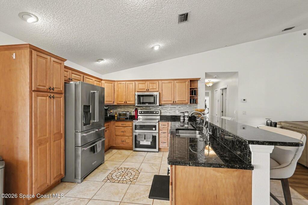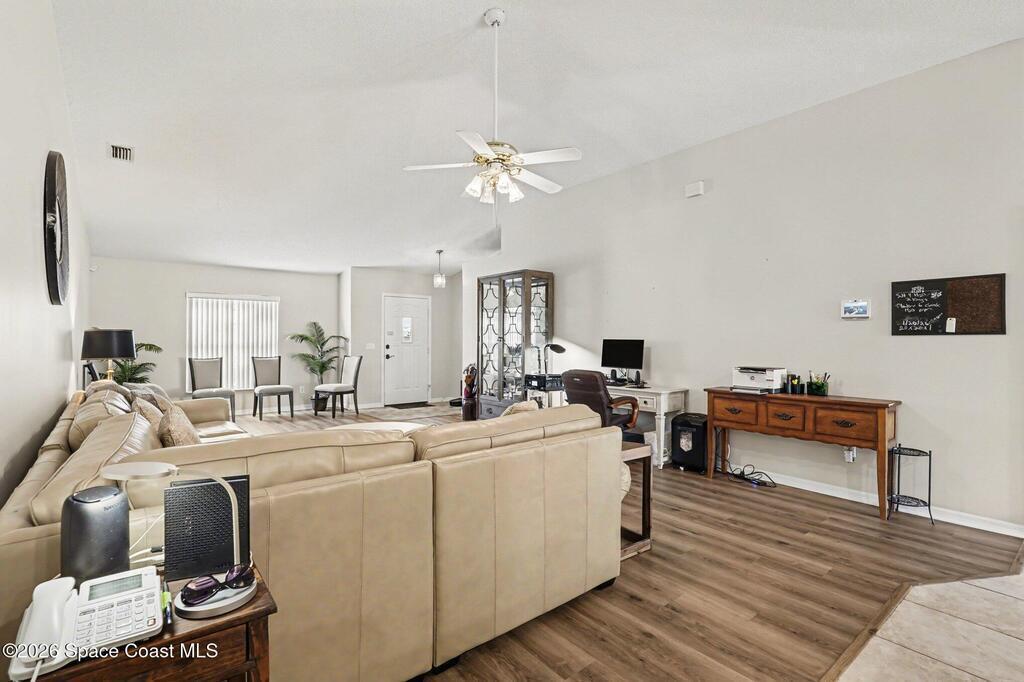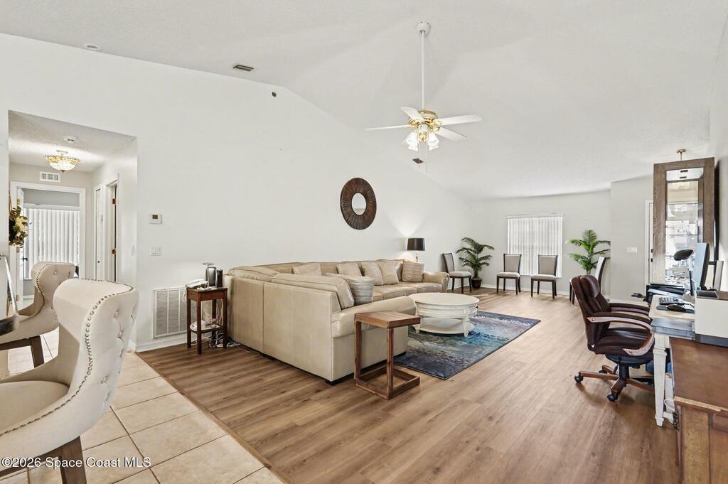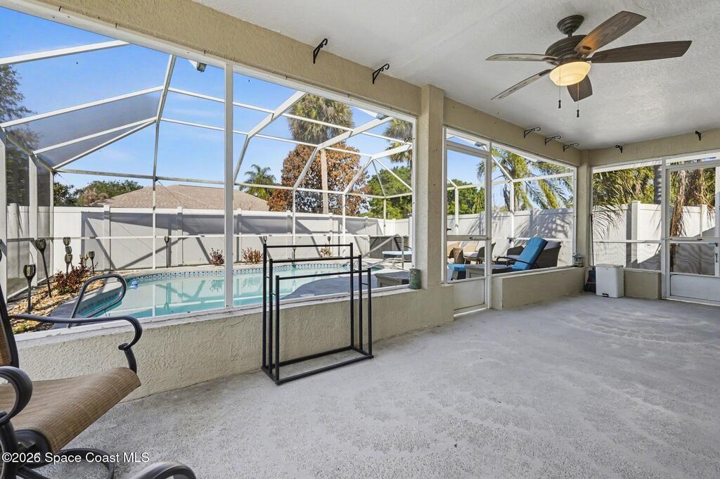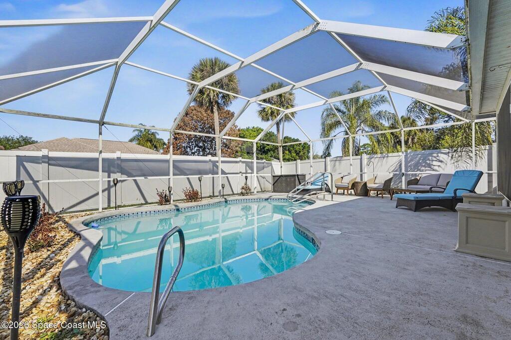 Move-in ready 3BR/2BA solar pool home in Palm Bay with extensive upgrades and energy-efficient features. Open-concept floor plan with vaulted ceilings and abundant natural light. Spacious living and dining areas ideal for entertaining. Split-bedroom layout offers private primary suite with en-suite bath; two additional bedrooms share full hall bath.Major updates include new whole-home solar system (paid off), newer metal roof (2013), newer AC (2023), newer pool heater, newer pool pump, whole-home water filtration system, and granite countertops.Enclosed four-seasons room provides additional flexible living space overlooking the screened pool oasis. Conveniently located near river and beach access, shopping, dining, and Patrick Space Force Base.Energy efficient, well maintained, and move-in ready.
