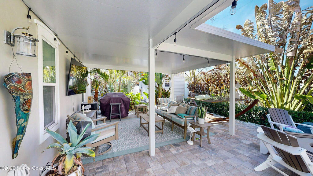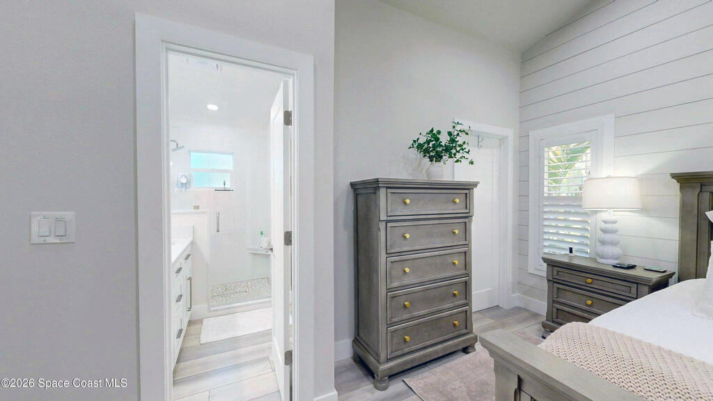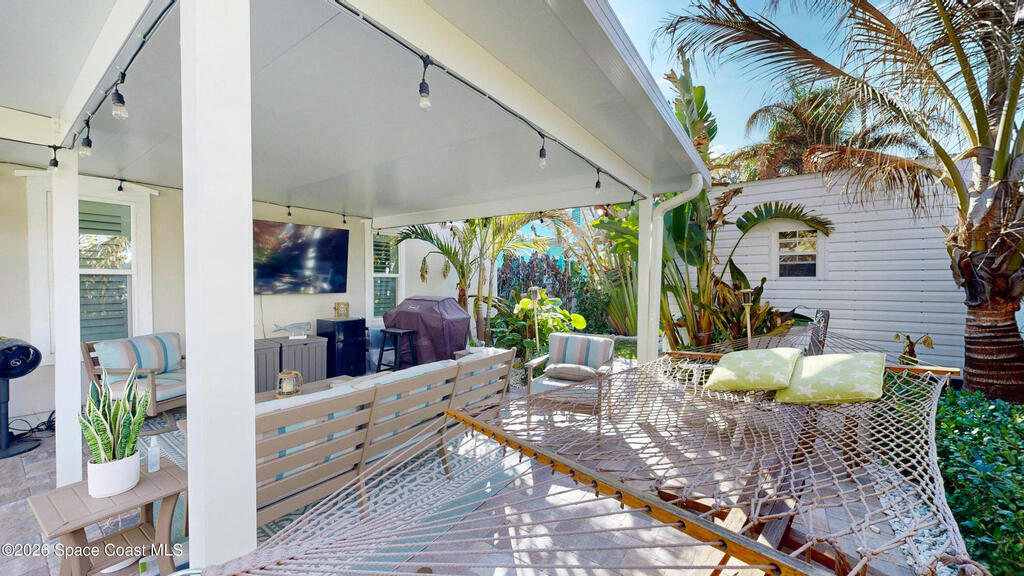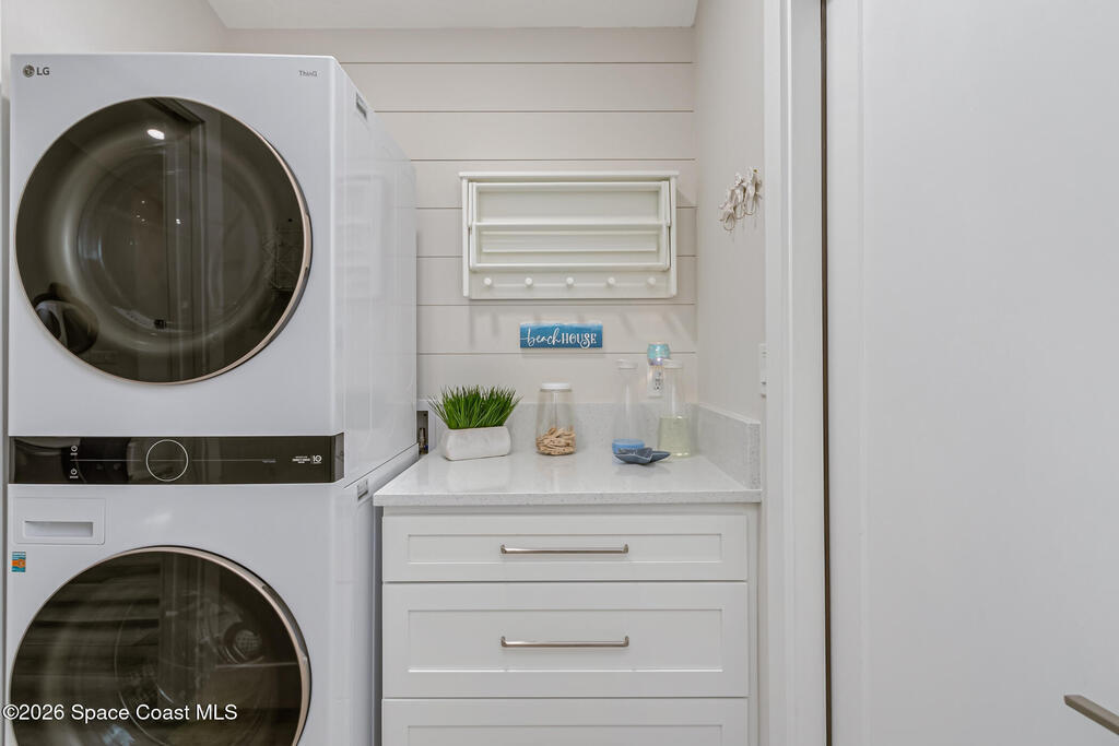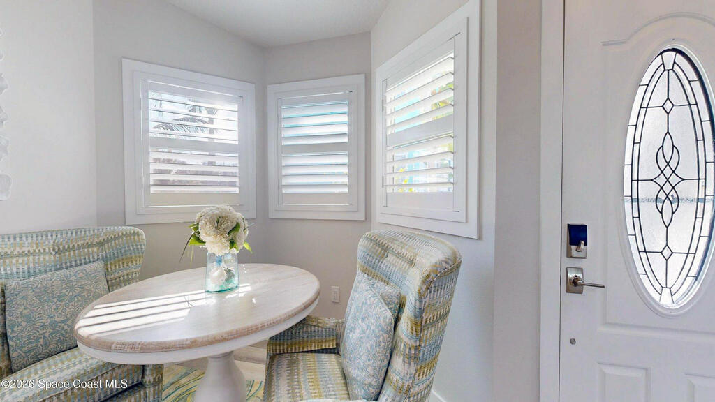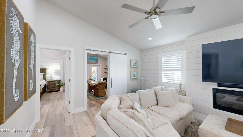 Beach Retreat!Experience this completely transformed coastal sanctuary showcasing luxury upgrades throughout and designed for effortless seaside living on Florida's renowned Space Coast.This move-in-ready residence has been extensively remodeled with high-end finishes, modern systems, and elevated designer details inside and out.Fully remodeled interior (2024) featuring wall-to-wall and ceiling paint, new double pane windows, new exterior finish with sheathing, stucco, and trim, LVP flooring throughout, custom shiplap feature walls, and a stunning custom entertainment wall with recessed TV cutout and flush-mounted electric fireplace, plus new interior doors, hardware, trim, barn doors, and designer lighting.The chef-inspired kitchen shines with refinished solid wood cabinetry with new pulls, sparkle white counters, stylish backsplash tile, remodeled island, new sink and faucet, full appliance package, and elegant pendant lighting.Bathrooms have been fully remodeled with new vanities, showers, tub, tile, mirro