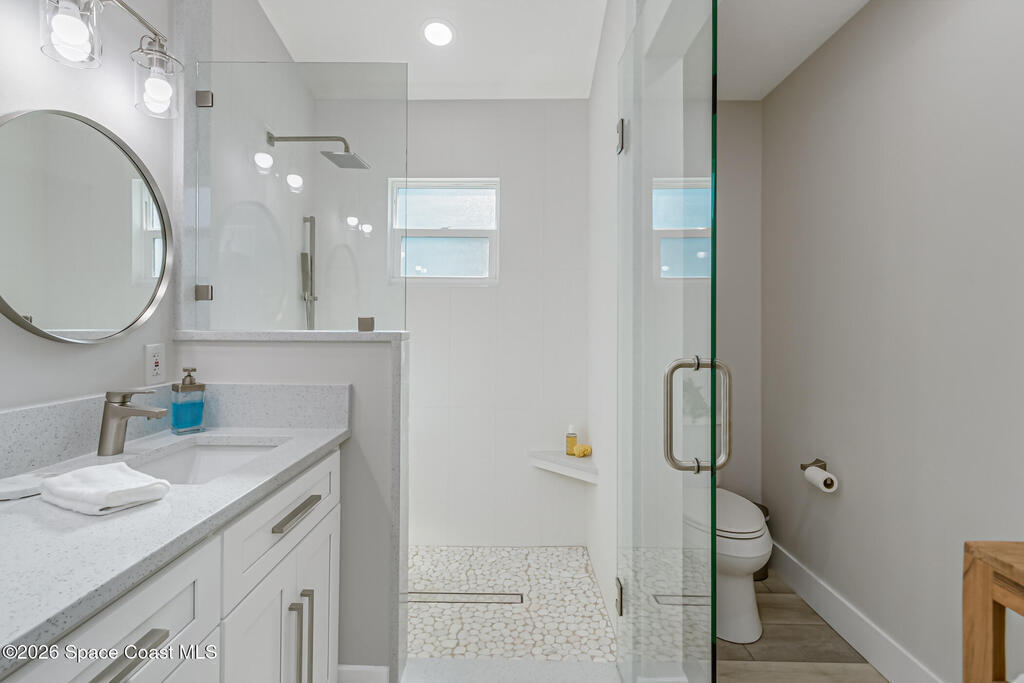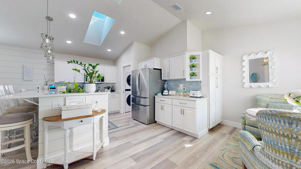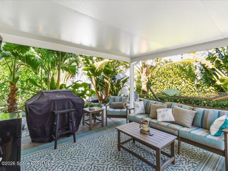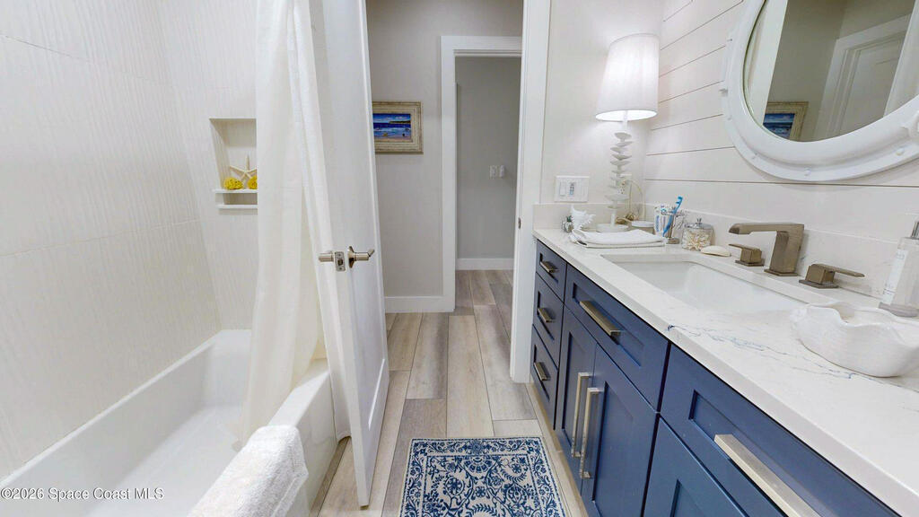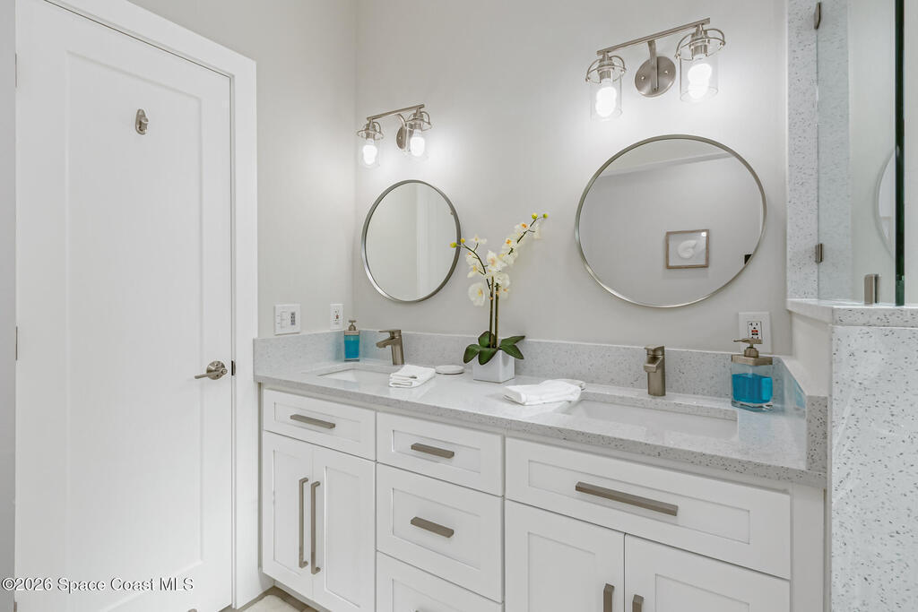 Beach Retreat!Experience this completely transformed coastal sanctuary showcasing luxury upgrades throughout and designed for effortless seaside living on Florida's renowned Space Coast.This move-in-ready residence has been extensively remodeled with high-end finishes, modern systems, and elevated designer details inside and out.Fully remodeled interior (2024) featuring wall-to-wall and ceiling paint, new double pane windows, new exterior finish with sheathing, stucco, and trim, LVP flooring throughout, custom shiplap feature walls, and a stunning custom entertainment wall with recessed TV cutout and flush-mounted electric fireplace, plus new interior doors, hardware, trim, barn doors, and designer lighting.The chef-inspired kitchen shines with refinished solid wood cabinetry with new pulls, sparkle white counters, stylish backsplash tile, remodeled island, new sink and faucet, full appliance package, and elegant pendant lighting.Bathrooms have been fully remodeled with new vanities, showers, tub, tile, mirro