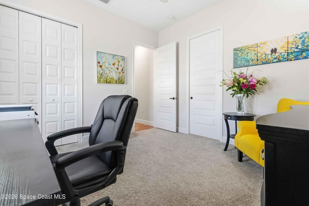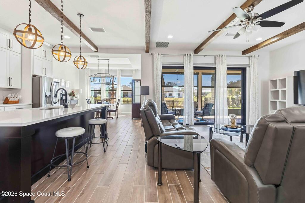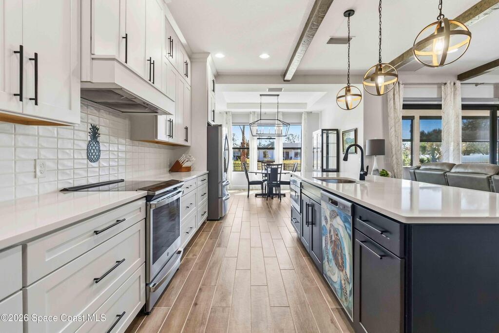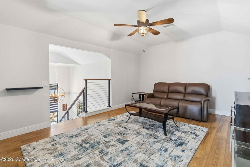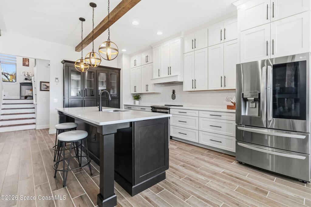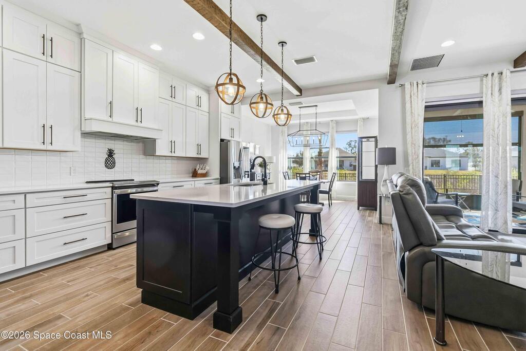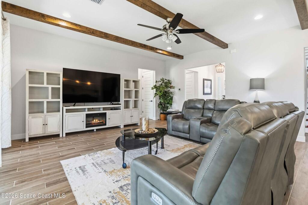 Why wait to build? Like-new 4 bed/3.5 bath home built in 2022 w/3-car garage & thoughtful, flexible layout. The quartz kitchen is the heart of the home & boasts stainless appliances, tiled backsplash, large island, spacious walk-in pantry & opens to a gorgeous great room w/tall ceilings & wood beams. Enjoy relaxing or entertaining from your screened paver patio overlooking the fully fenced backyard. Downstairs, you'll find the owner's suite, which offers a large walk-in closet & spa-style private bath w/tiled walk-in shower w/dual shower heads & double sinks. Bedrooms 2 & 3 share a Jack-and-Jill bath. Also downstairs, is a half bath for guests. Upstairs, features a large loft offering the perfect flex space, plus a 4th bedroom, full bath & large storage closet. Indoor laundry room w/ample storage. Irrigation on well. 2nd bay garage is air conditioned. Just 20 min to Kennedy Space Center, Blue Origin & SpaceX, 30 min to beach & 40 min to Orlando airport & area attractions!
