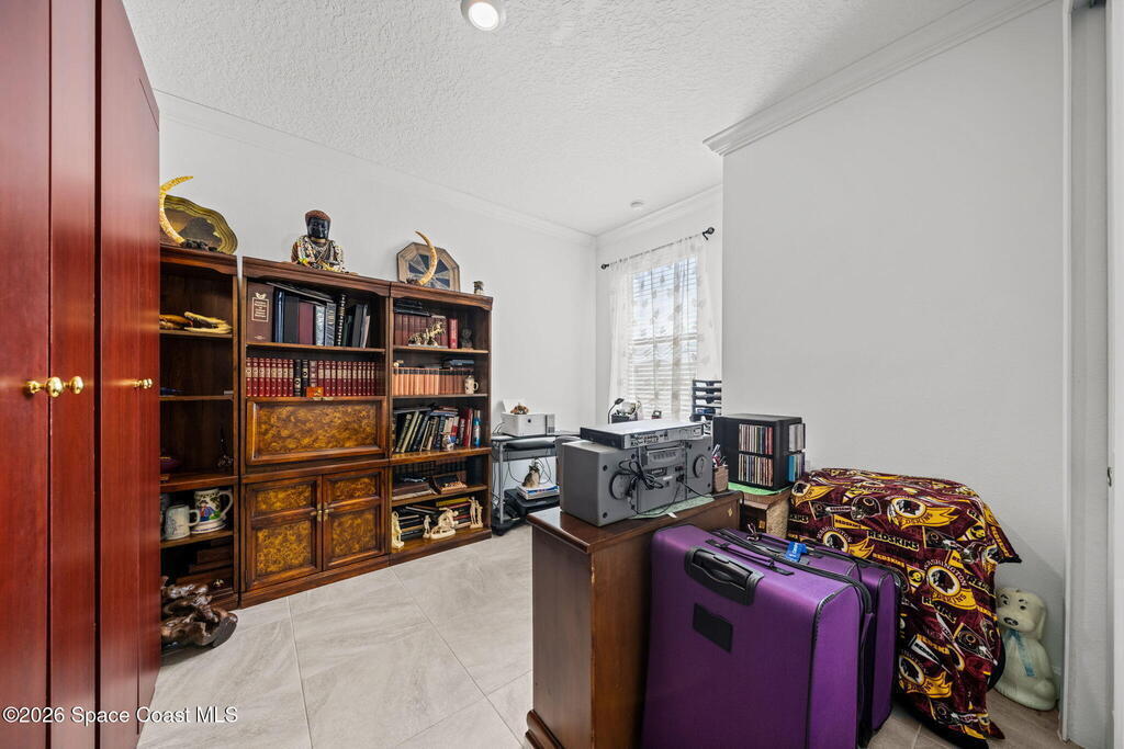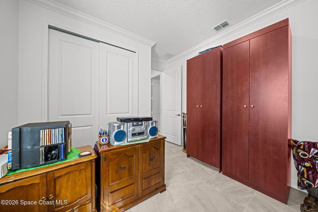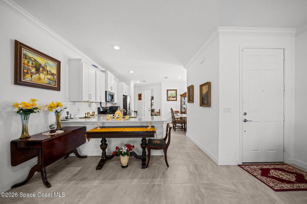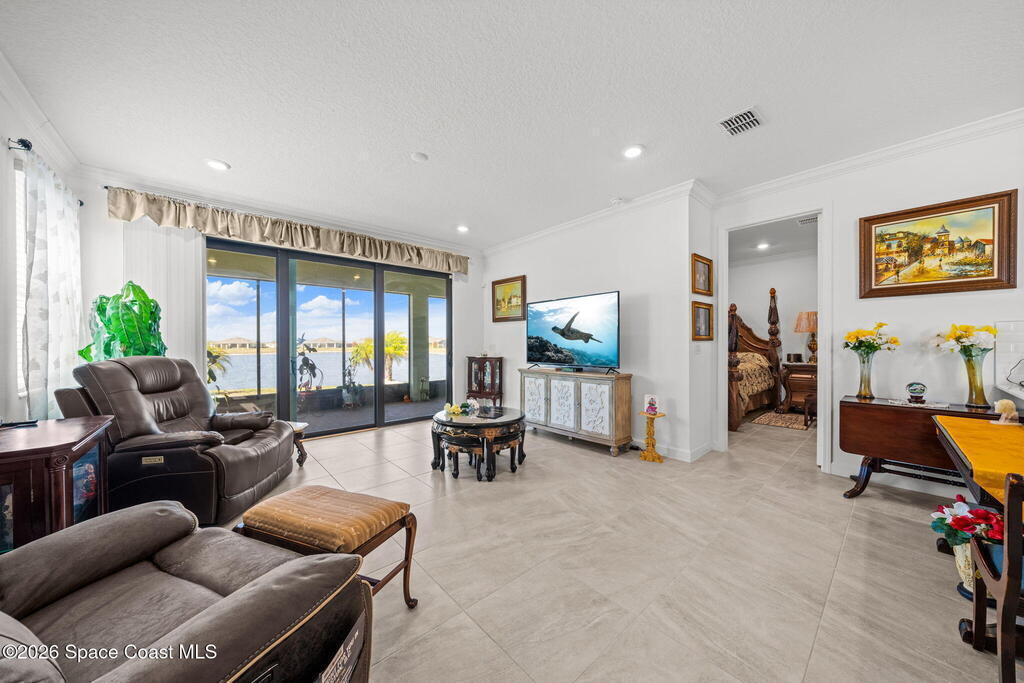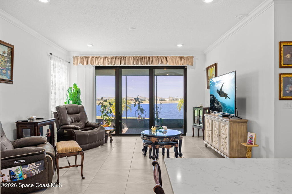 Welcome to maintenance-free luxury living in the highly sought-after 55+ community of Bridgewater at Viera with one of the best lake views in the community!! This beautifully upgraded home offers 2 bedrooms and 2 bathrooms, plus a versatile flex room, perfect for a 3rd bedroom, home office, or hobby space. Inside, you'll find upgraded 24-inch tile flowing throughout the entire home, complemented by crown molding and recessed lighting for a polished, modern feel. The kitchen is thoughtfully designed with quartz countertops, white cabinetry, and stainless steel appliances, creating a bright and functional space for everyday living and entertaining. The spacious primary en-suite features dual vanities, a walk-in closet, and an upgraded glass-enclosed walk-in shower. Step outside to your extended porch overlooking an amazing large, peaceful lake, an ideal setting for morning coffee or evening relaxation. Also featured are hurricane protection shutters for added safety and peace of mind.
