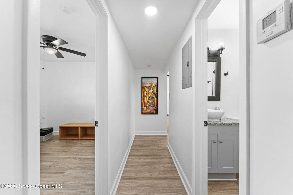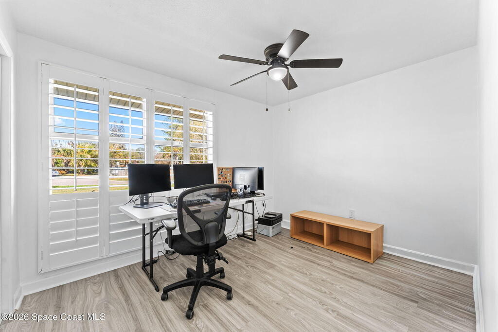 Corner lot confidence meets smart, stylish living. This 3-bedroom, 2-bath beauty delivers the updates buyers crave and the extras they didn't know they needed. Sleek vinyl flooring sets the tone, while plantation shutters add timeless character. The flex space? Home office, gym, playroom - you decide. Entertain with ease thanks to a dedicated wine cooler and seamless flow to the screened back porch - perfect for breezy Florida evenings. A single-car garage, manual storm shutters, smart doorbell, smart thermostat, and full security system bring peace of mind and modern convenience together under one roof. Located near top-rated schools, shopping, and dining, this home checks the practical boxes and the lifestyle ones too. Clean. Sharp. Move-in ready!