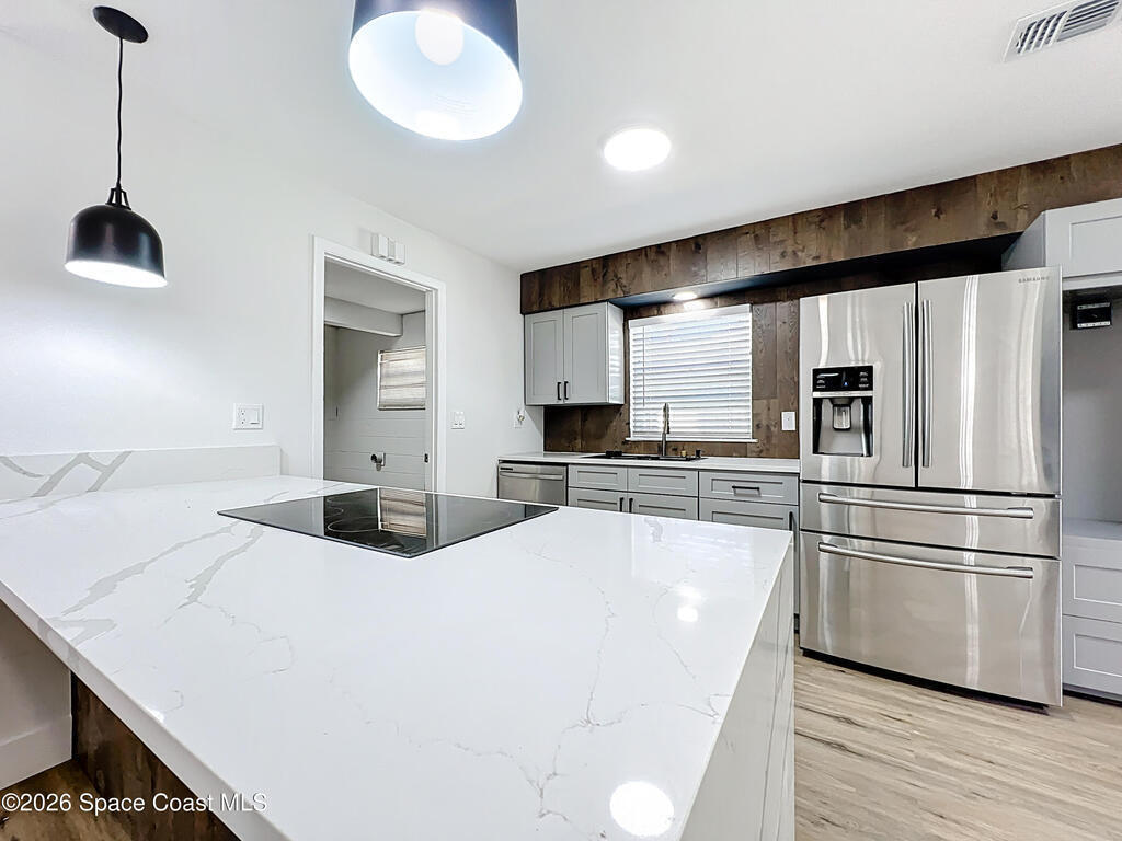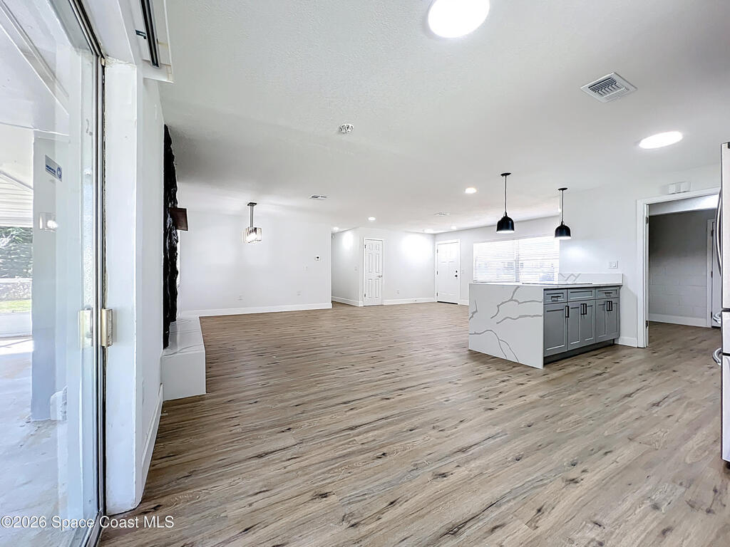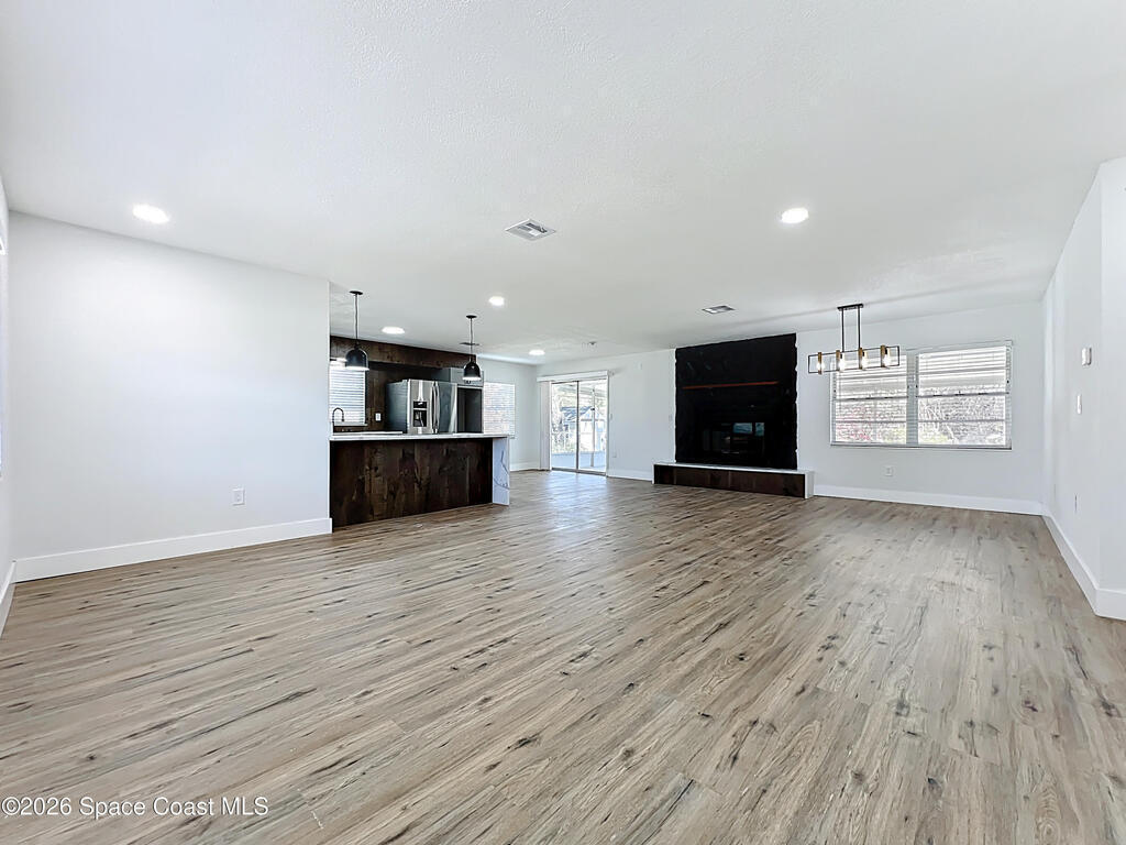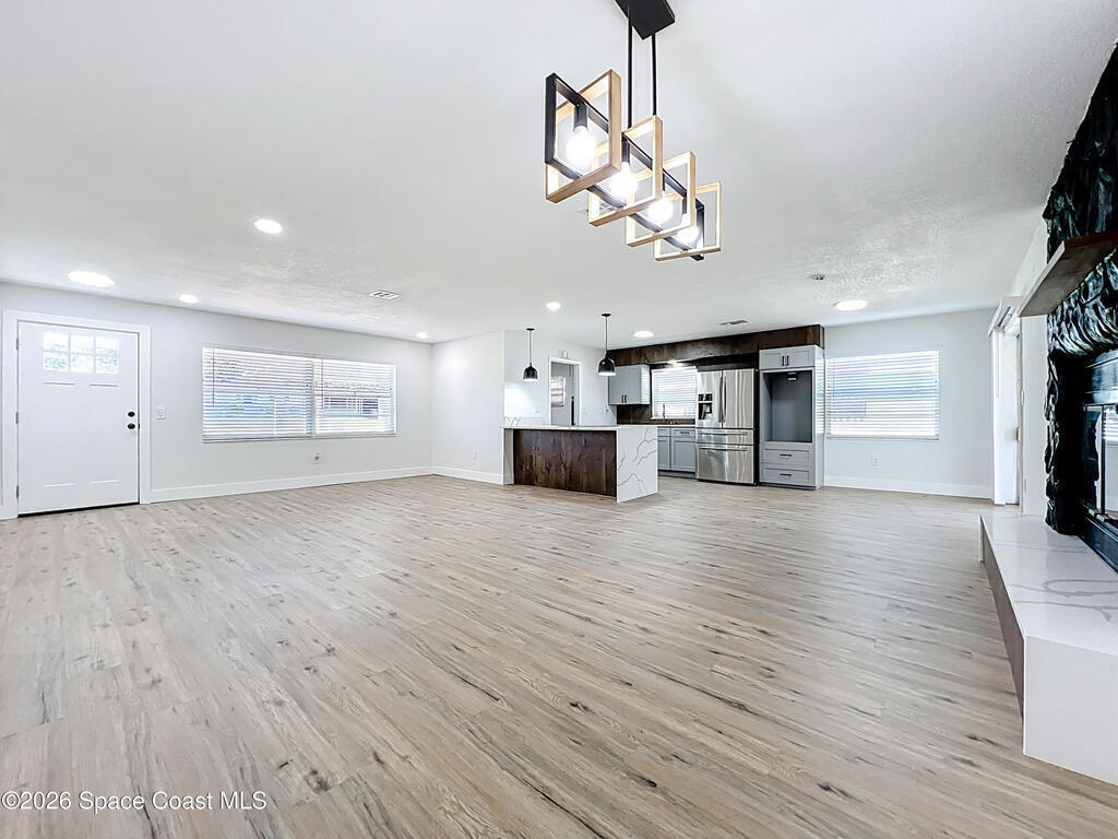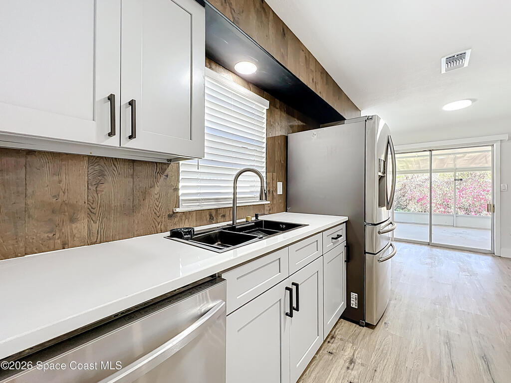 Fully renovated 4-bedroom, 2-bath home located in a quiet Titusville neighborhood on Florida's Space Coast. This move-in ready property features an open floorplan with modern white, black, and wood-tone finishes, brand-new cabinets, stainless steel appliances, and luxury vinyl flooring throughout. The spacious living area includes a cozy wood-burning fireplace, perfect for everyday living and entertaining. Enjoy added privacy with no rear neighbors and a screened-in porch ideal for relaxing outdoors. The backyard offers a storage shed and plenty of space to enjoy. A covered carport and extended driveway provide ample parking. Conveniently located just minutes from Kennedy Space Center, Port Canaveral, area beaches, parks, shopping, dining, and easy access to Orlando--perfect for first-time buyers seeking value and location.