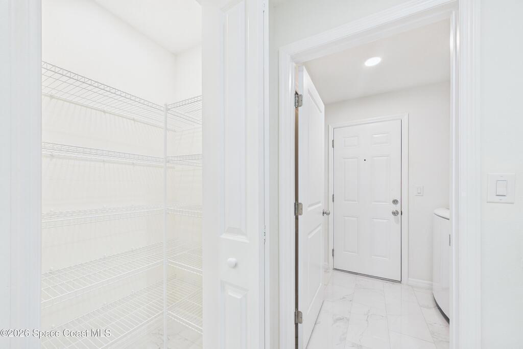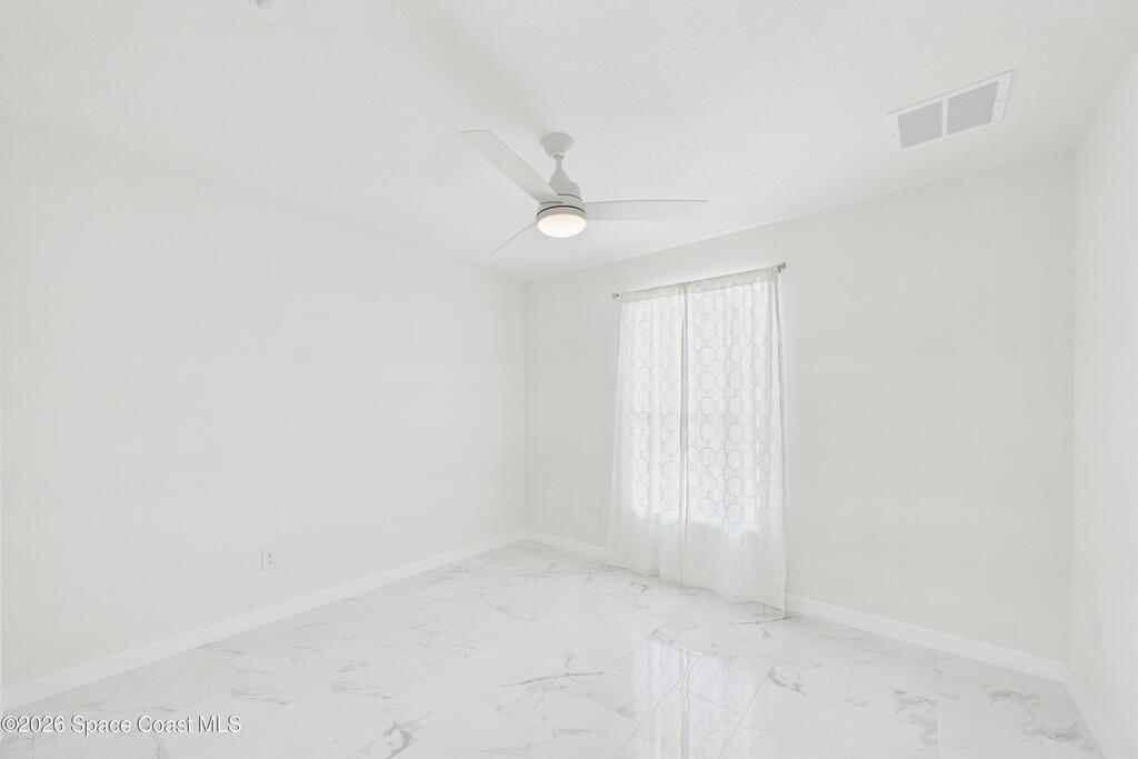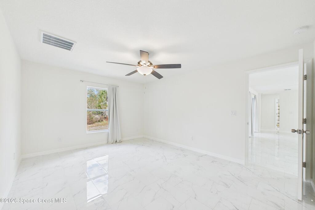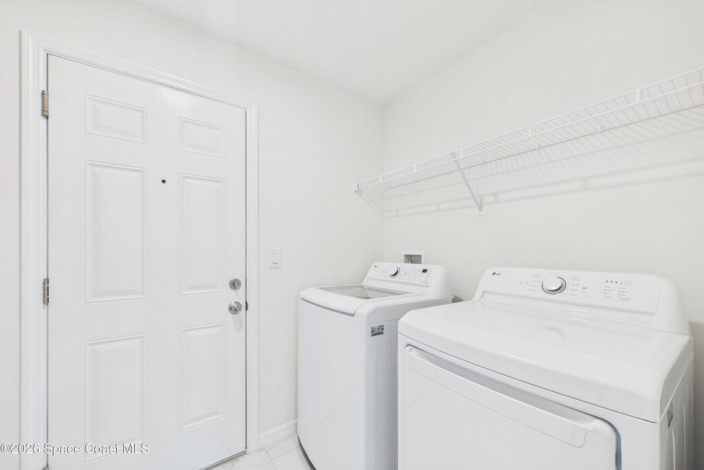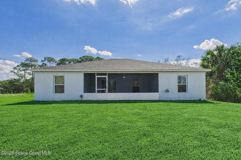 Welcome to your 2023 better-than-new dream home! Loaded with upgrades, this home features hurricane impact windows, a whole-house water filtration system, and a whole-house surge protection for peace of mind. The beautiful exterior makes a striking first impression, while the fully trussed & screened front and back porches expand your living space, perfect for entertaining or relaxing. The back porch measures an impressive 22' x 10.5', a rare find in new builds. Inside, quartz countertops shine against gorgeous marble-look tile flooring, absolutely NO carpet. Fully tiled showers elevate both bathrooms. The expansive primary ensuite is a true luxury retreat with a large walk-in shower, dual sinks, a private toilet closet, a generous walk-in closet, and its own linen closet. Just minutes from the new Publix near St. John Heritage, with no HOA, this home checks every box! Washer & dryer INCLUDED!Lawn digitally enhanced due to cold weather; grass will recover with seasonal warmth :)