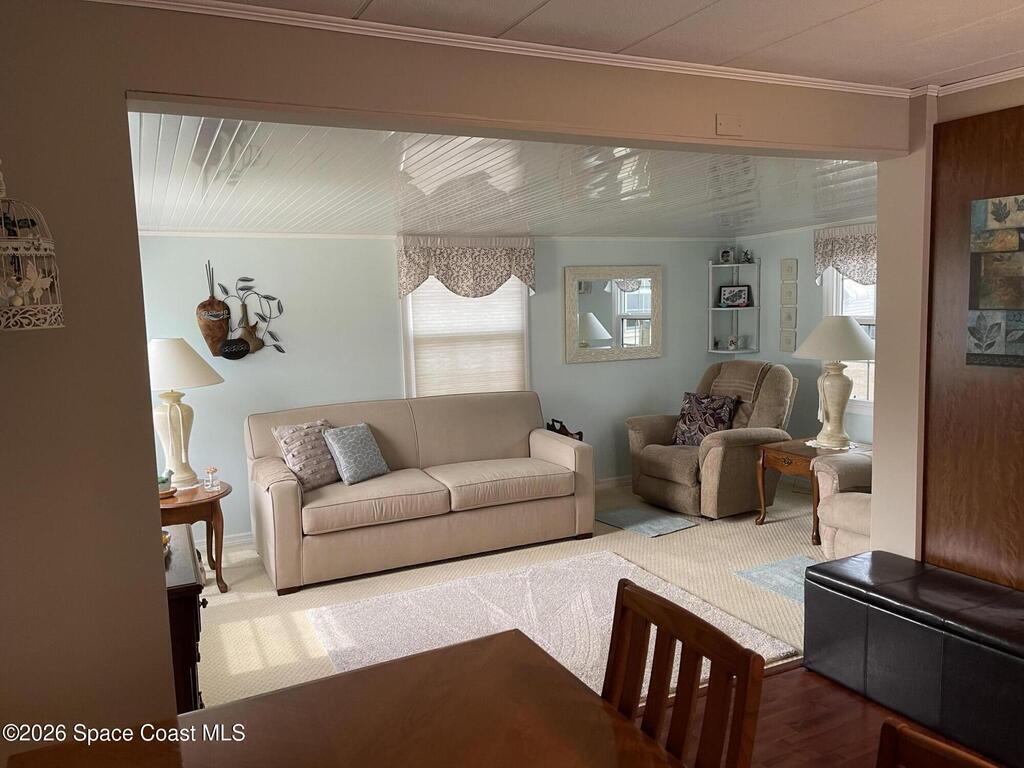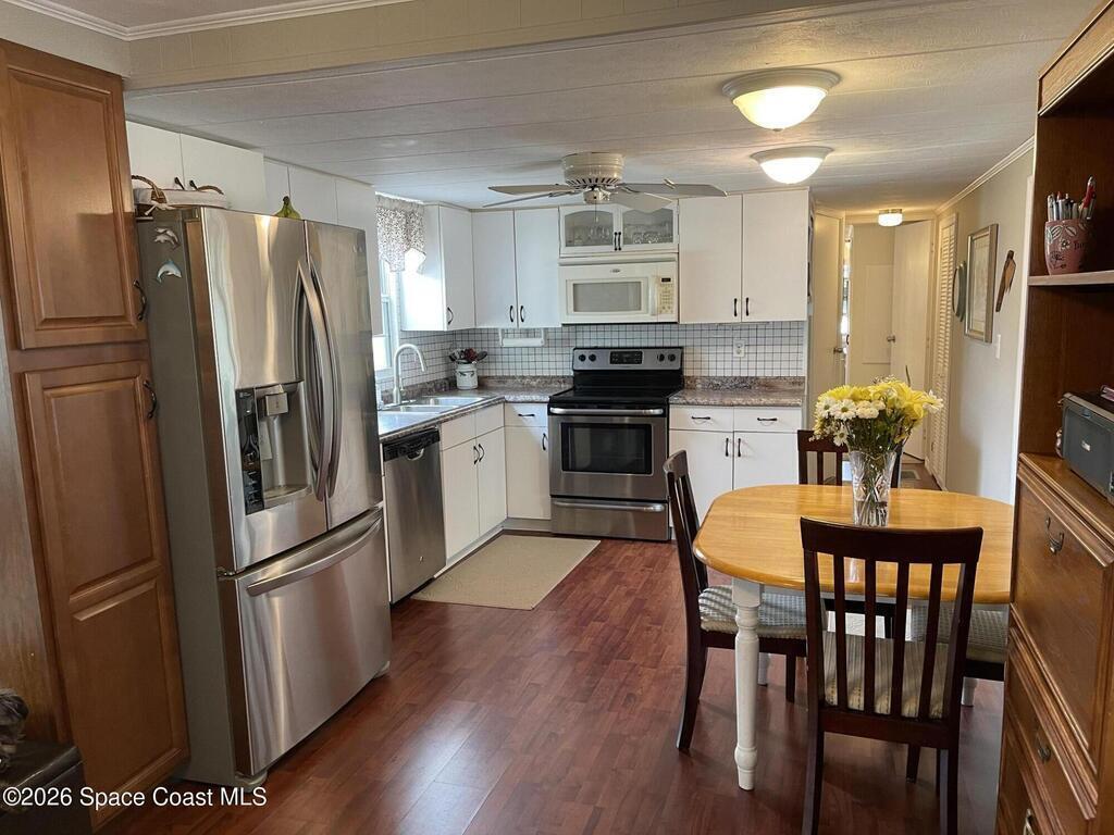 Lovely refreshed 2BR/2Bath in the 55+ Holiday Park neighborhood. This well kept home offers Stainless Steel appliances (brand new microwave not show in the photos), updated white cabinets, wood look flooring and step-in showers. HVAC replaced on 11/25, and the roof was resealed roughly two years ago. Many furnishings can remain for an easy transition. Utility room includes added storage plus a washer and dryer. Great location close to 1-95, shopping, restaurants and about 20 minutes to the beach. This is a gated adult community with 2 pools, lots of activities with NO LOT RENT. Agents should familiarize themselves with H.P. deed restrictions available at holidayparkfl.com