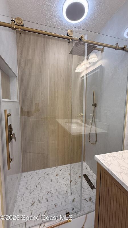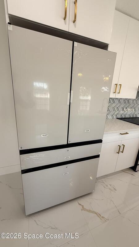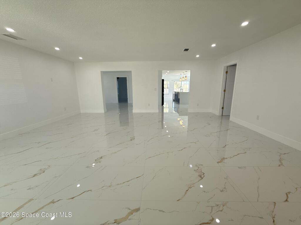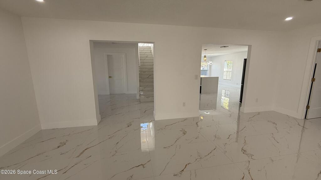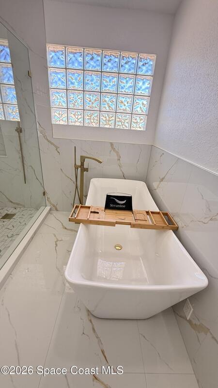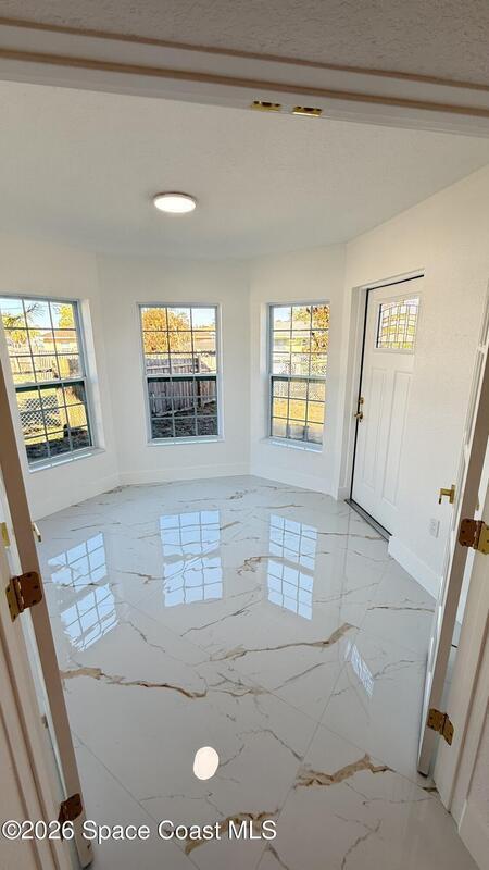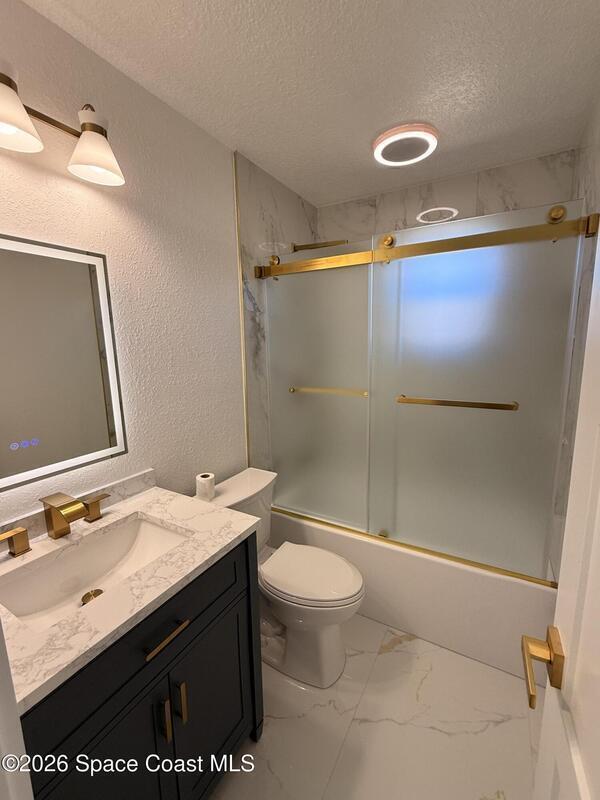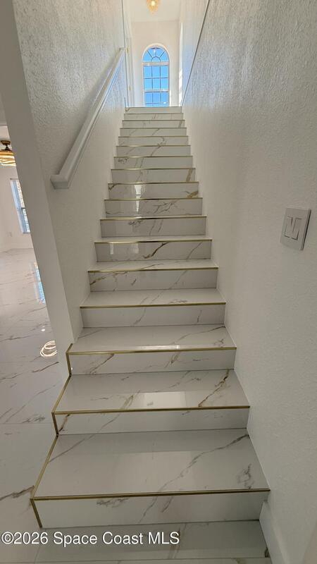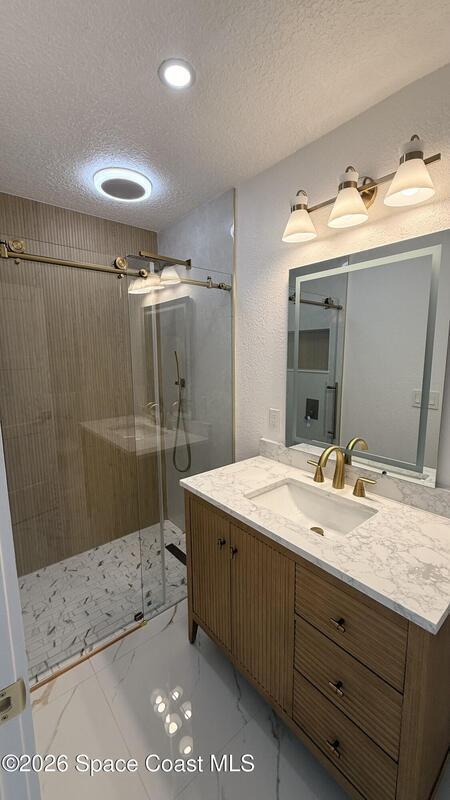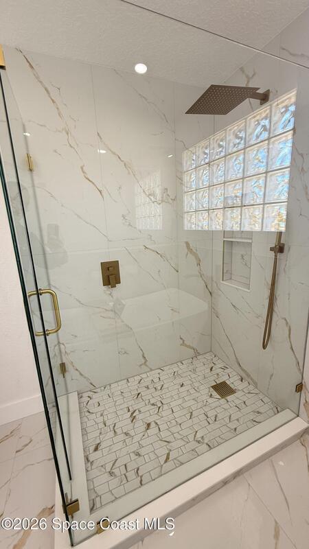 Completely renovated 4-bedroom home, including 2 master suites, in a prime location in Palm BayWelcome to this completely remodeled residence, designed with modern elegance and high-quality finishes throughout.From the moment you arrive, you'll notice the renovated facade, clean architectural lines, and inviting covered entrance. Inside, the home opens up to an open, spacious, and bright layout, with large-format porcelain tile flooring, recessed LED lighting, and designer accents.The stunning kitchen features:Spacious center island with quartz countertopsCustom two-tone cabinets with gold handlesModern chevron backsplashAppliances with glass topsContemporary pendant lightingWall-mounted range hoodThe master suite offers spa-inspired bathrooms with:Frameless glass shower enclosureDesigner tile backsplashGold accents and modern lightingThis home is move-in ready and ideal for multigenerational families seeking a comfortable, luxurious property well located