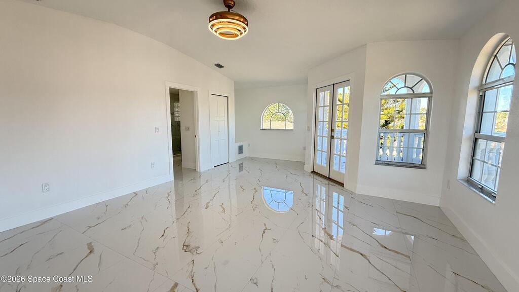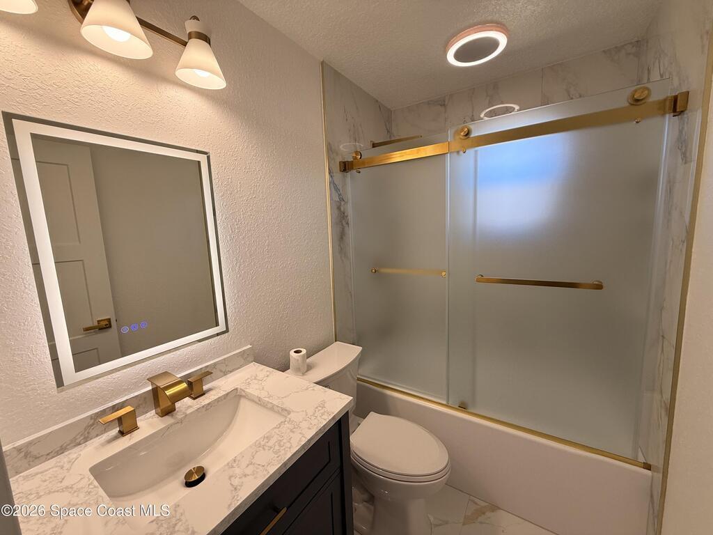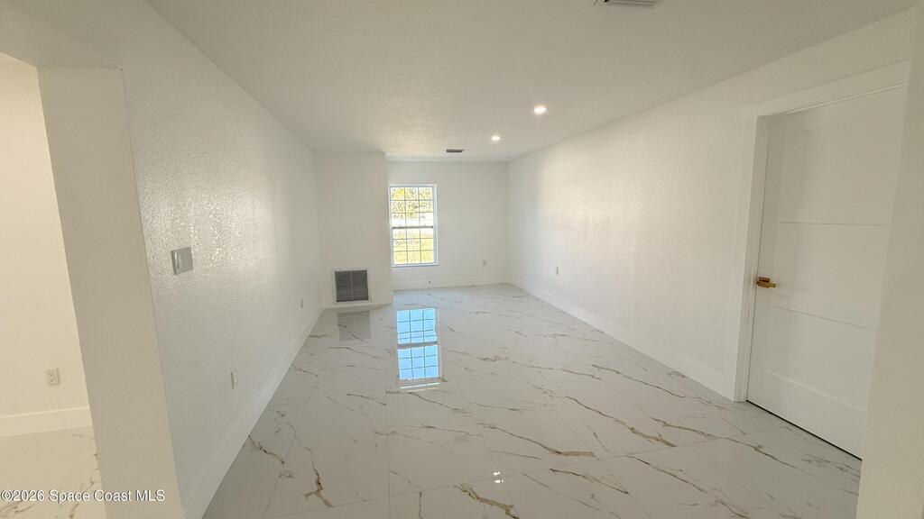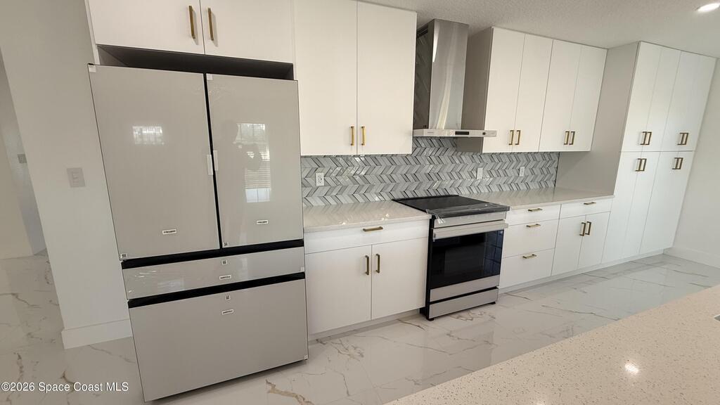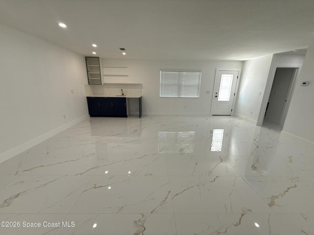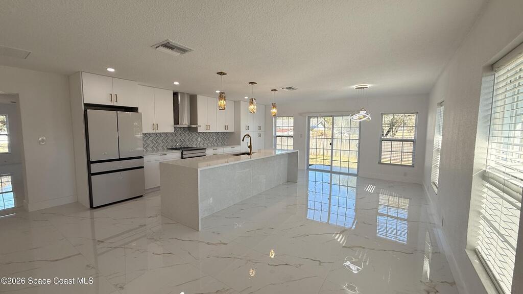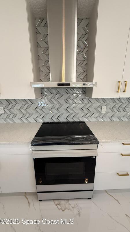 Completely renovated 4-bedroom home, including 2 master suites, in a prime location in Palm BayWelcome to this completely remodeled residence, designed with modern elegance and high-quality finishes throughout.From the moment you arrive, you'll notice the renovated facade, clean architectural lines, and inviting covered entrance. Inside, the home opens up to an open, spacious, and bright layout, with large-format porcelain tile flooring, recessed LED lighting, and designer accents.The stunning kitchen features:Spacious center island with quartz countertopsCustom two-tone cabinets with gold handlesModern chevron backsplashAppliances with glass topsContemporary pendant lightingWall-mounted range hoodThe master suite offers spa-inspired bathrooms with:Frameless glass shower enclosureDesigner tile backsplashGold accents and modern lightingThis home is move-in ready and ideal for multigenerational families seeking a comfortable, luxurious property well located